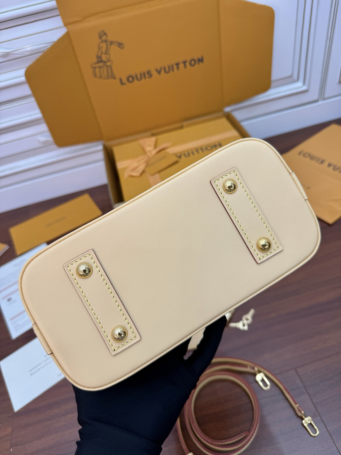 - Gold-color hardware