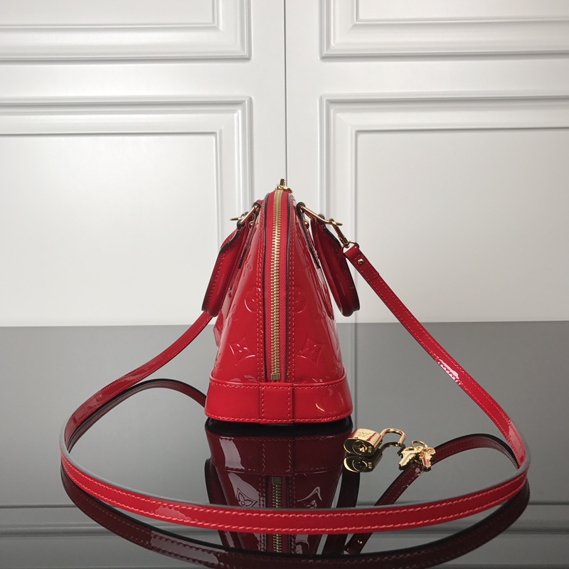 The Alma BB handbag traces its pedigree to the Art Deco original, introduced in 1934. Fashioned from Monogram Vernis embossed patent leather with signature details – engraved Louis Vuitton padlock, hand-stitched Toron handles, chic key bell – this glossy, compact bag brings a touch of glamour to any look. The detachable strap can be worn cross-body, for an on-trend allure. Detailed Features: 9.3 x 6.9 x 4.5 inches(Length x Height x Width) •Cerise Red •Monogram Vernis embossed patent calf leather •Smooth Vernis patent-calf trim •Microfiber lining •Gold-color hardware •Double zip closure •Padlock •Key bell •Inside flat pocket •4 protective metal bottom studs •Strap:Removable, not adjustable •Strap drop: 22.0 inches •Handle:Double