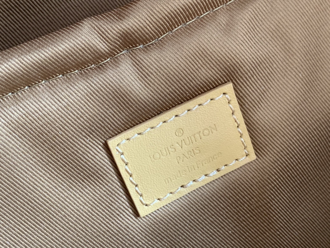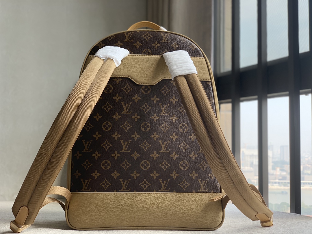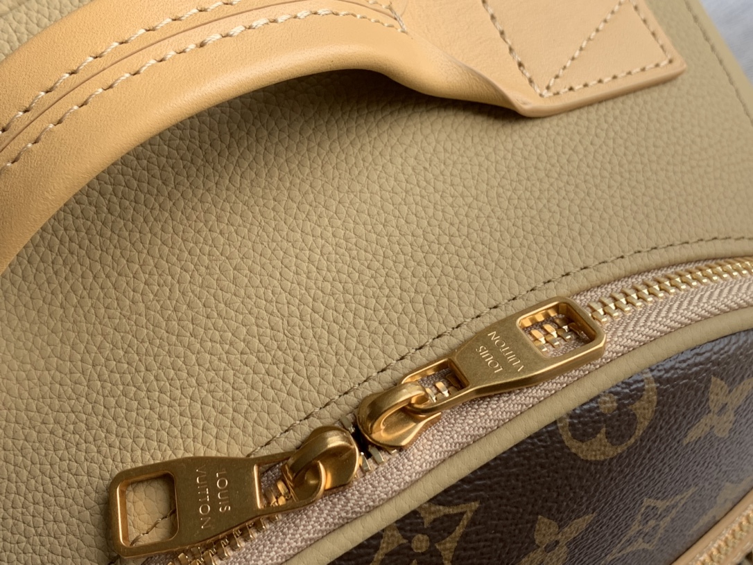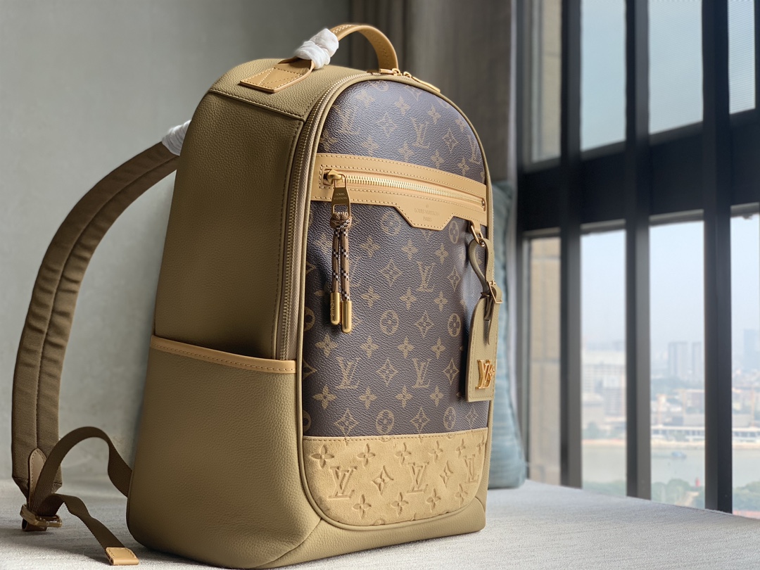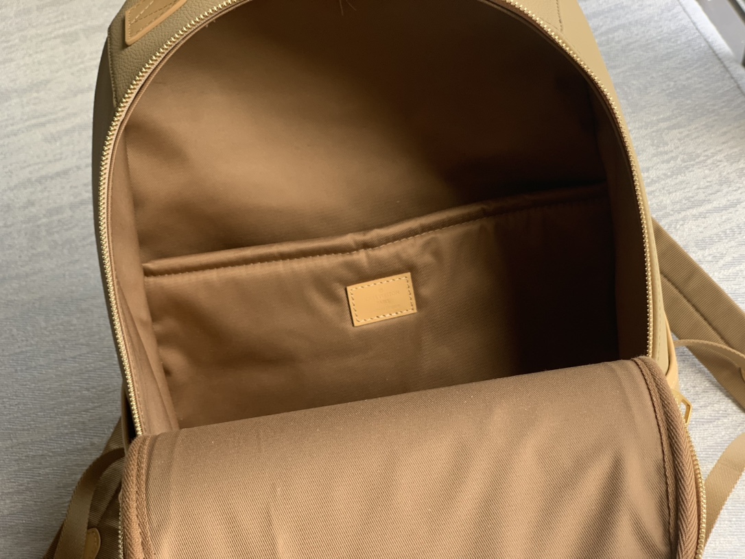 This Outdoor Backpack is made of Beige grain leather with embossed suede details and paired with Monogram canvas to create an elegant, sporty look. The bag features a curved zipper for easy access to the spacious main compartment. A front zip pocket and two side pockets add practicality, while a drawstring zip pull adds a touch of modern flair.