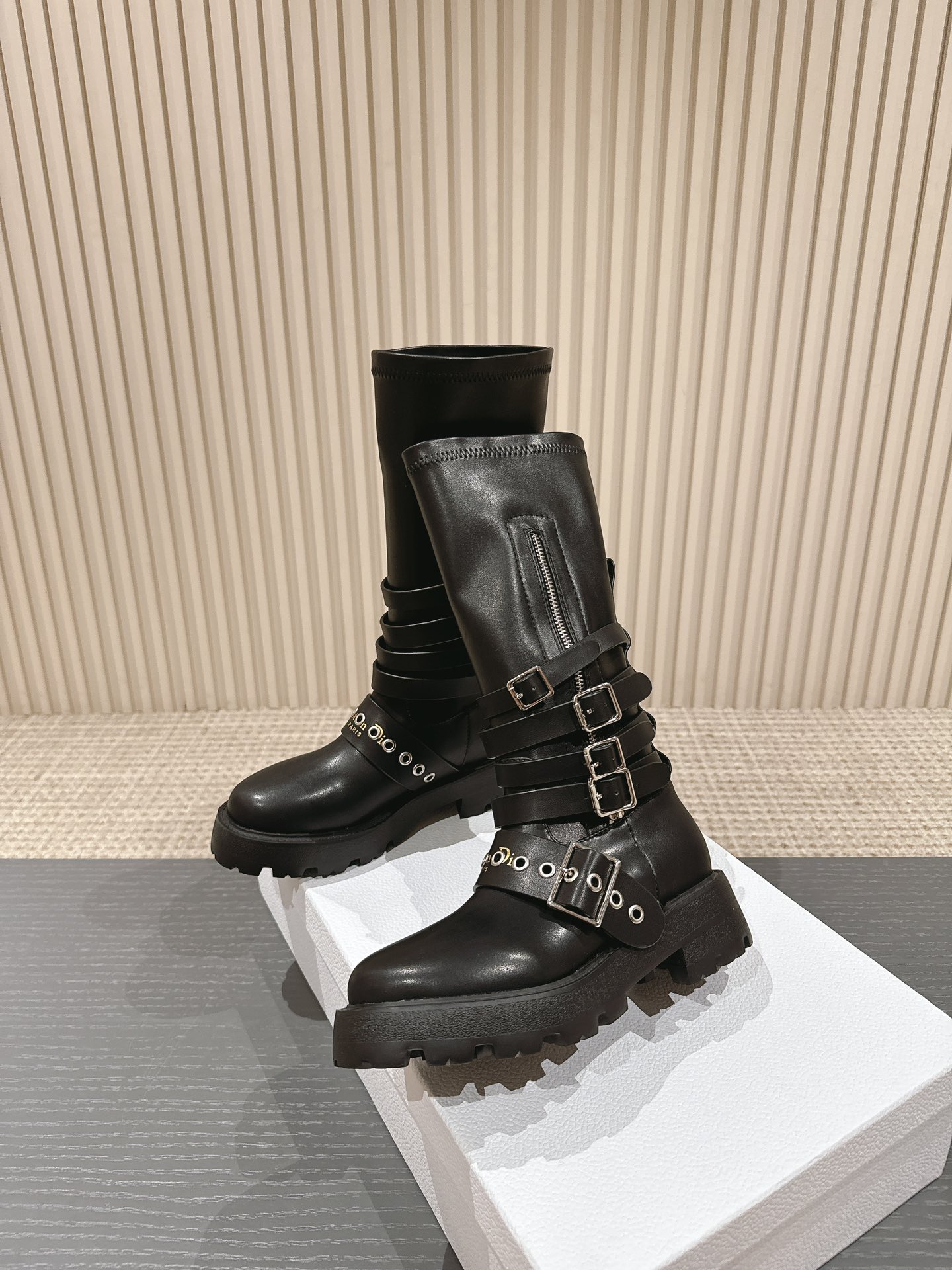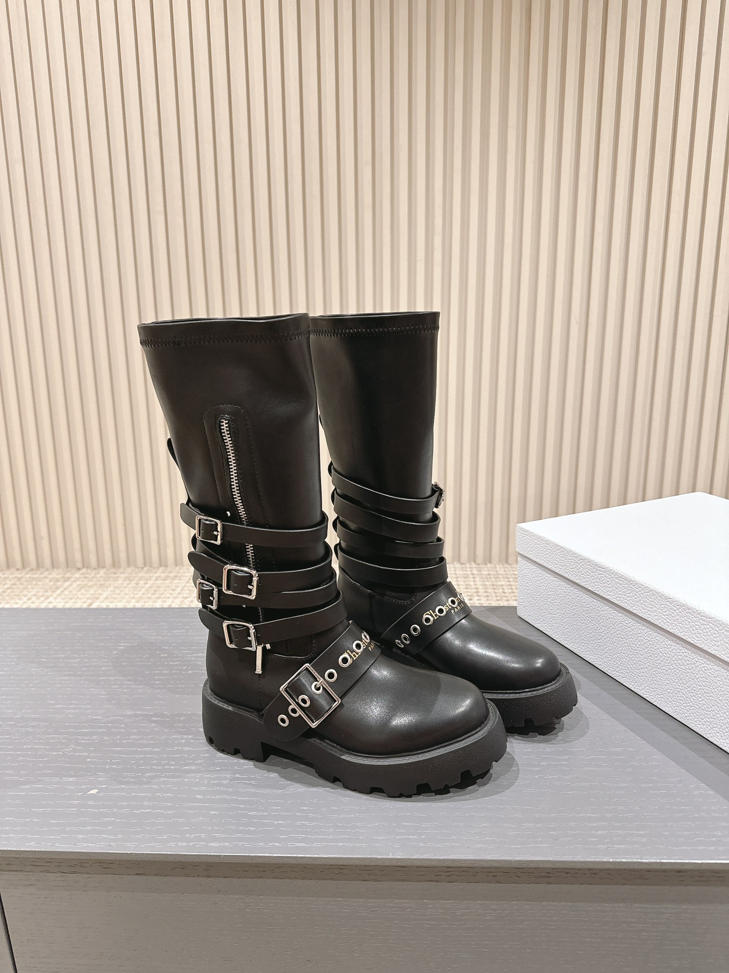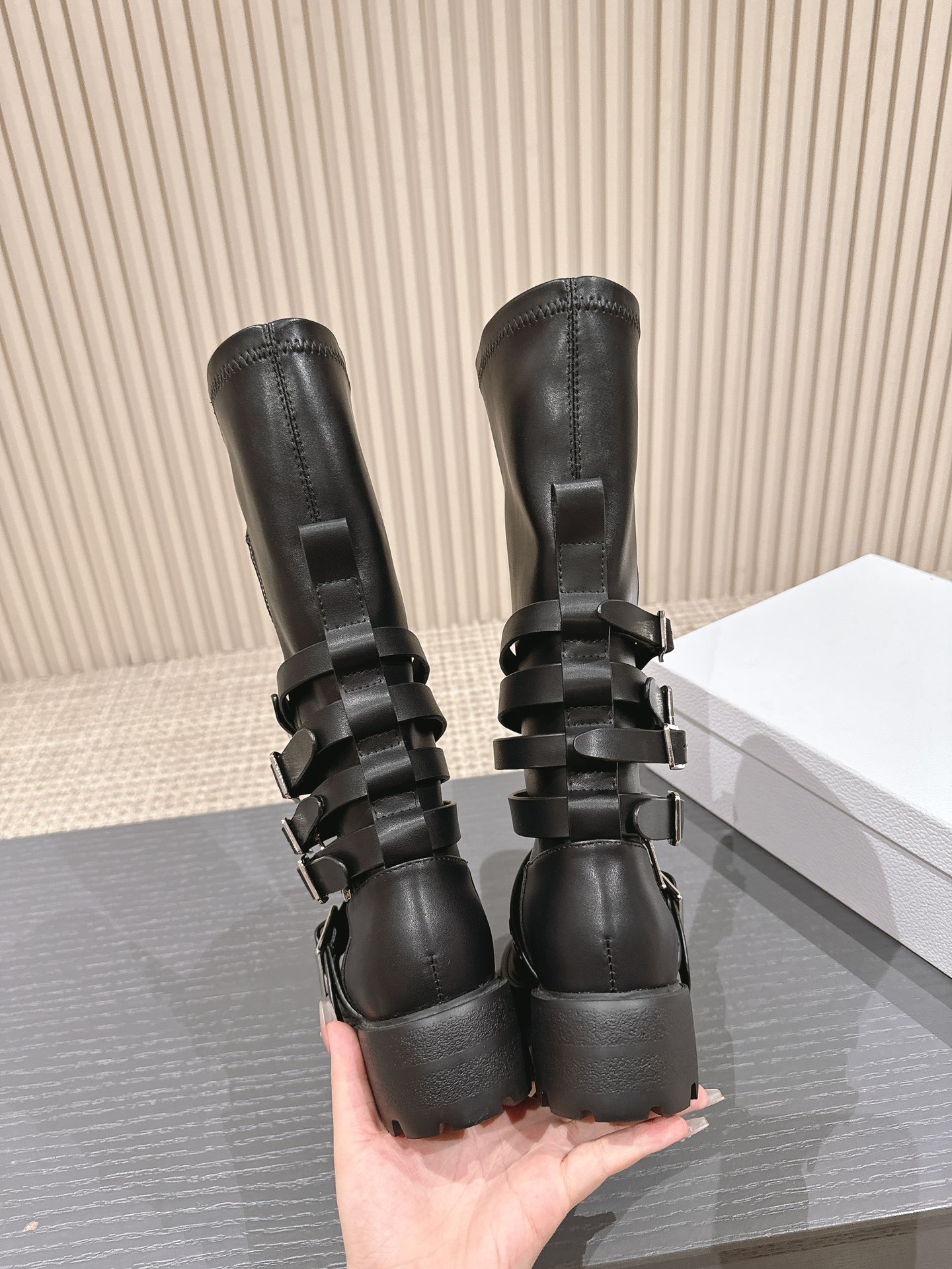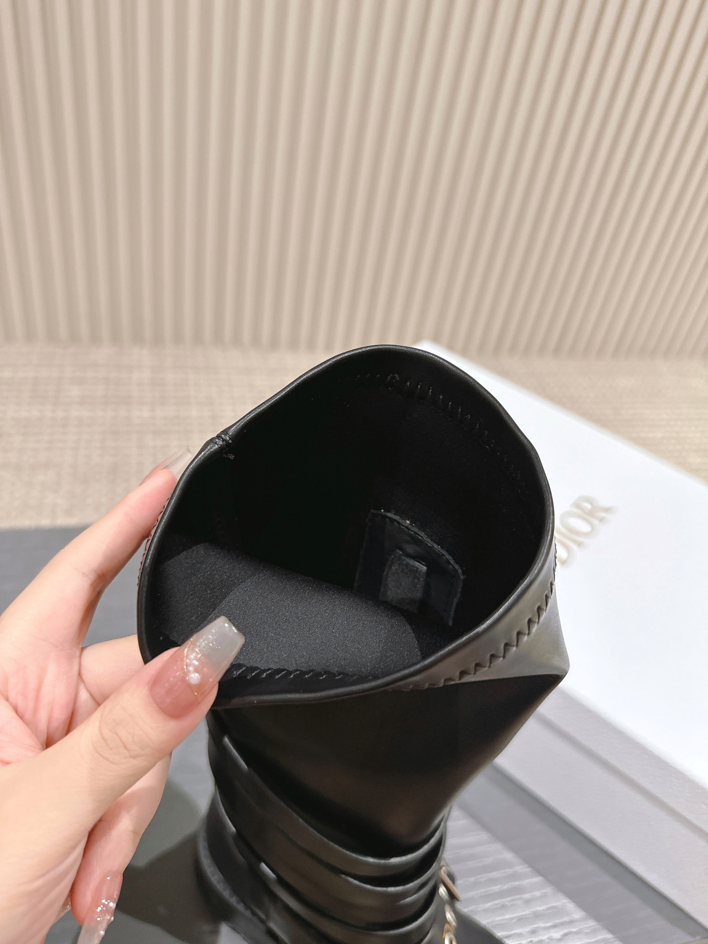 Create a striking look with distinctive design elements. Crafted from black cow leather, it can be easily put on and taken off. Taking inspiration from the Dior Book Tote bag, it features a two-tone "Christian Dior" signature on the top. Adjustable nylon straps with "CD" logo and rippled rubber soles set the tone for the bold silhouette.