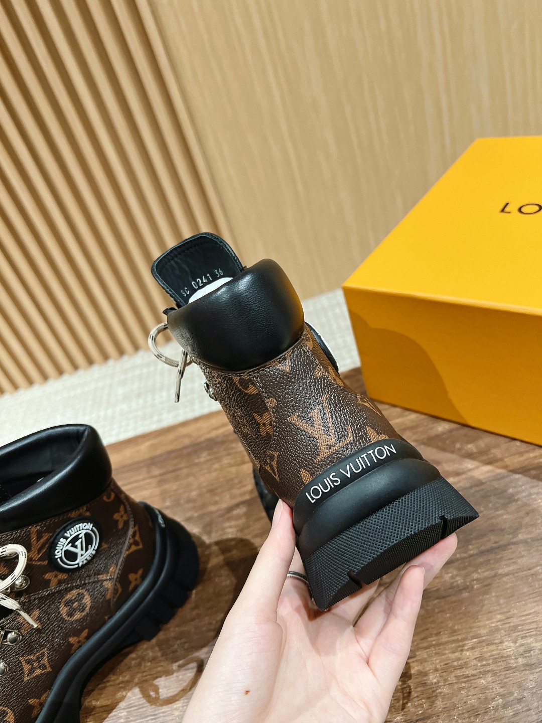 The Ruby Flat Rangers combine Louis Vuitton's iconic Monogram canvas with tongues and collars in smooth calf leather. These versatile ankle boots balance masculine and feminine codes for a fashion-forward look. They are finished with technical, two-tone laces and chunky yet lightweight rubber outsoles, which add extra height.