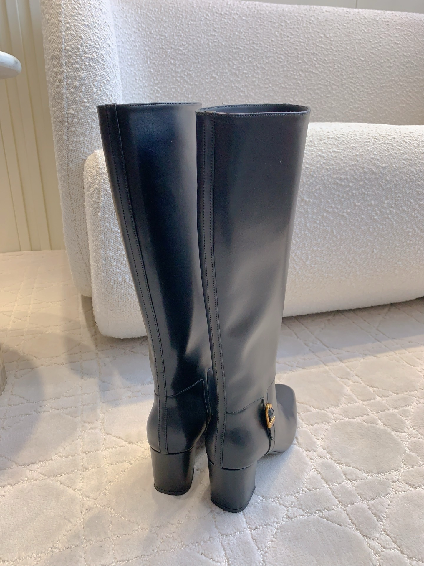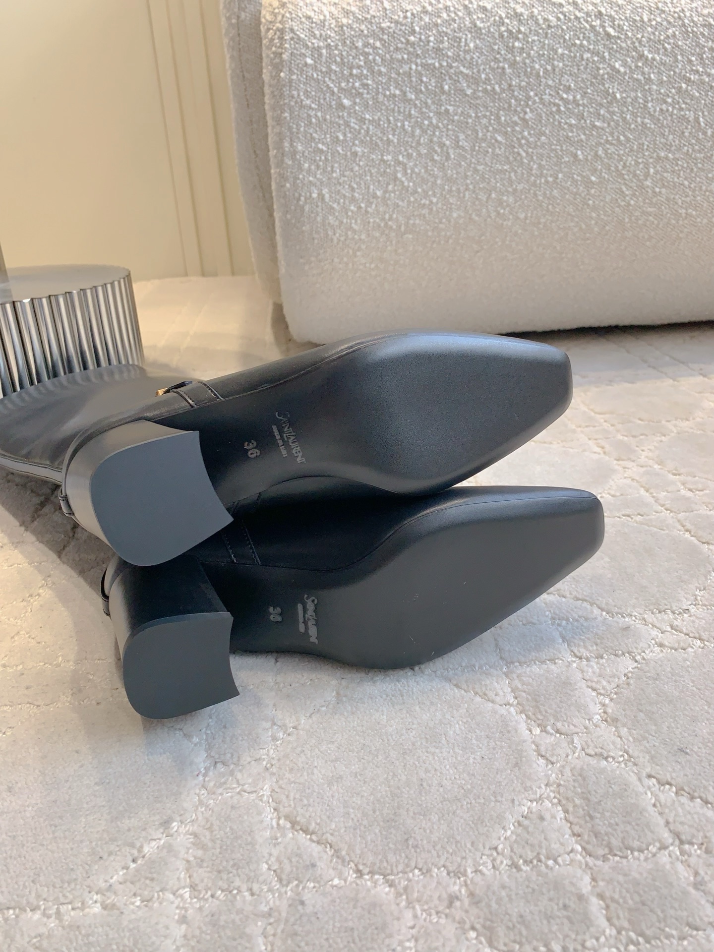 tube boots with an elongated square toe and block heel, featuring a SAINT LAURENT engraved buckle.