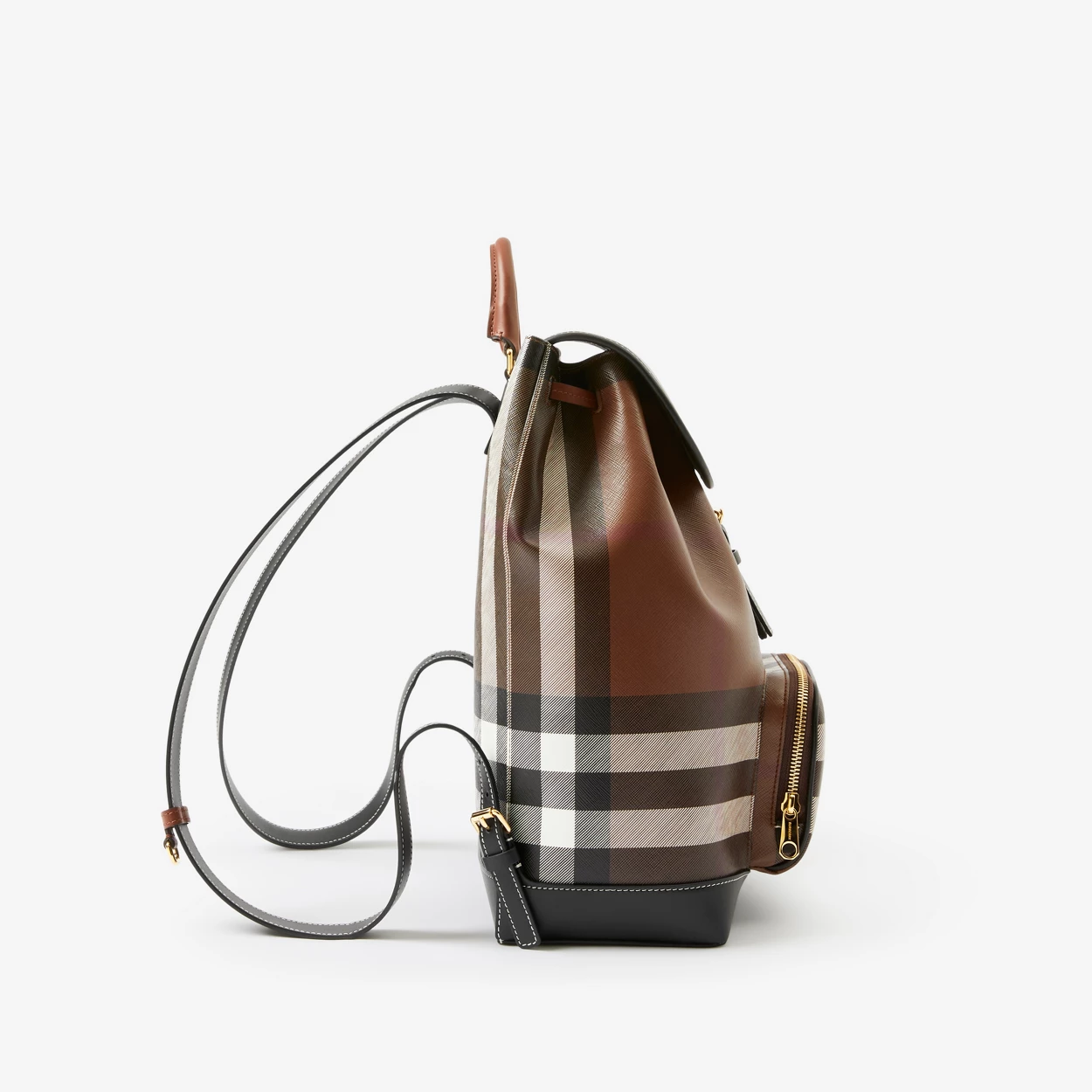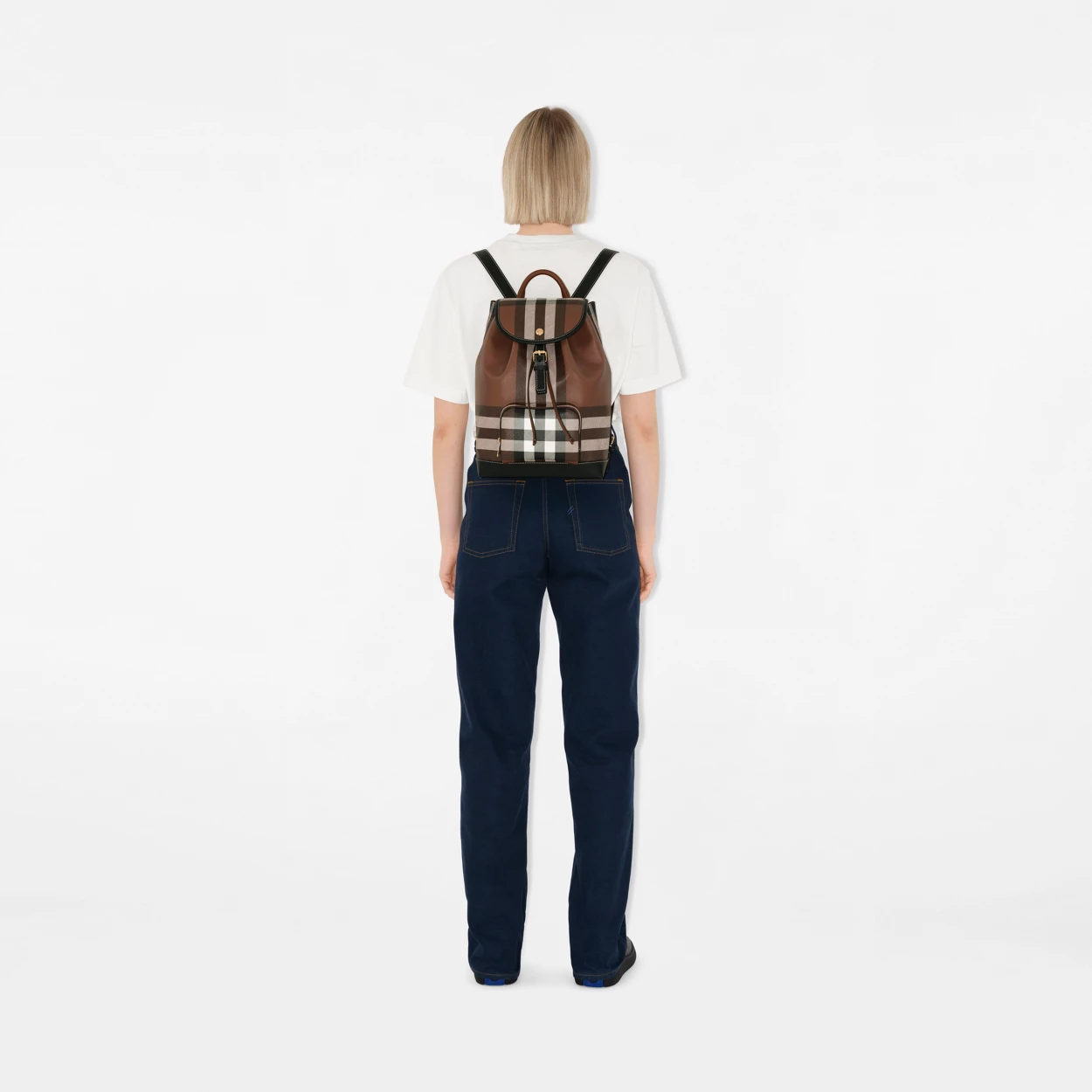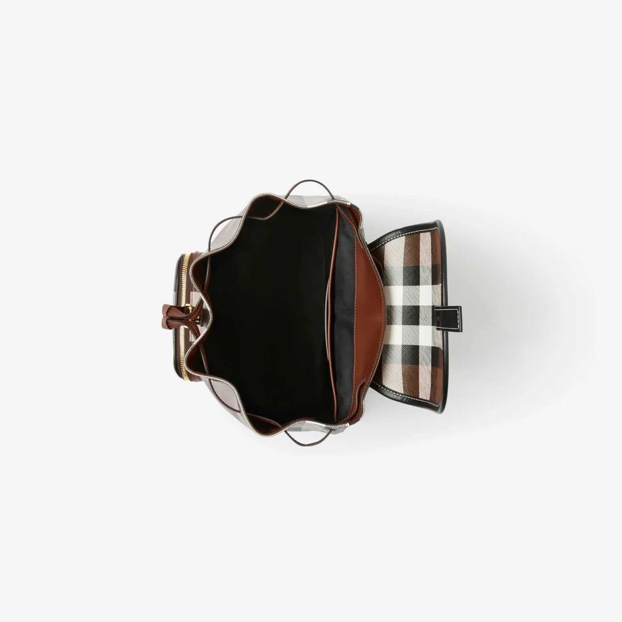 - A backpack made in Italy from Burberry Check trimmed with topstitched calf leather and lined in a cotton blend. The drawcord style features a leather top handle and front zip pocket.