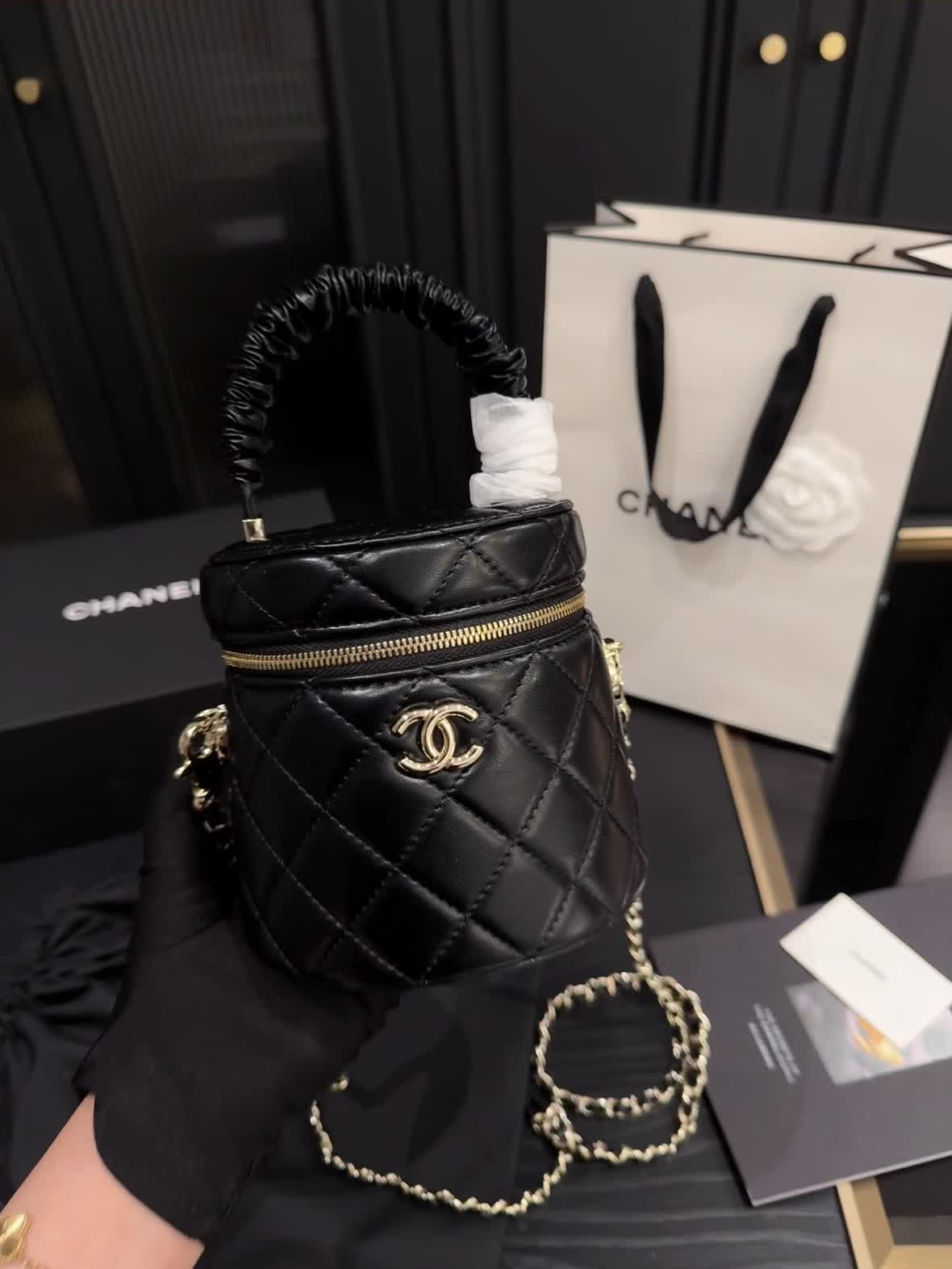 From Chanel's 22S collection – this newly released bucket-style cosmetic bag 🪞 is absolutely stunning!
