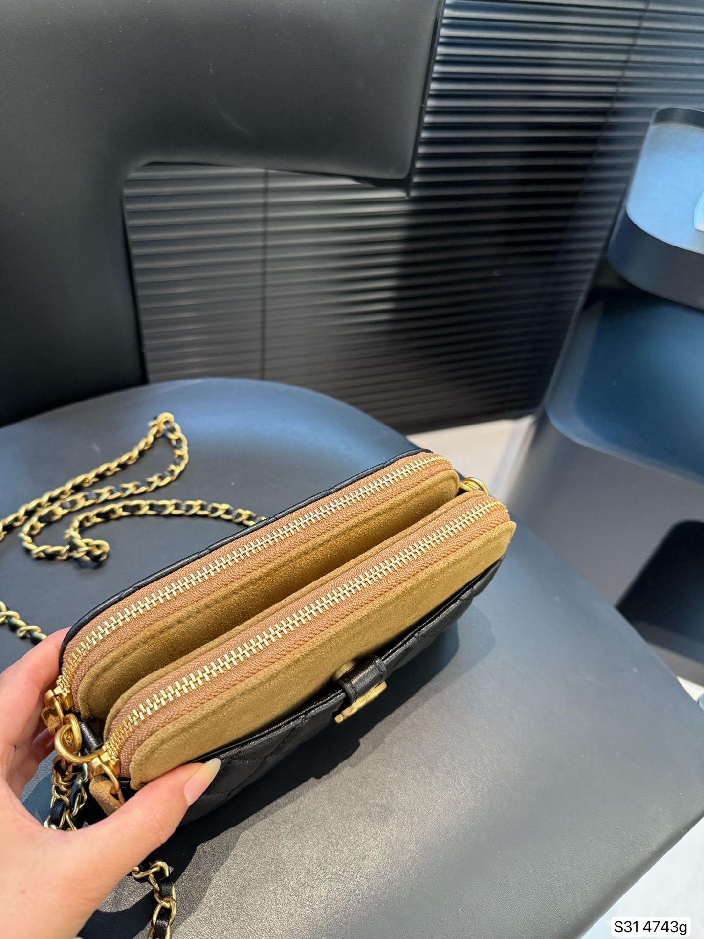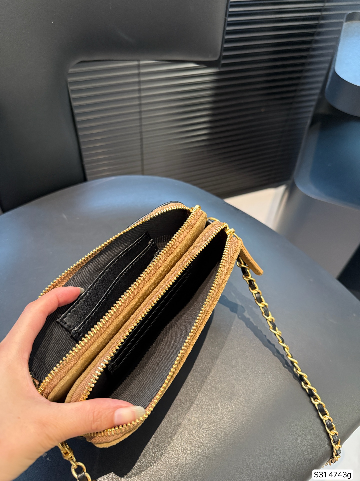 This Chanel phone bag effortlessly blends vintage charm with modern elegance. Crafted from a unique combination of soft lambskin and textured suede, the bag features a subtle contrast between the cloud-like smoothness of lamb leather and the retro, slightly distressed grain of suede.