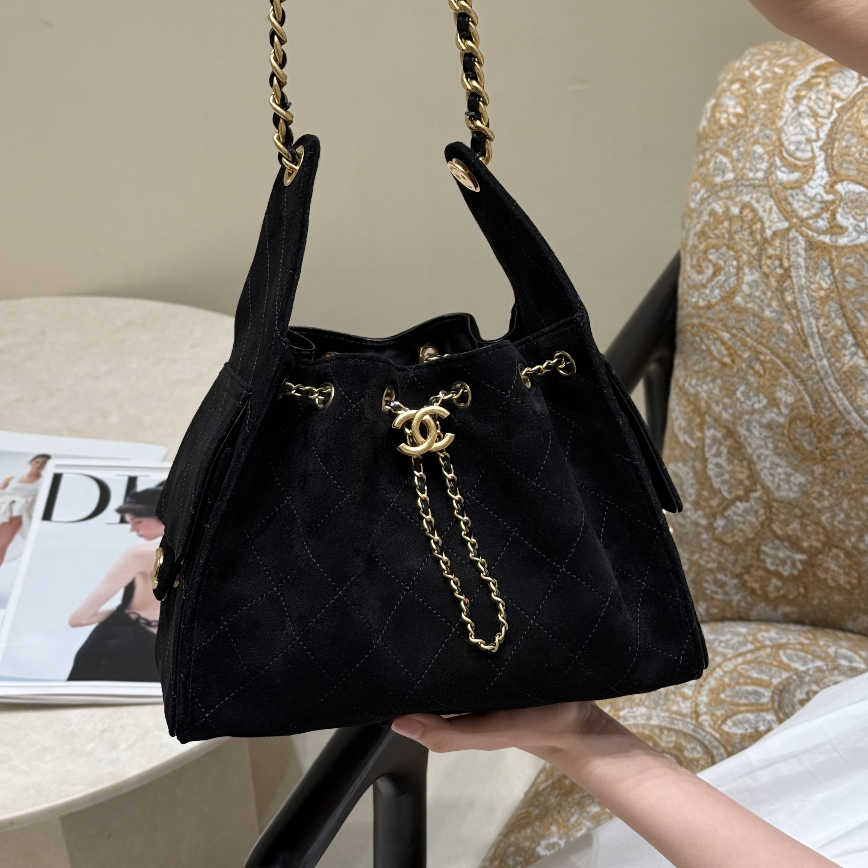 CHANEL 25A Suede Drawstring Hobo Bucket Bag