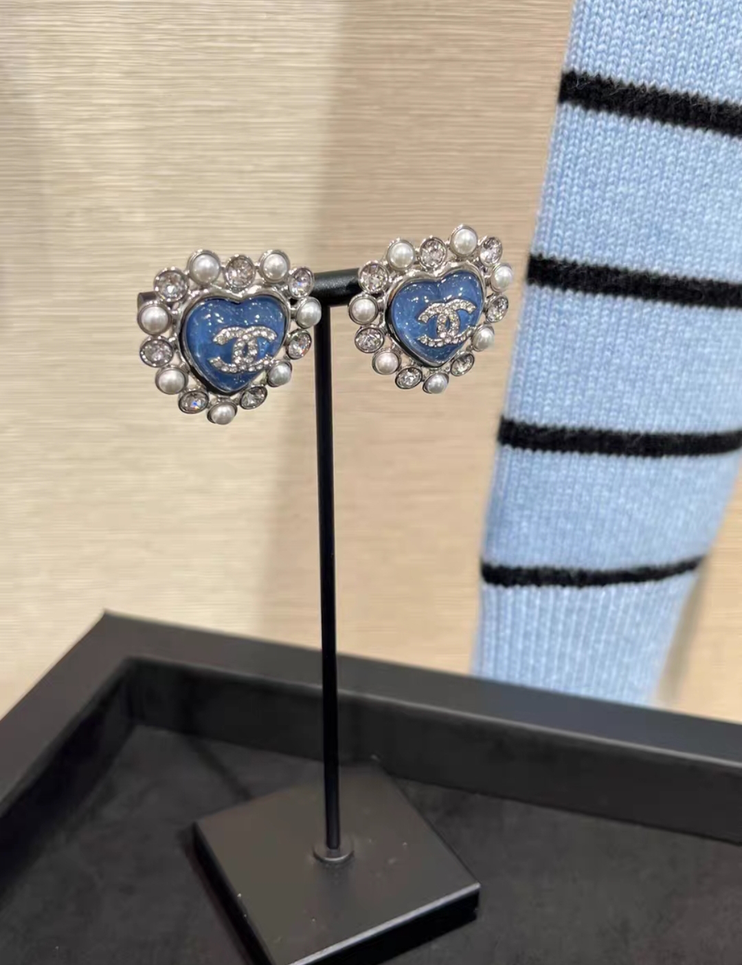 CHANEL 25P Silver Full Crystal Blue Heart Stud Earrings