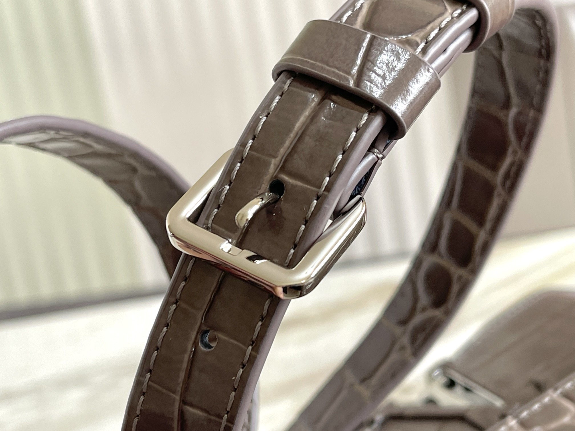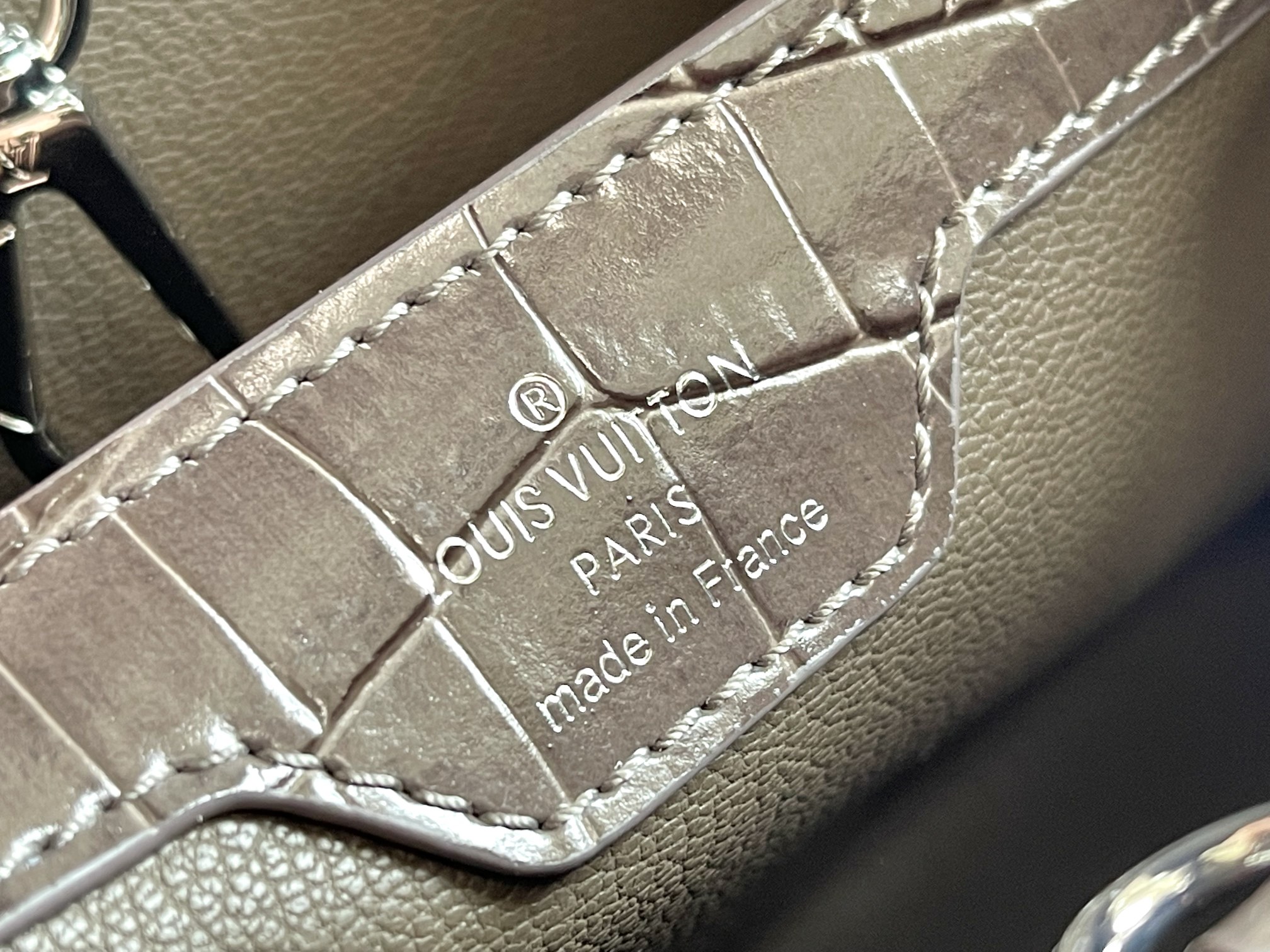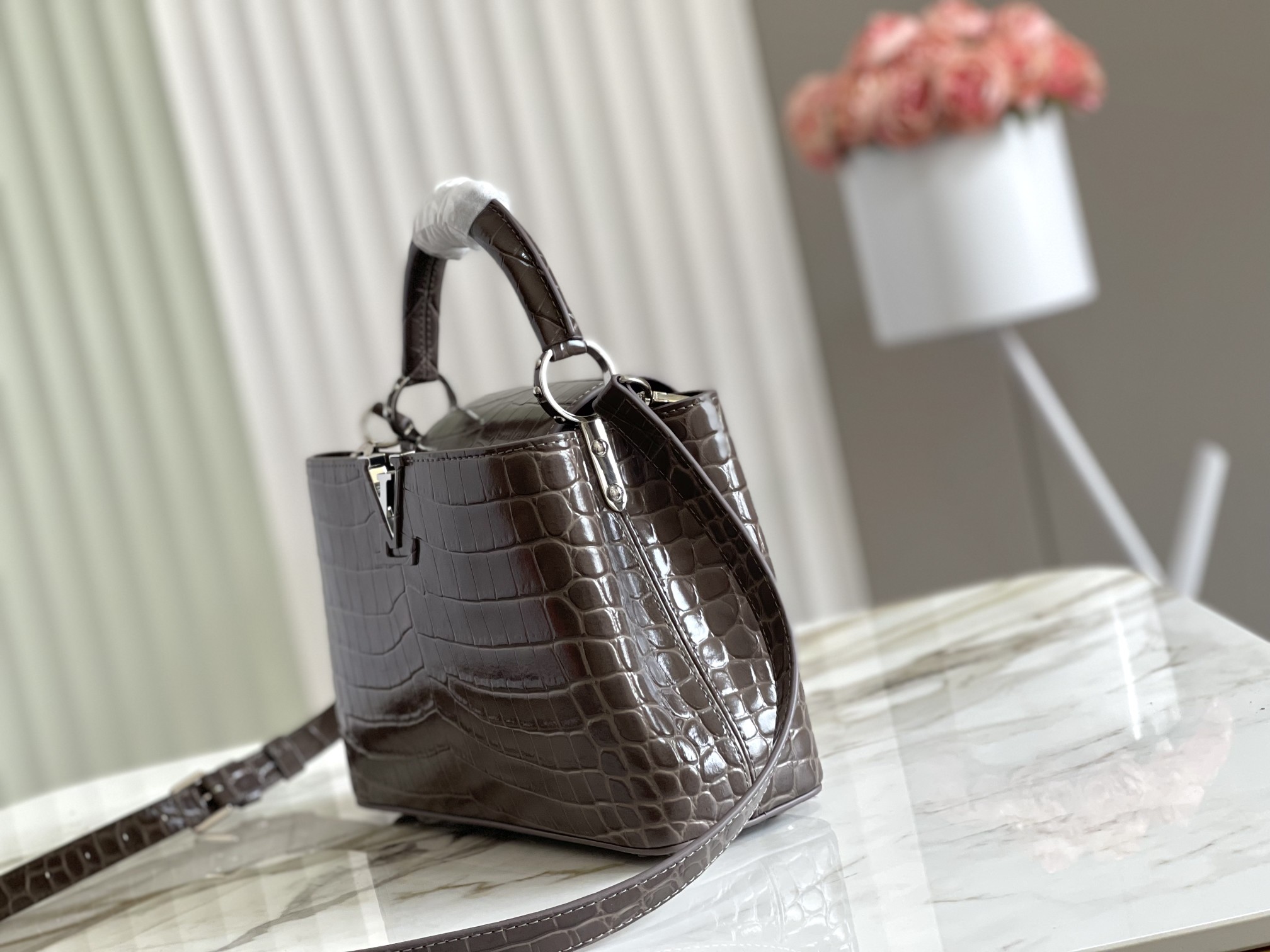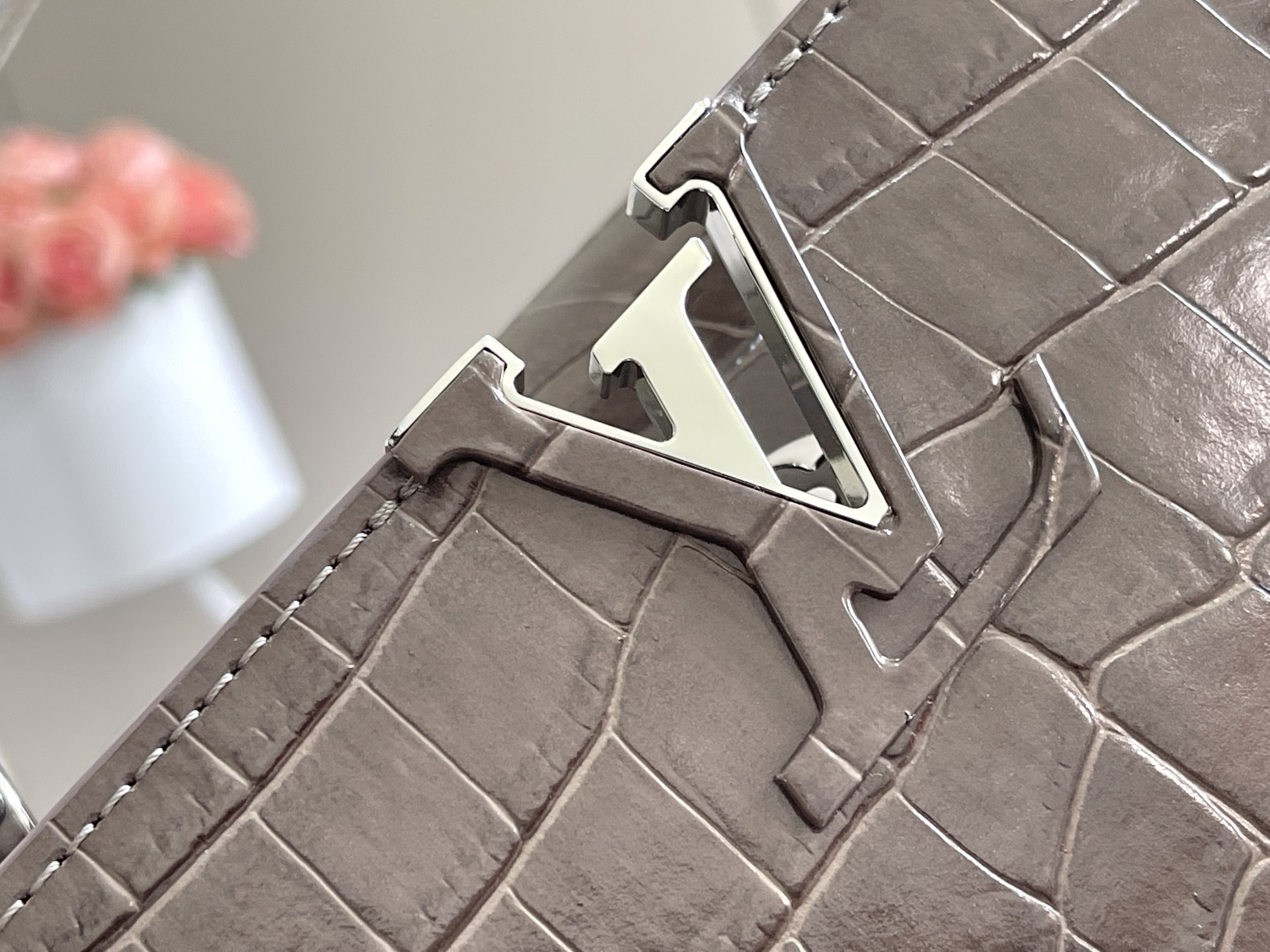 N93163/M48865 dark gray crocodile pattern. This precious Capucines BB handbag is made of crocodile leather pattern and has been treated with high gloss. It has a charming and luxurious goatskin lining and sparkling metal accessories. The unique Capucines cover can be stored in the bag to display the letter logo. It can also be folded out to reveal the Monogram Flower pattern. An ideal accessory for a night out ✨