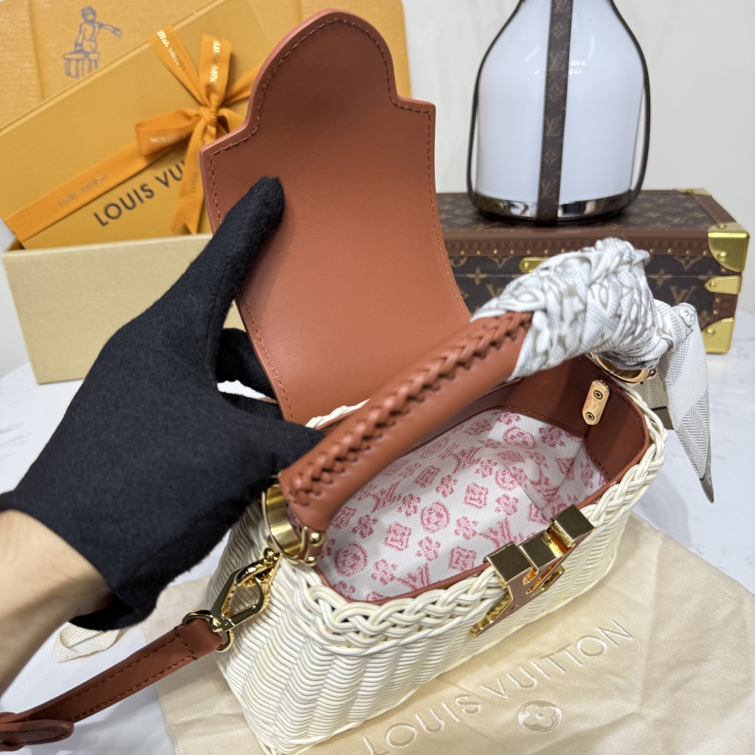 Inspired by the historic Louis Vuitton Picnic Trunk from 1892, this Capucines Mini is the perfect summer handbag. Each one-of-a-kind model is meticulously handwoven from rattan, taking two days to complete. It is trimmed with leather and adorned with the signature LV Initials in an elegant gold-toned finish. Wear it cross-body, over the shoulder or carried by hand.