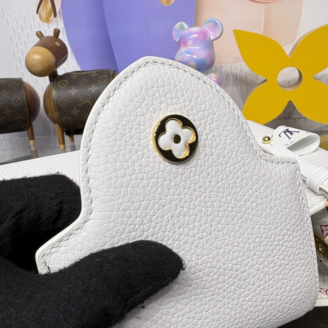 Joyful detailing from the re-edition of the Louis Vuitton x Murakami uplifts the House’s iconic Capucines handbag with a playful spirit. Crafted from Taurillon leather, the emblematic LV Initials and removable Monogram strap are accented with vibrant tones inspired by the artist’s signature rainbow palette, while a chic bow-shaped keybell with a padlock attachment completes the look. The compartmented interior is large enough for daily essentials and organized with multiple pockets.