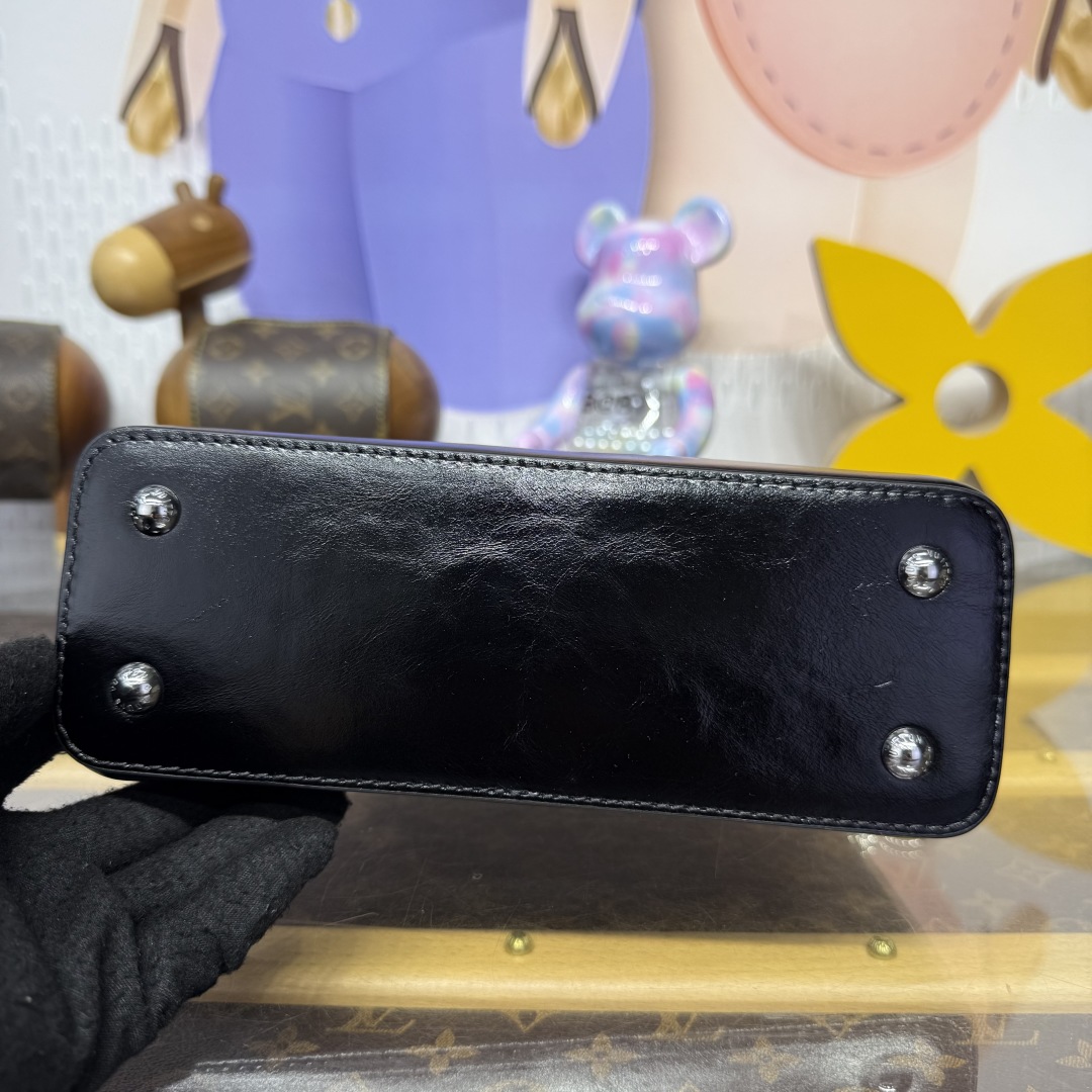 The iconic Capucines East-West BB is given an edge this season with a crinkled leather finish. It is trimmed with cowhide and elevated with silver-toned hardware, including signature LV Initials and two decorative chains, which can be removed if desired. The capacious double-carry style offers multiple organizational features inside, and can be worn multiple ways.