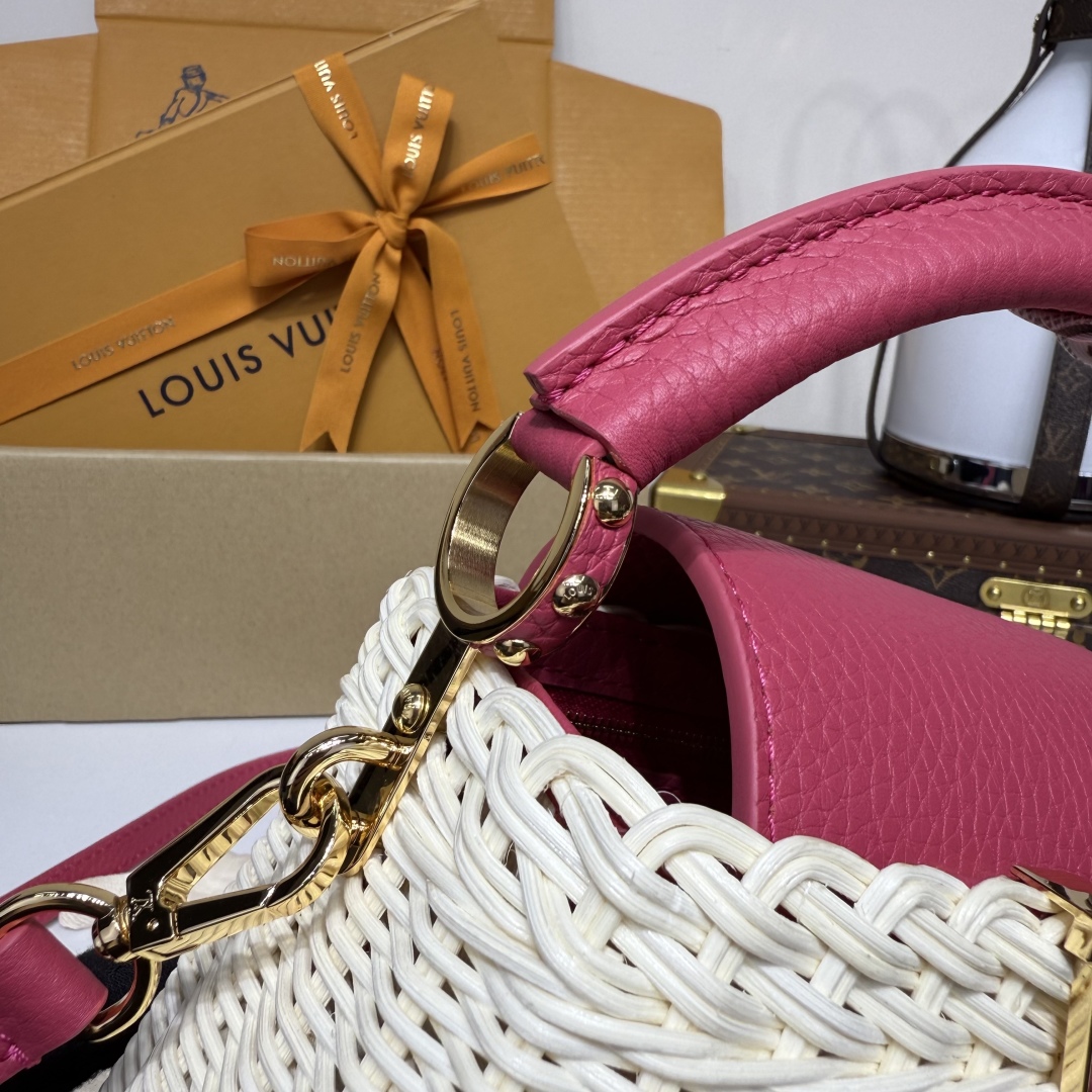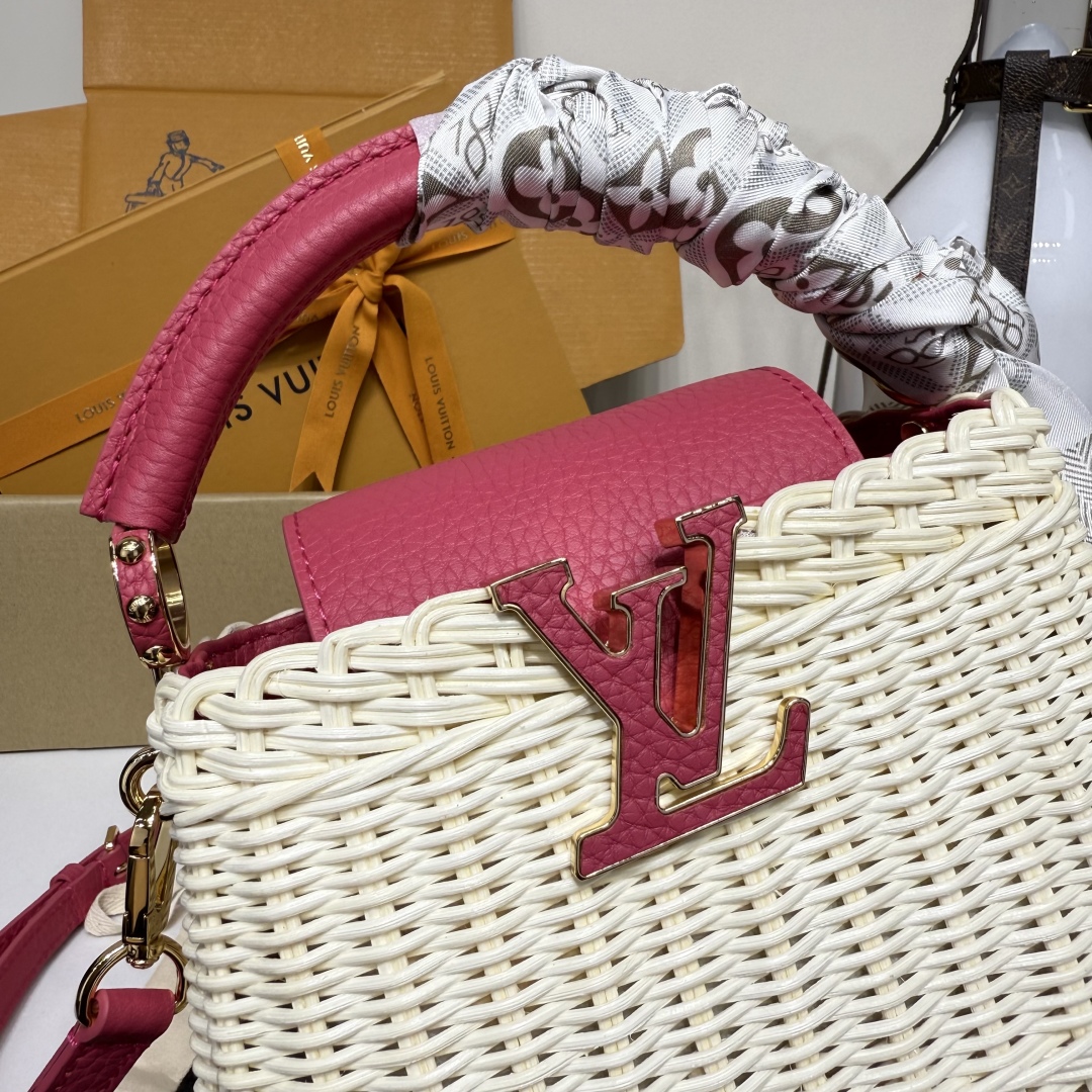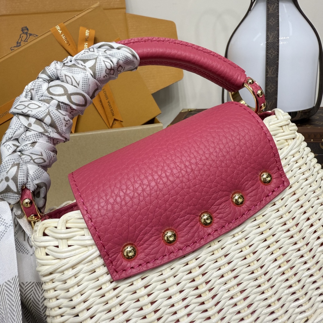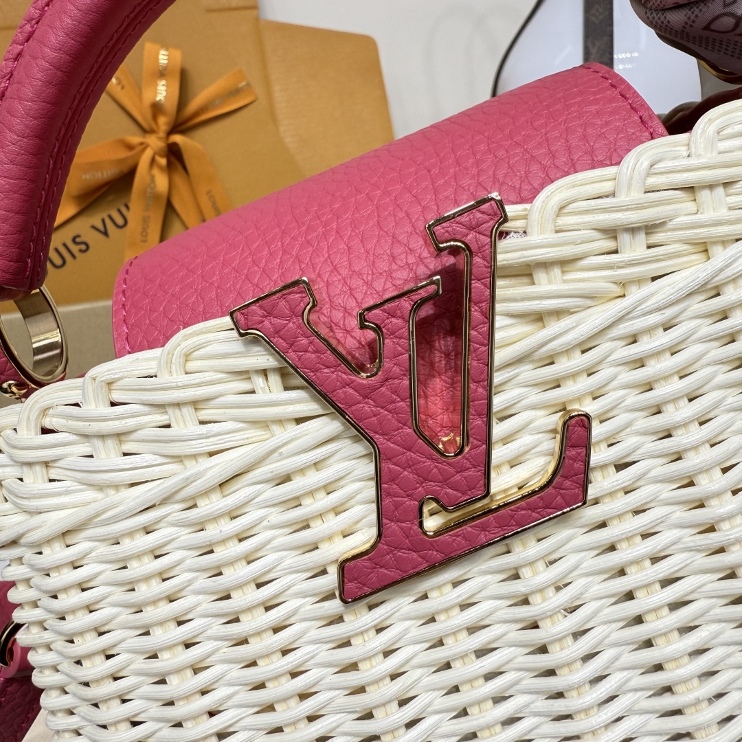 Inspired by the historic Louis Vuitton Picnic Trunk from 1892, this Capucines Mini is the perfect summer handbag. Each one-of-a-kind model is meticulously handwoven from rattan, taking two days to complete. It is trimmed with leather and adorned with the signature LV Initials in an elegant gold-toned finish. Wear it cross-body, over the shoulder or carried by hand.
