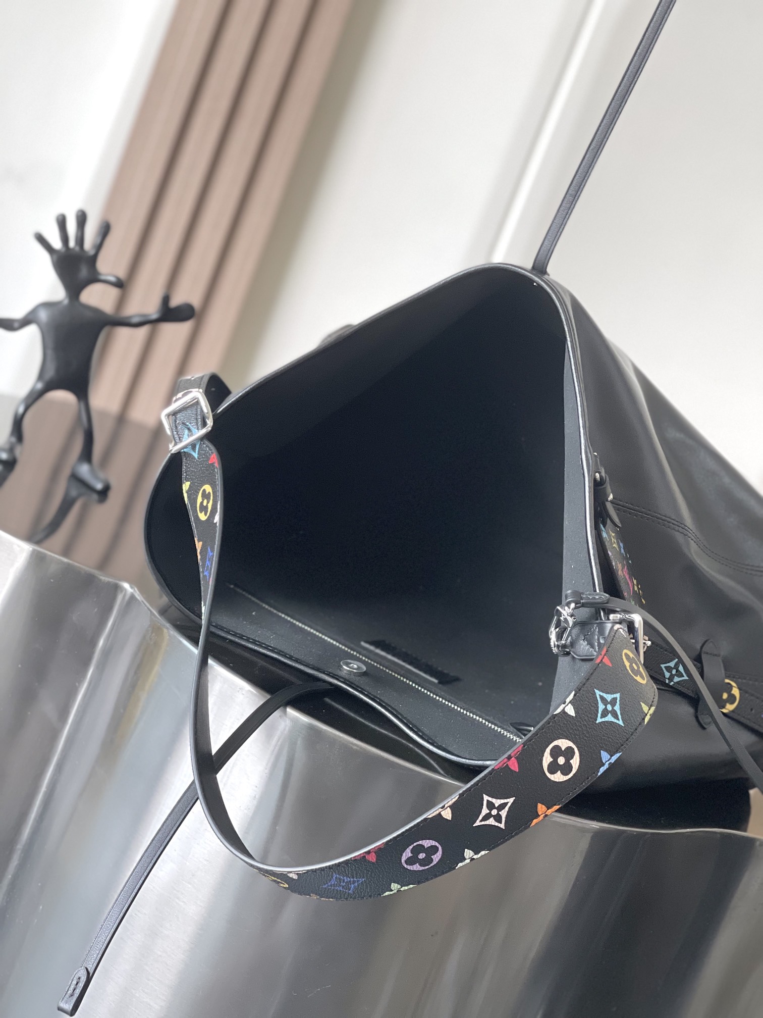The elegant CarryAll Vibe handbag is crafted from supple lambskin in a practical body-friendly shape with tone-on-tone cowhide trimmings and a roomy interior big enough to fit daily essentials, including a large smartphone. As part of the celebratory re-edition of the Louis Vuitton x Murakami collection, a multicolored Monogram motif adds a joyful pop of color to the removable strap and emblematic name tag. Complete with a removable inside pouch.