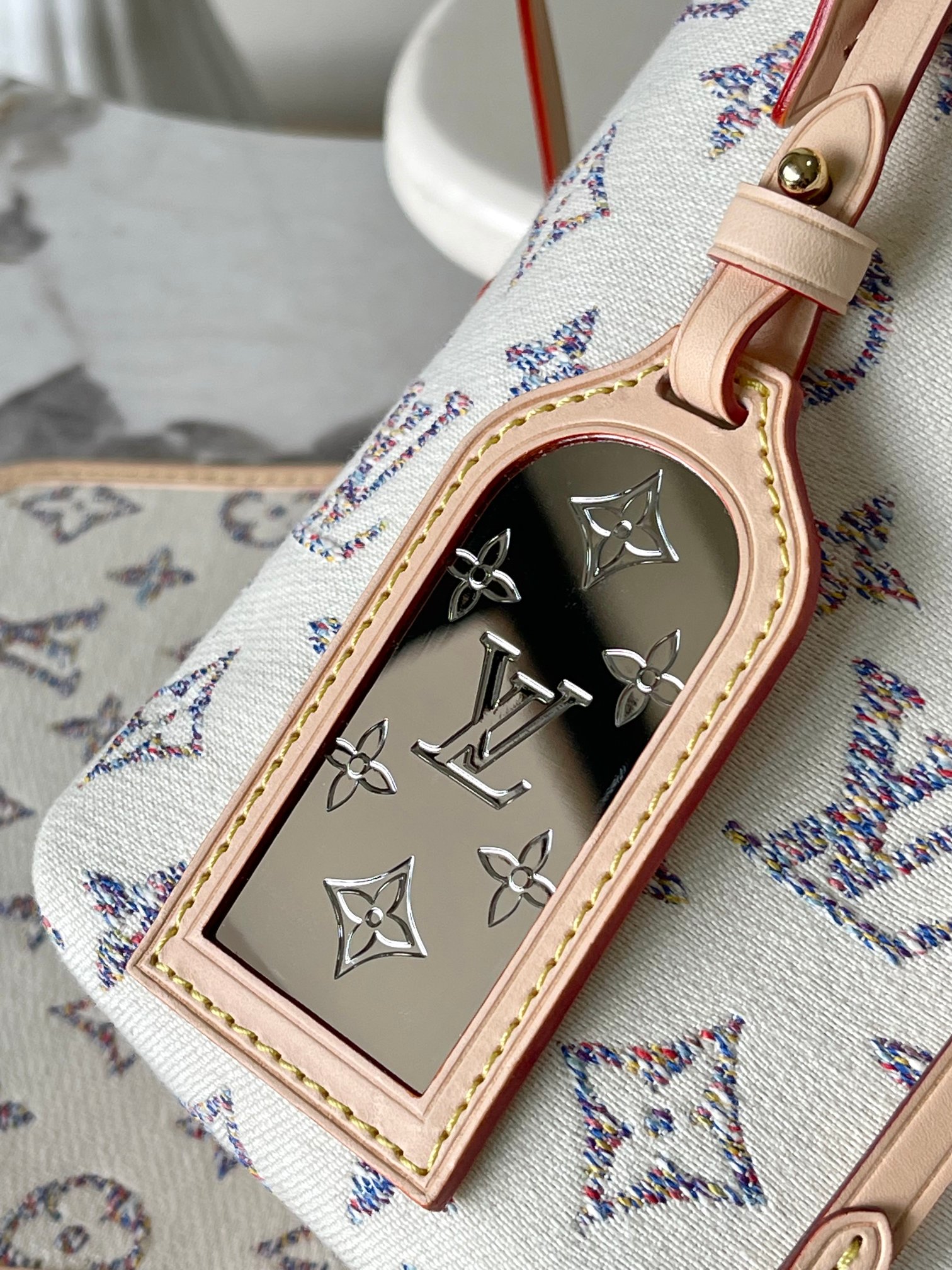 Part of the Nautical capsule, this CarryAll PM is made from Monogram jacquard with natural cowhide-leather trim. The motif was created by weaving together 66 multicolored threads to create a Monogram with a subtle gradient of colors. Adding a luminous accent, this versatile city bag comes with a laser-engraved mirror charm – ideal for beauty touch-ups.