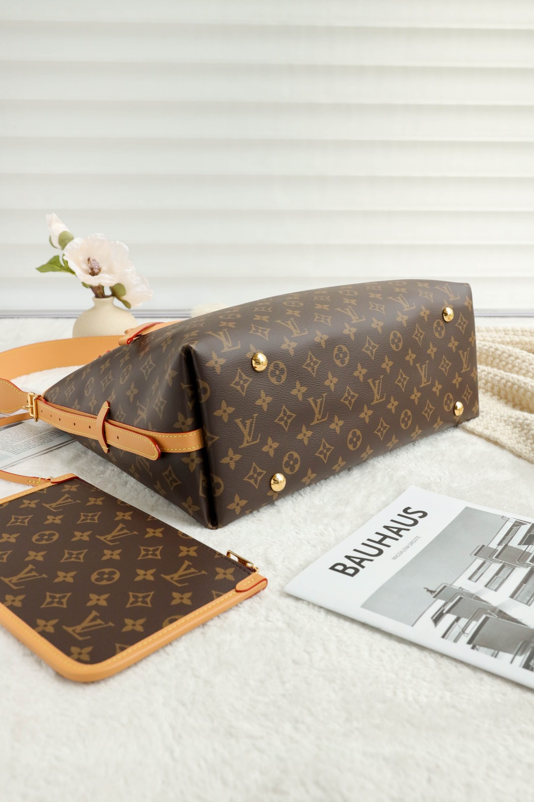 Louis Vuitton launches the CarryAll MM handbag in Monogram canvas with natural leather trim. Its contemporary, body-friendly design and roomy interior make this a fantastic everyday bag. Inside zipped pockets and a removable zipped pouch deliver even more functionality. A gold-color buckle allows the handle to be shortened or lengthened.