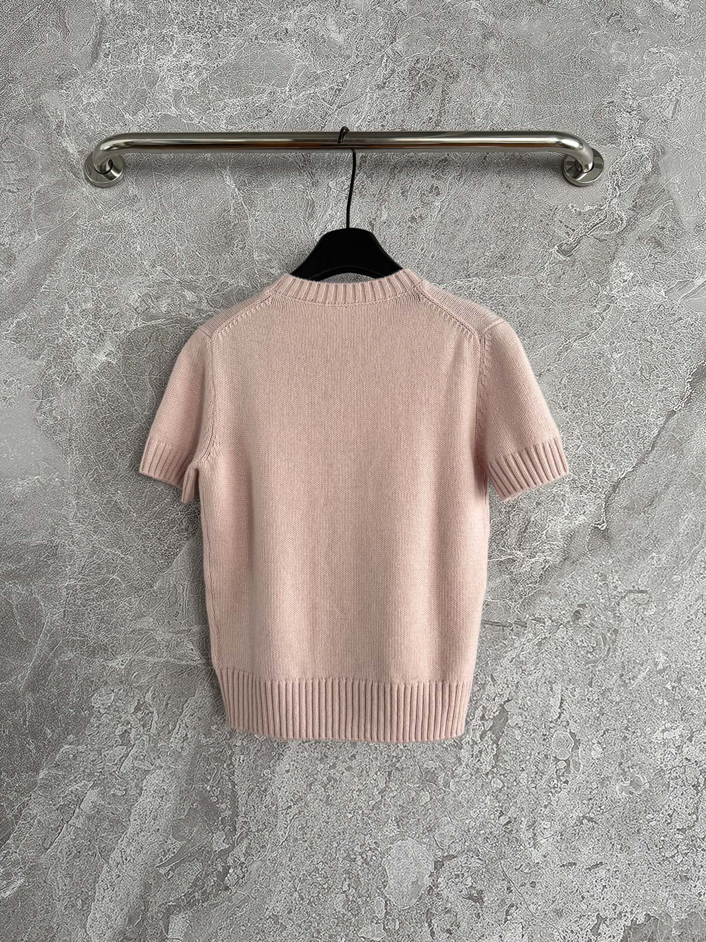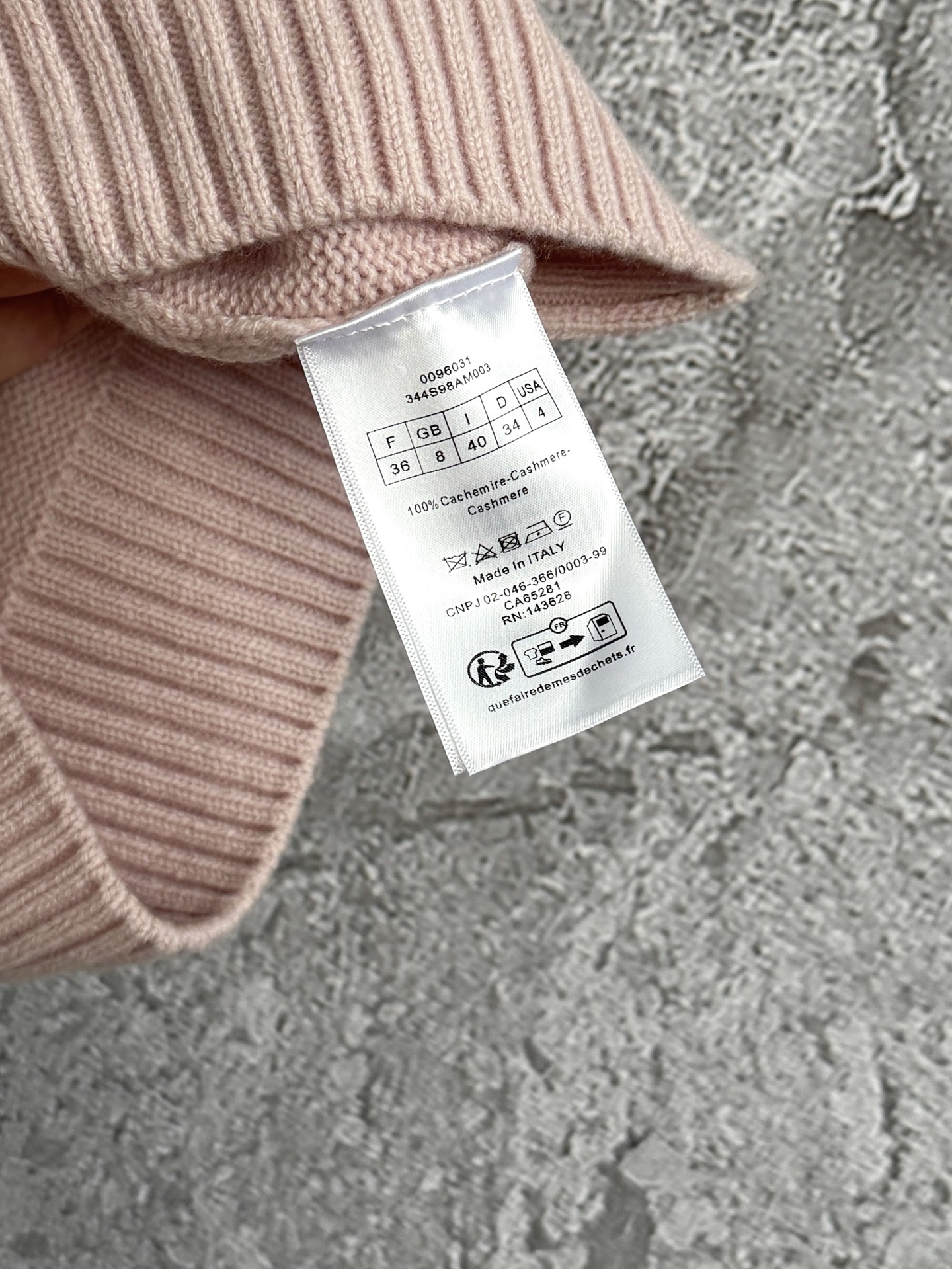 This piece stands out for its specially dyed soft pink shade, which flatters the complexion beautifully. Made from buttery-soft cashmere, it feels incredibly gentle and comfortable against the skin. The neckline and cuffs feature precision knitting that mimics hand-stitched detailing, adding a refined touch.
