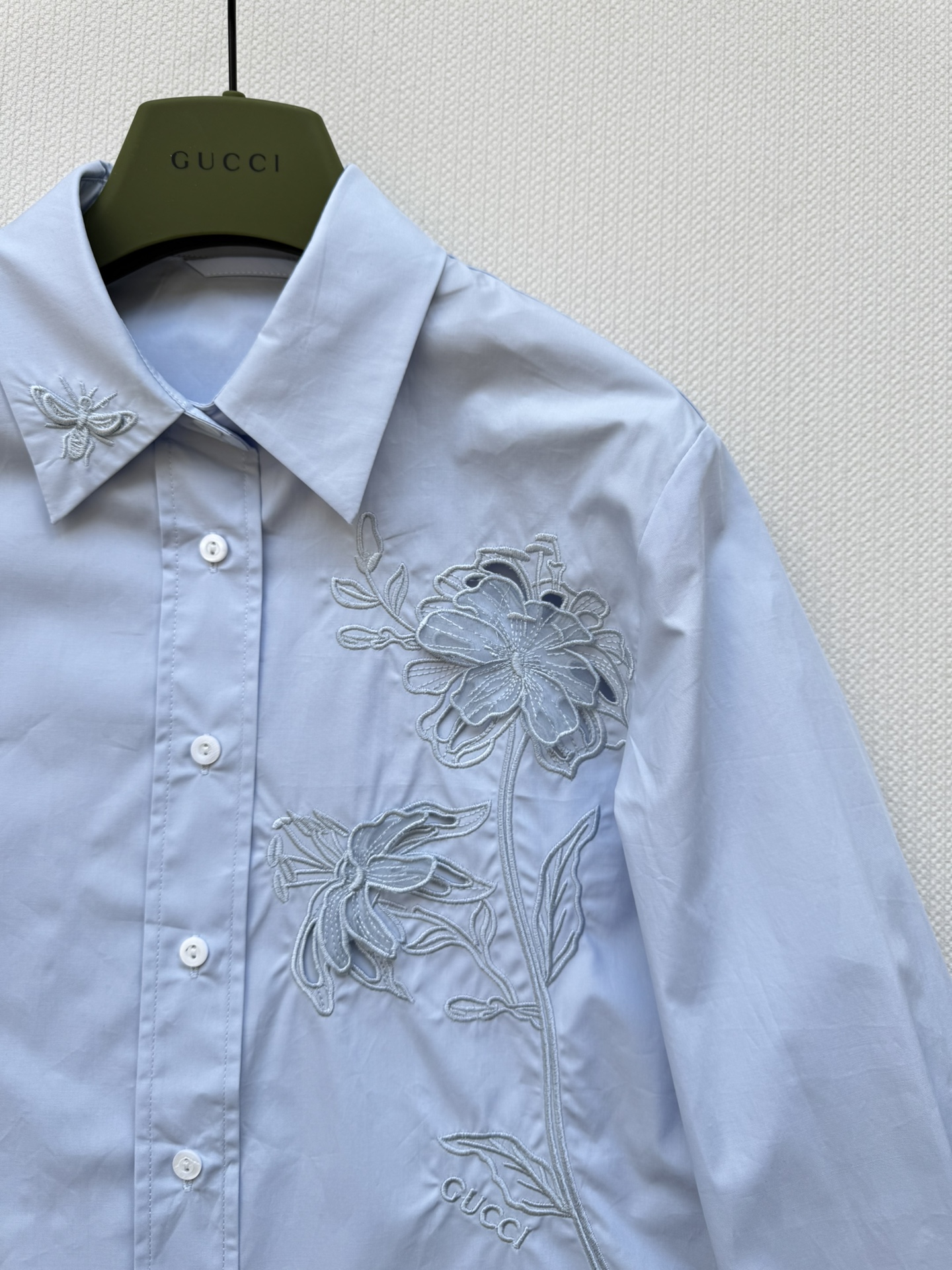Details: Butterfly embroidery on the cuffs and collar adds a playful yet elegant accent.
