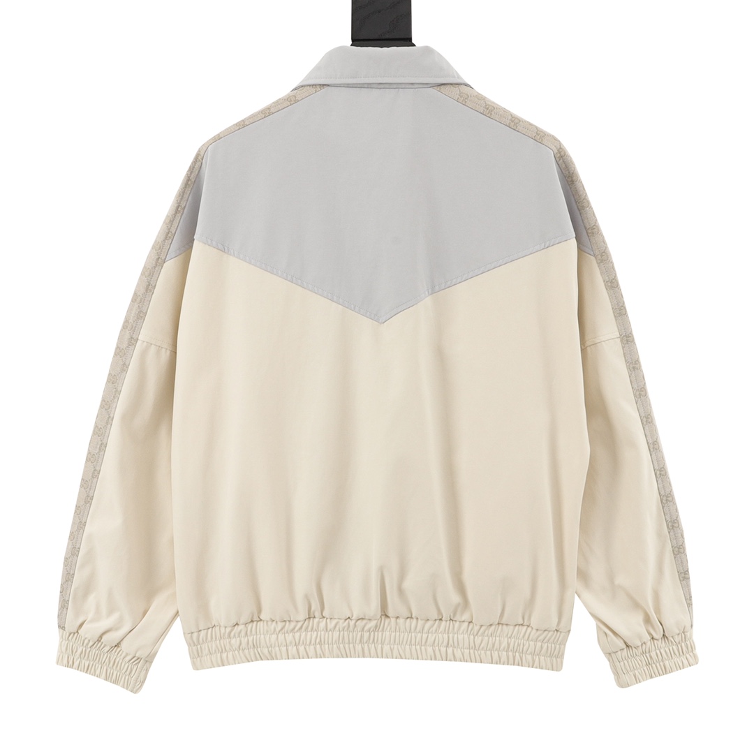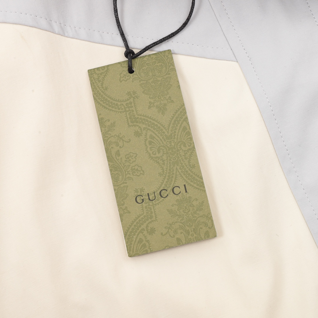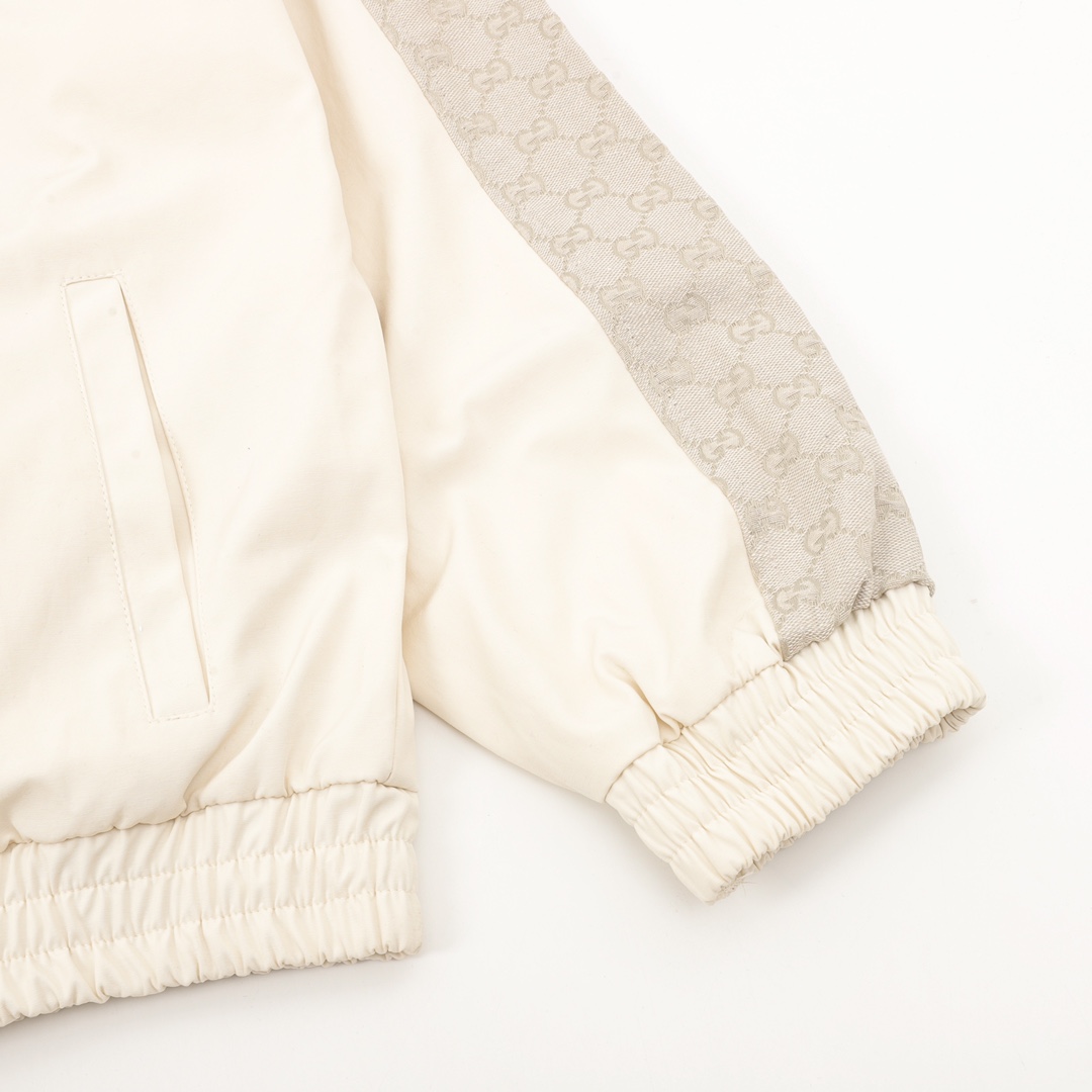 This jacket features a jacquard GG fabric patchwork, dyed in beige and ebony colors, with a neatly organized floral pattern that perfectly replicates the original! The utility jacket cut combined with a minimalist silhouette offers comfort and practicality, exuding a chic, modern urban style. It has a two-way nylon zipper opening, elastic cuffs, an adjustable elastic hem, and a fixed drawstring hood accented with leather trim. The front includes four zippered pockets, and the interior and sleeves are lined, with an additional pocket in the lining.