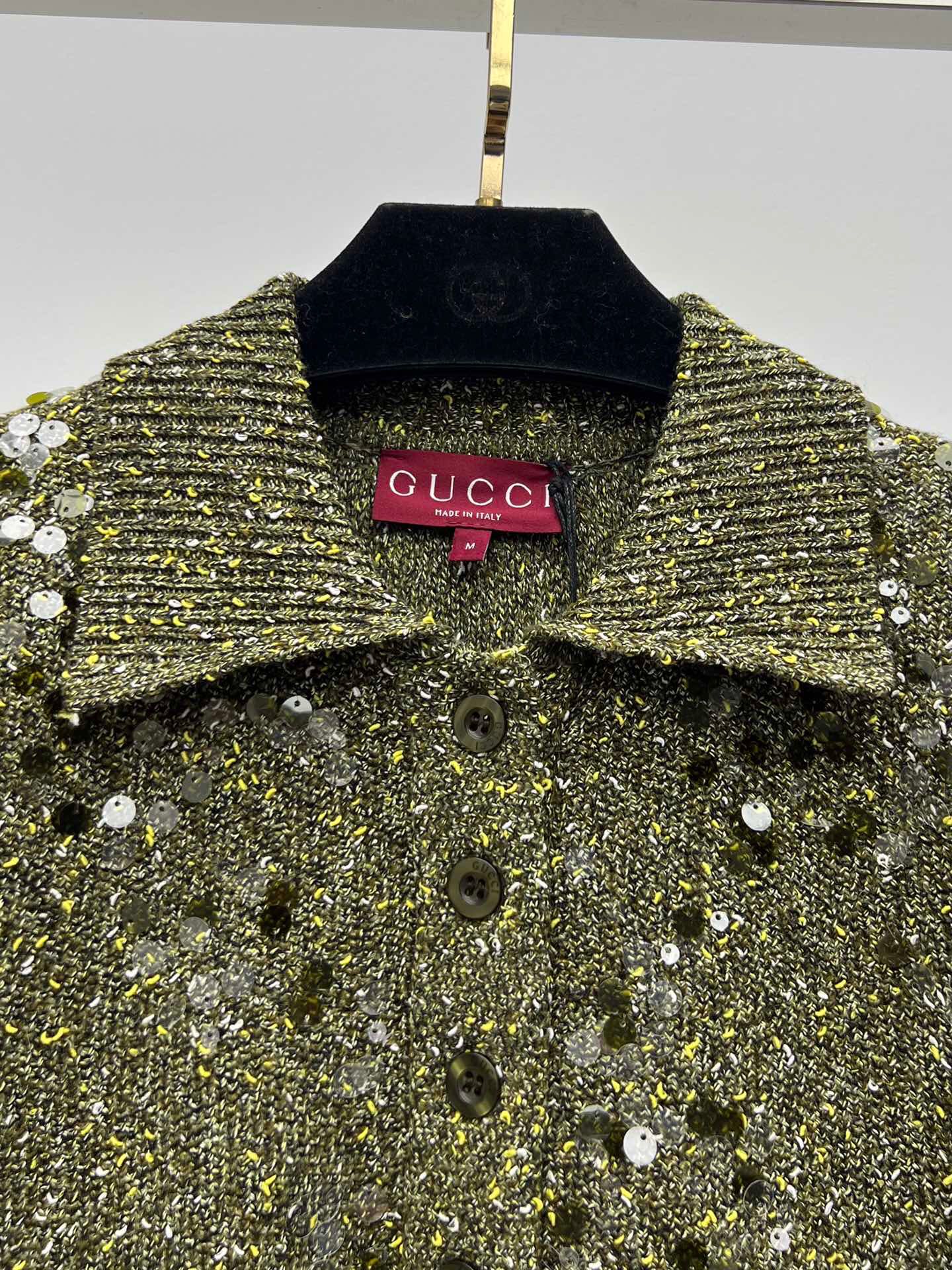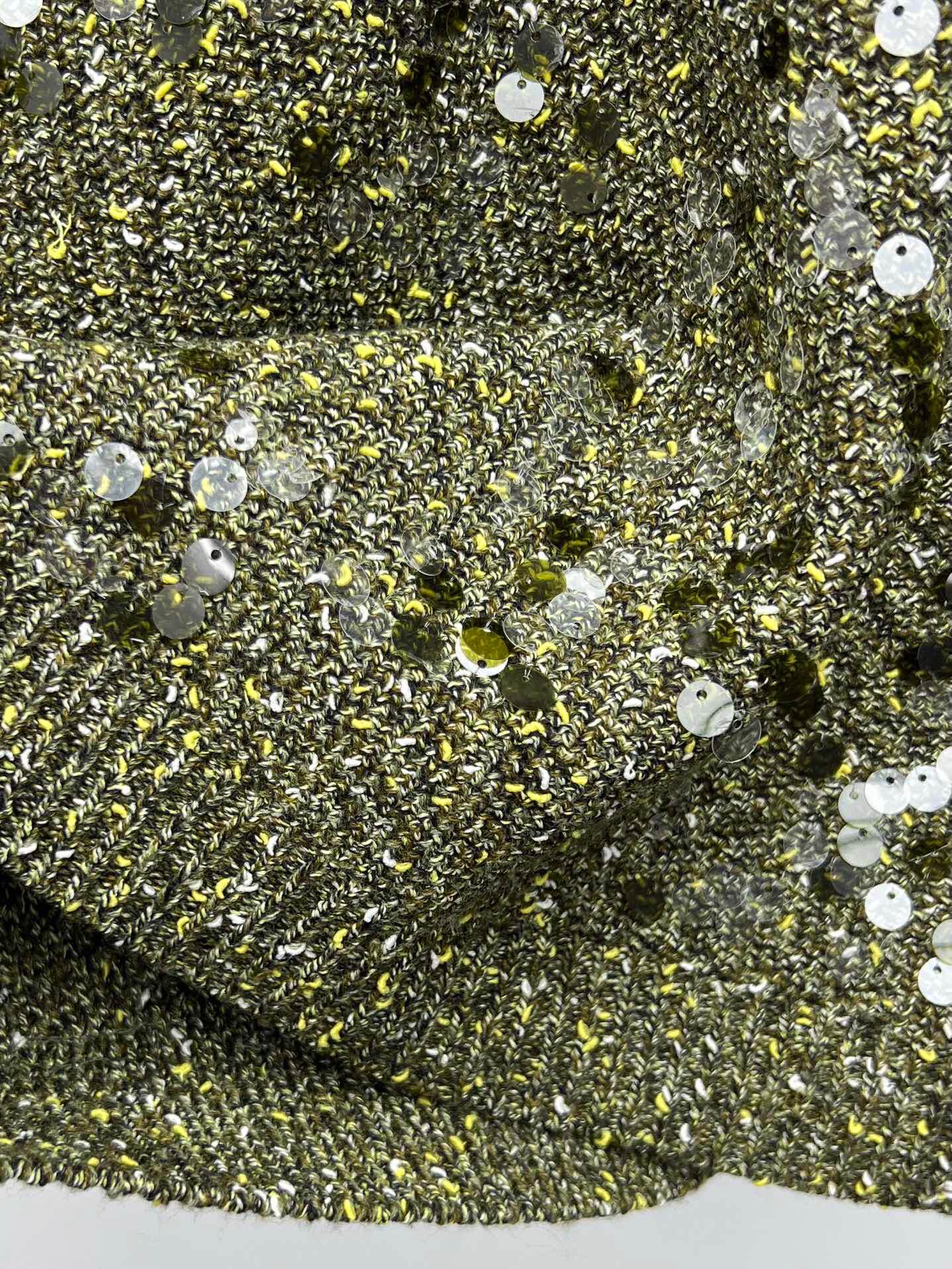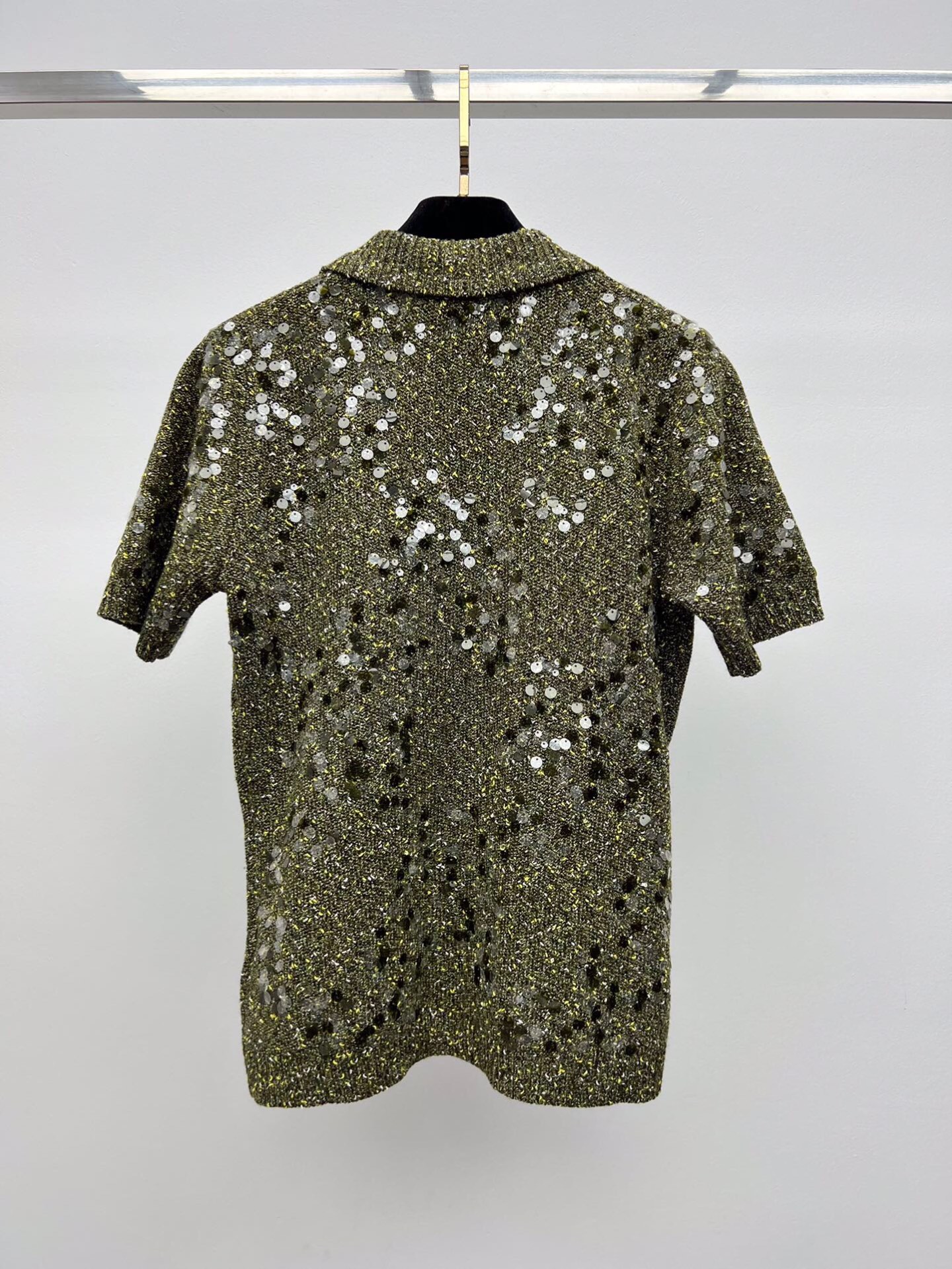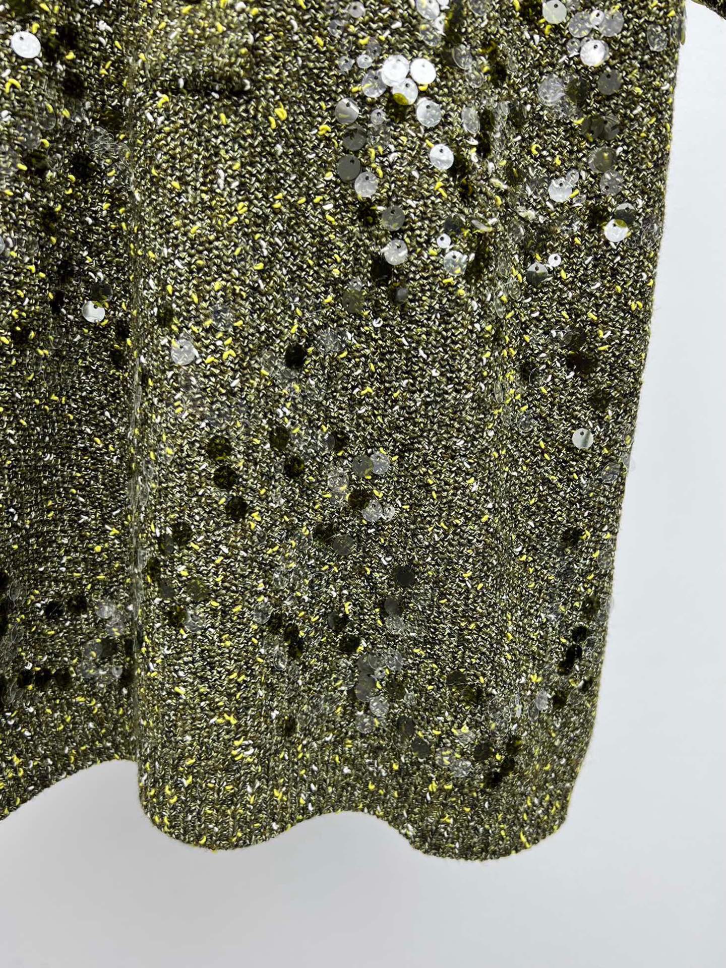 This tweed knit wool polo suit is embellished with sequin embroidery throughout
