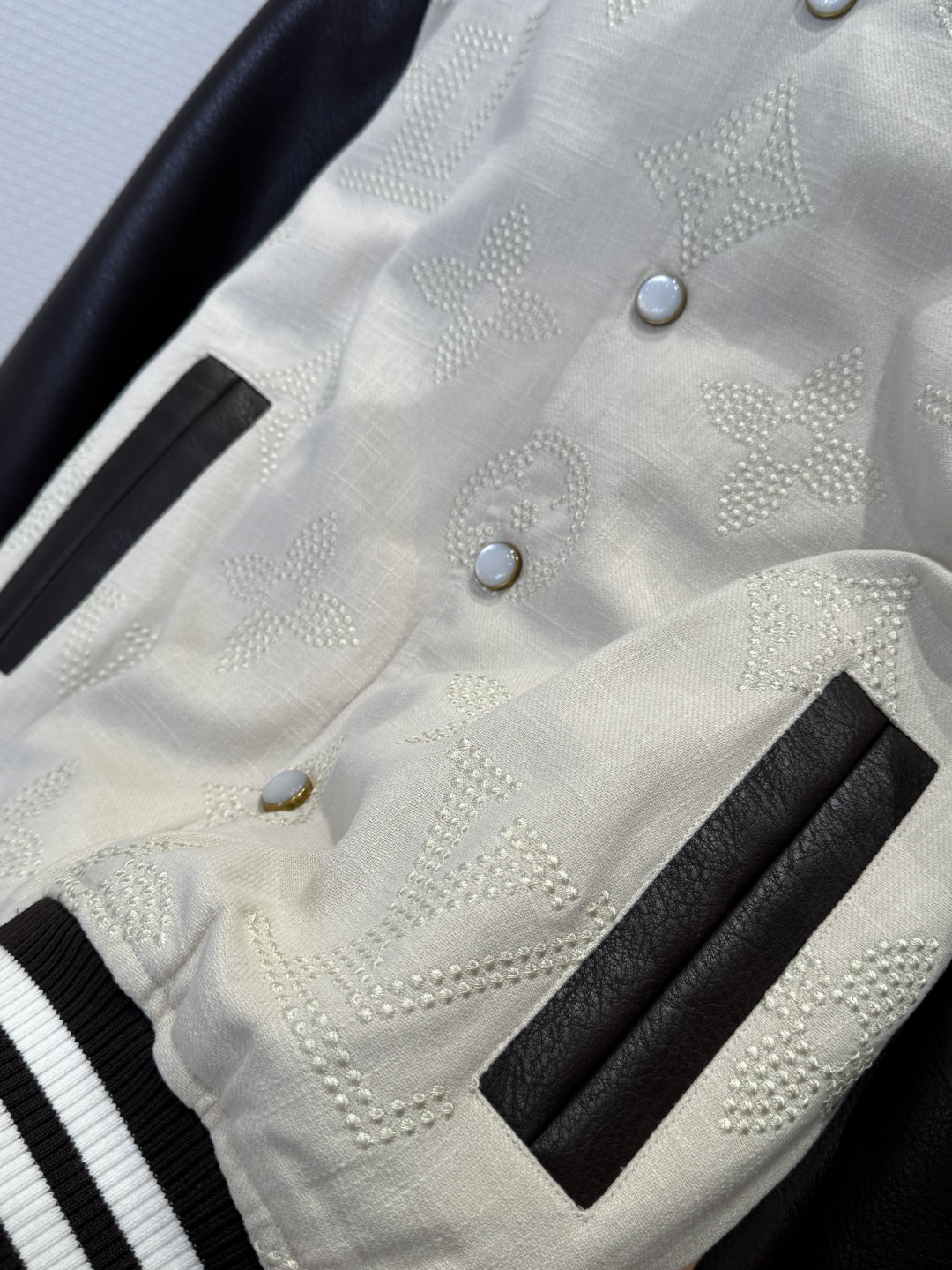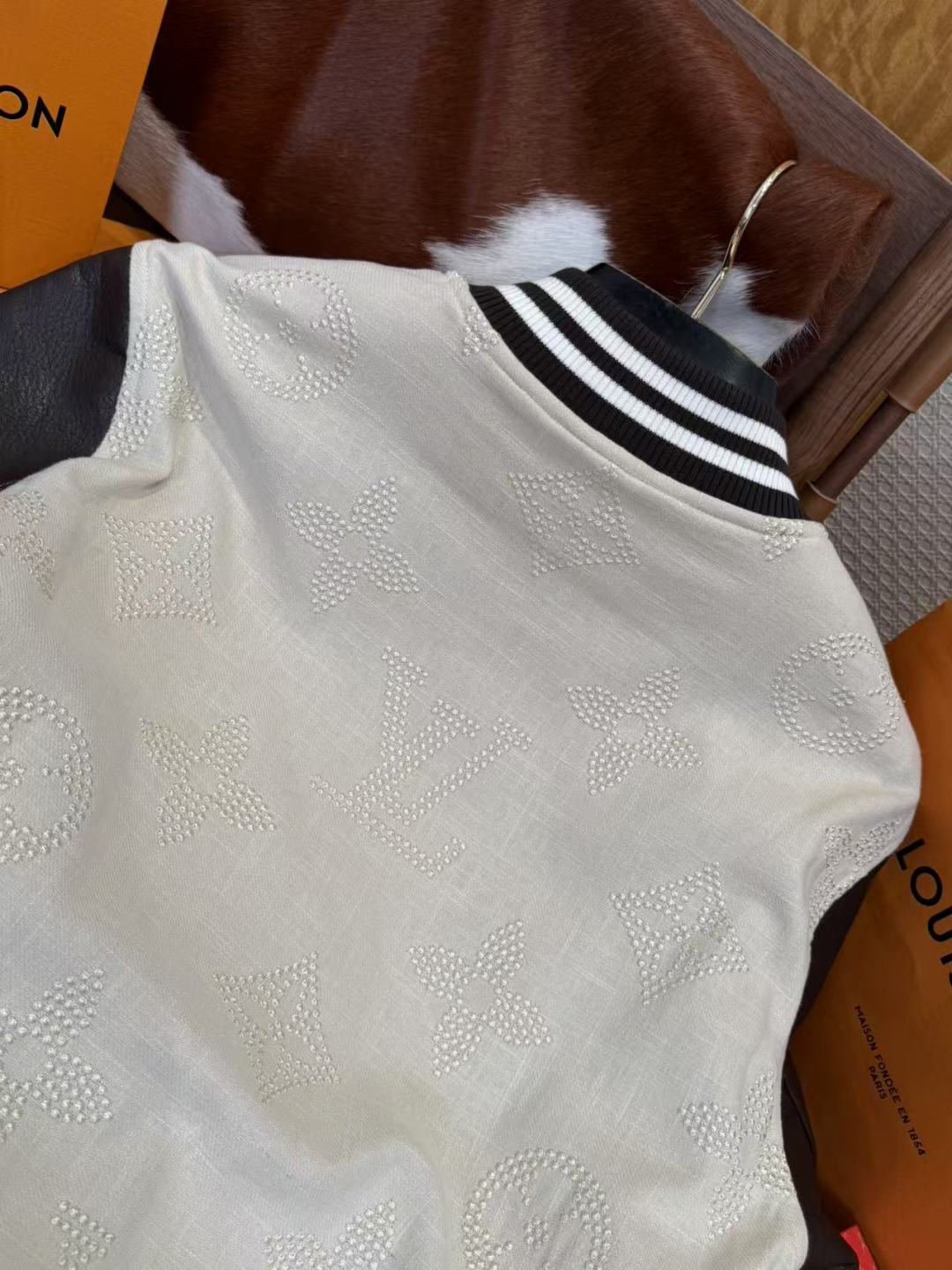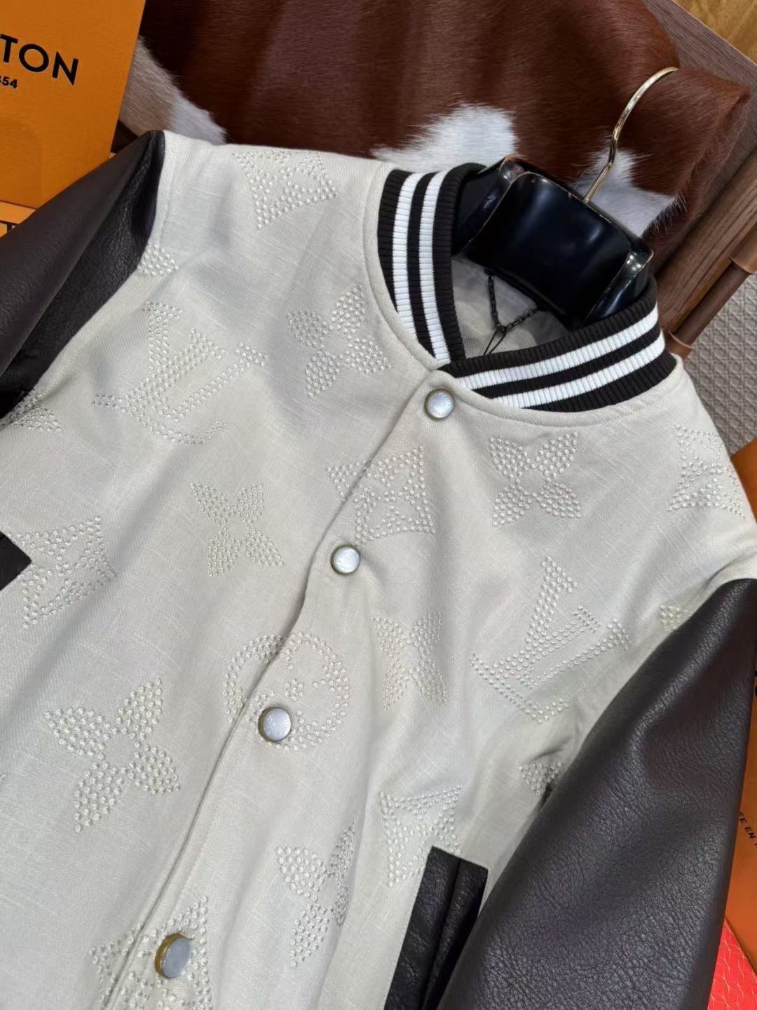 This jacket features soft jacquard lambswool in a Damier Buffalo check, highlighted with delicate beaded embroidery of the Marque L. Vuitton déposée logo. Pearl-finished buttons add a touch of refinement, while the sleeves are made from premium imported Australian cowhide.