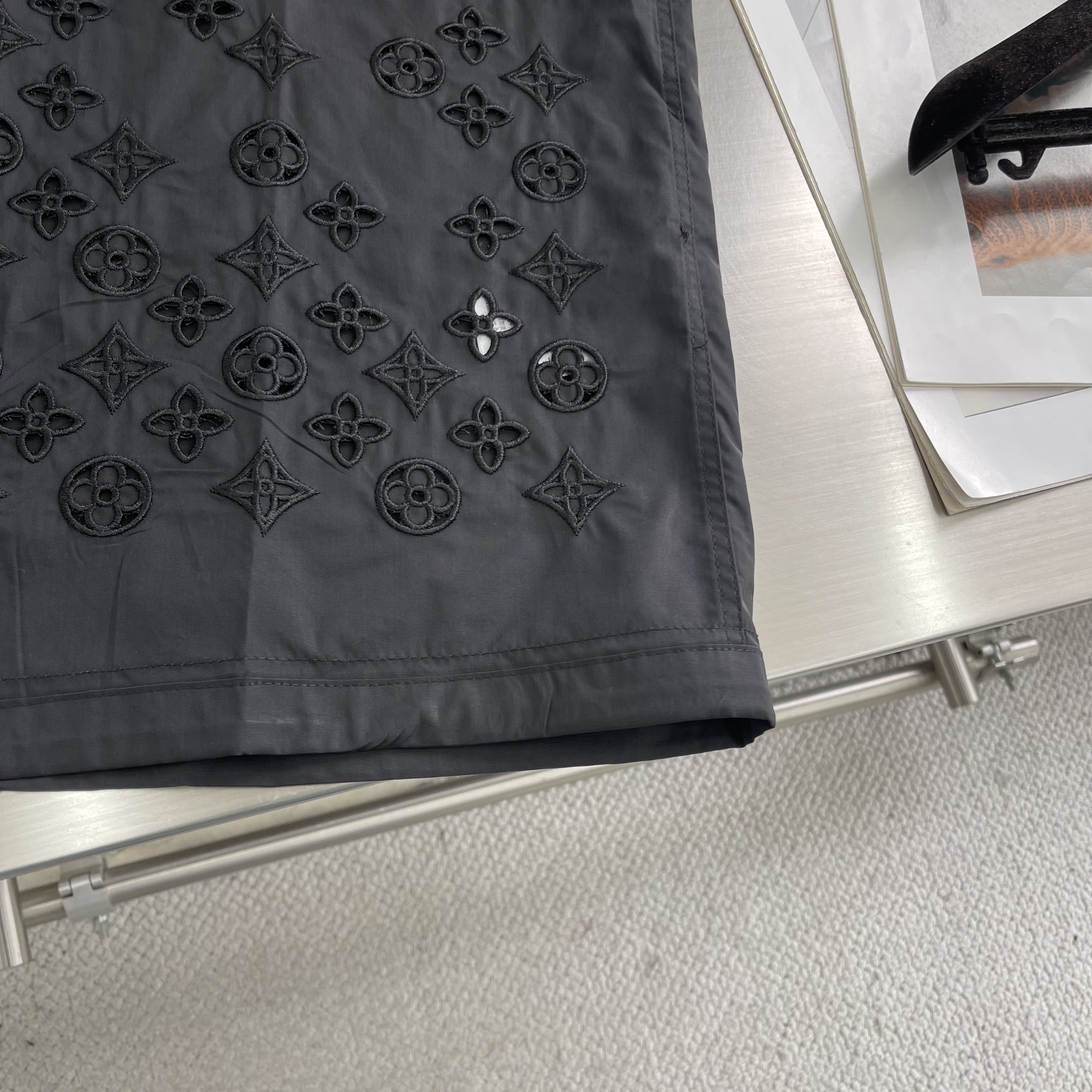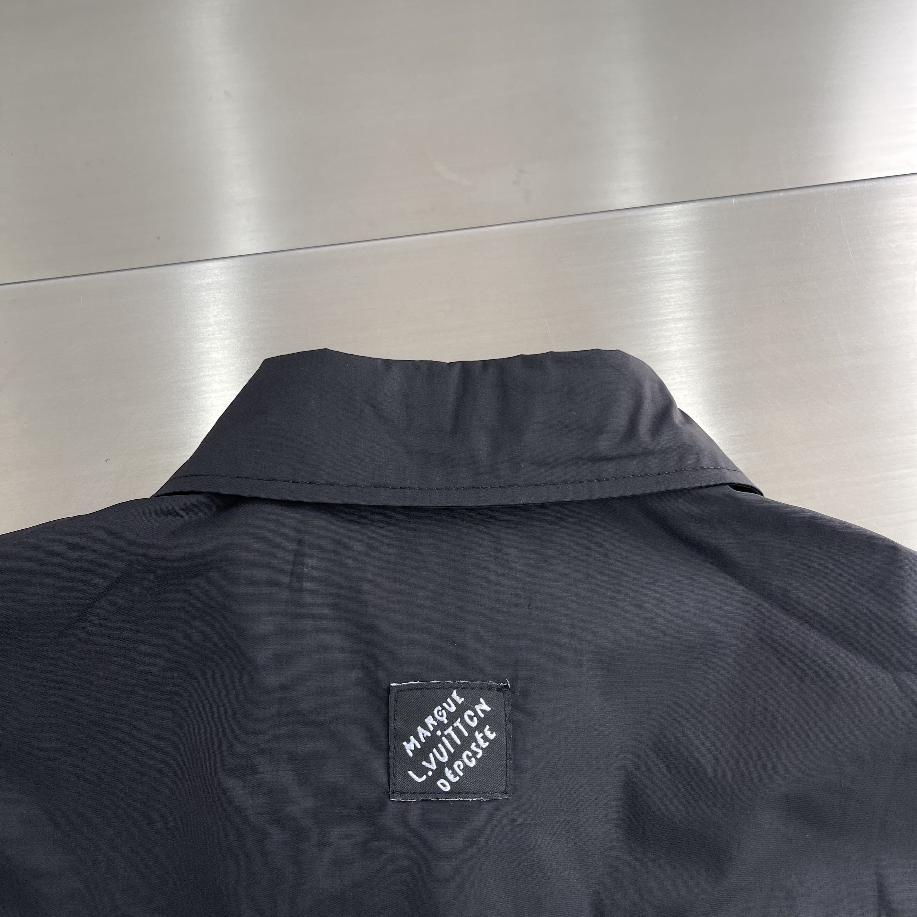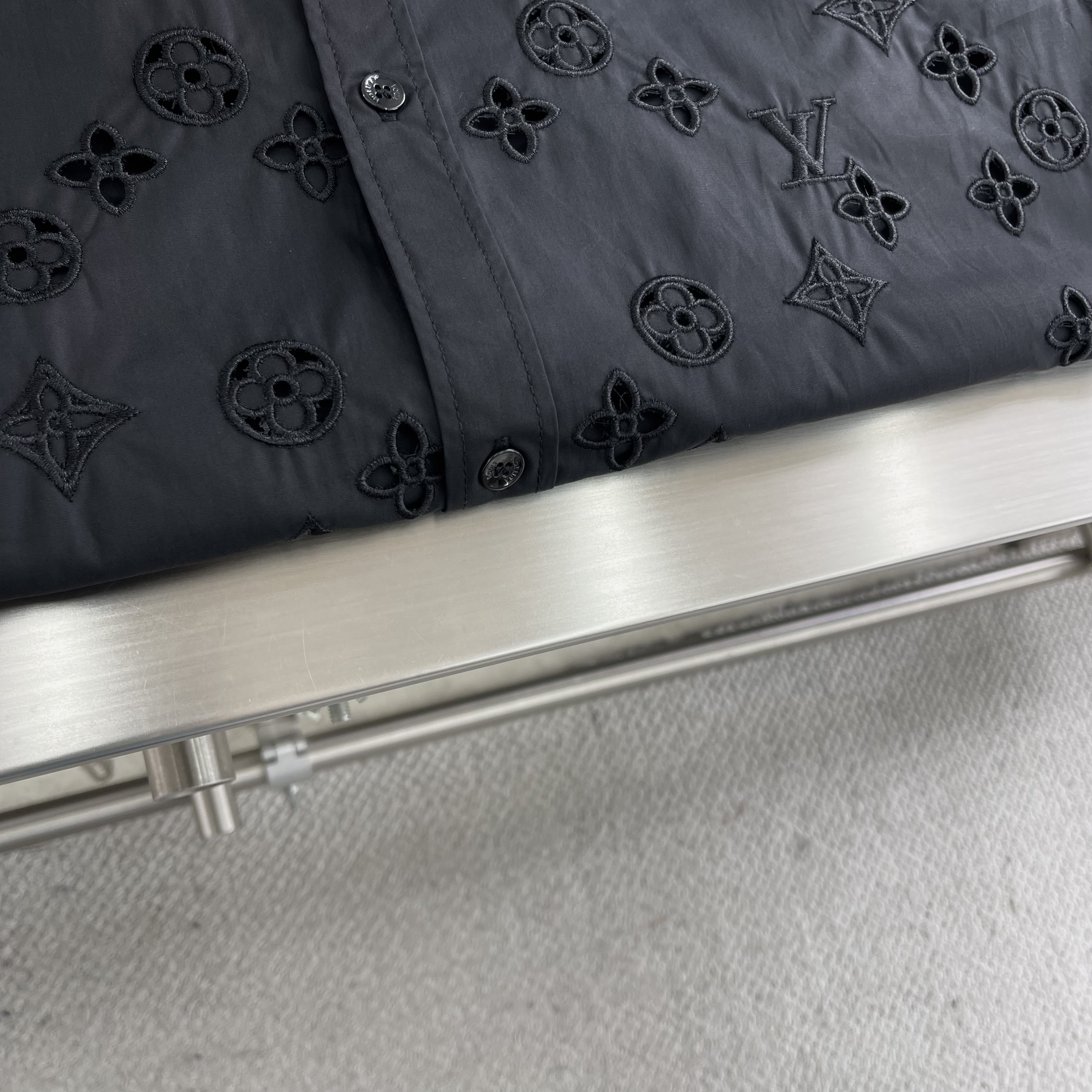 The classic short-sleeved shirt is reinvented with a drawstring waist and decorative embroidery. The smooth, black cotton poplin is adorned with tone-on-tone broderie anglaise Monogram Flowers in an elegant gradient effect with discreetly integrated LV signatures, while a Marque L.Vuitton Déposée patch signs the back. This versatile piece brings a fashion-forward accent to this collection’s preppy looks.