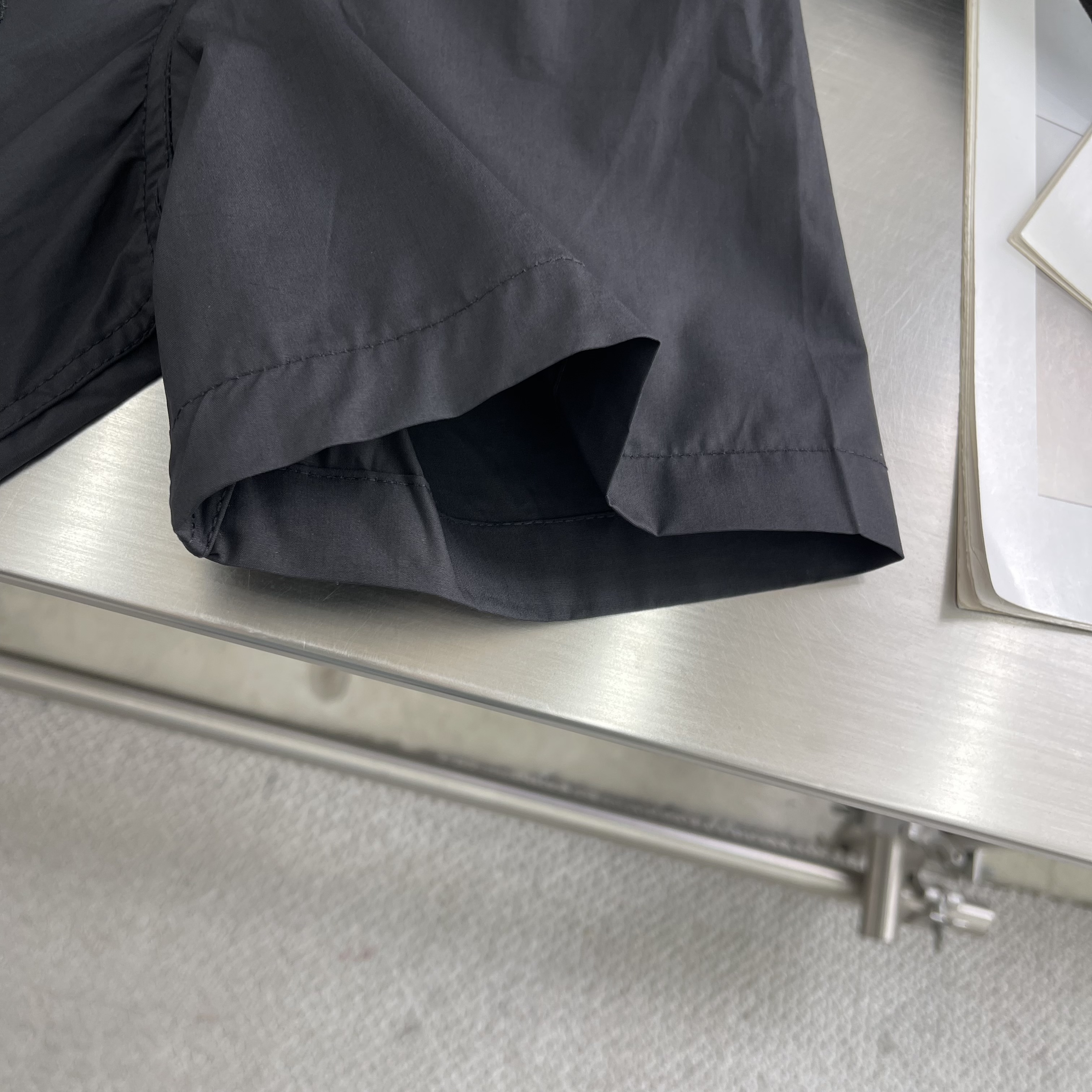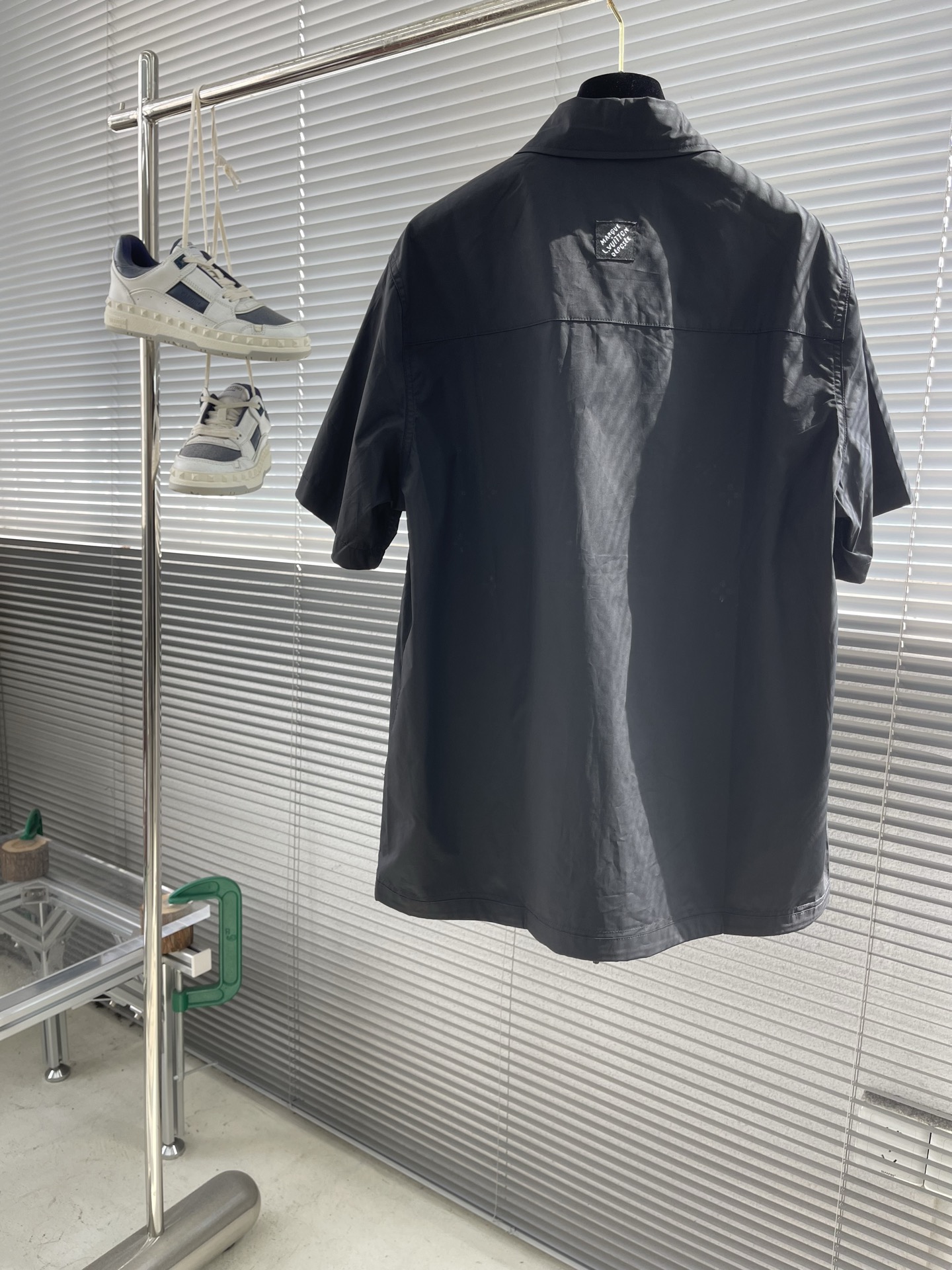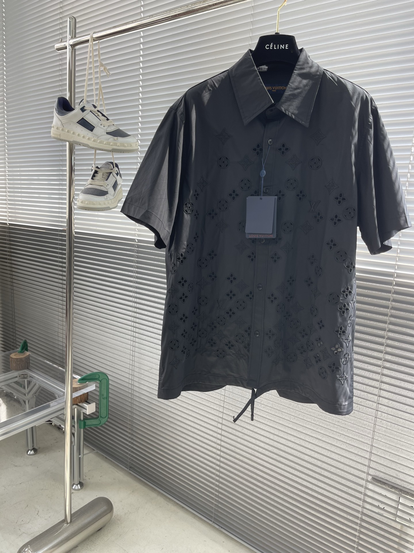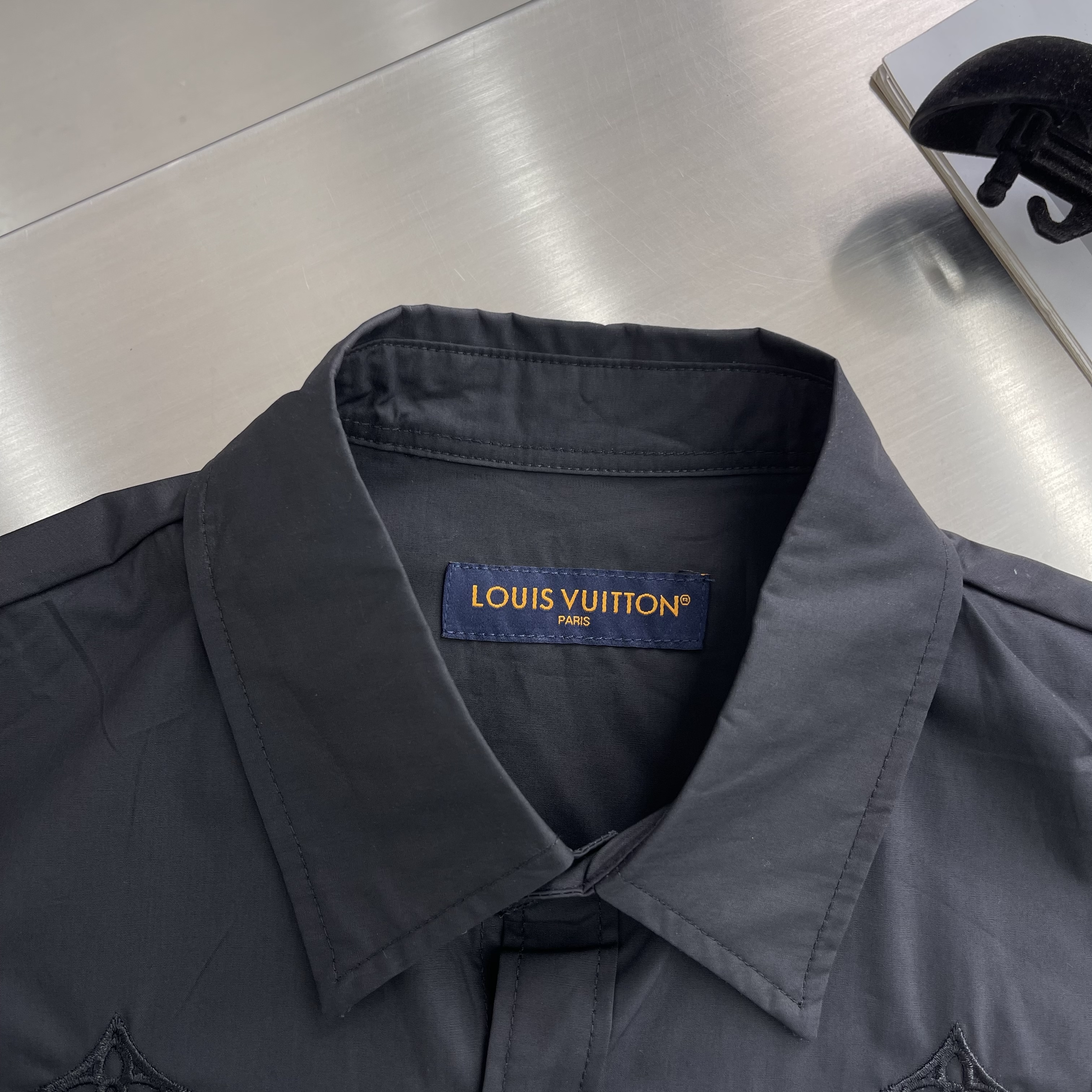 The classic short-sleeved shirt is reinvented with a drawstring waist and decorative embroidery. The smooth, black cotton poplin is adorned with tone-on-tone broderie anglaise Monogram Flowers in an elegant gradient effect with discreetly integrated LV signatures, while a Marque L.Vuitton Déposée patch signs the back. This versatile piece brings a fashion-forward accent to this collection’s preppy looks.