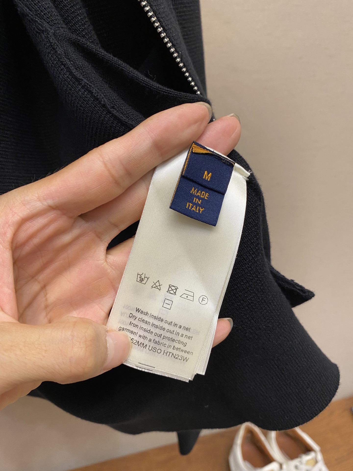 A light mid-season layer, this elegant black bomber in organic knitted cotton is perfect for lounging on the deck of this collection’s cruise ship. The zippered silhouette is accented with a crochet-style folded ribbed collar with a colorful checkered motif repeated on an embroidered LV patch on the chest. Matching pants make a chic yet casual set.