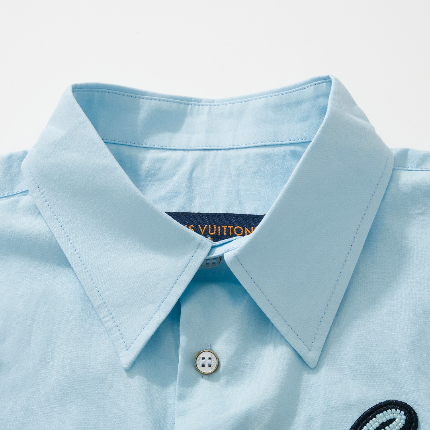 New LV embroidered cotton short-sleeved shirt, this cotton short-sleeved shirt interprets Dandy style, embroidery Ying ze handwritten Louis Vuitton decoration on the chest, can easily upgrade the daily style of men's wear, standard version, chest embroidery Ying ze 1V decoration, metallic pearl buttons. Fabric: 100% cotton, SIZE:S M L XL