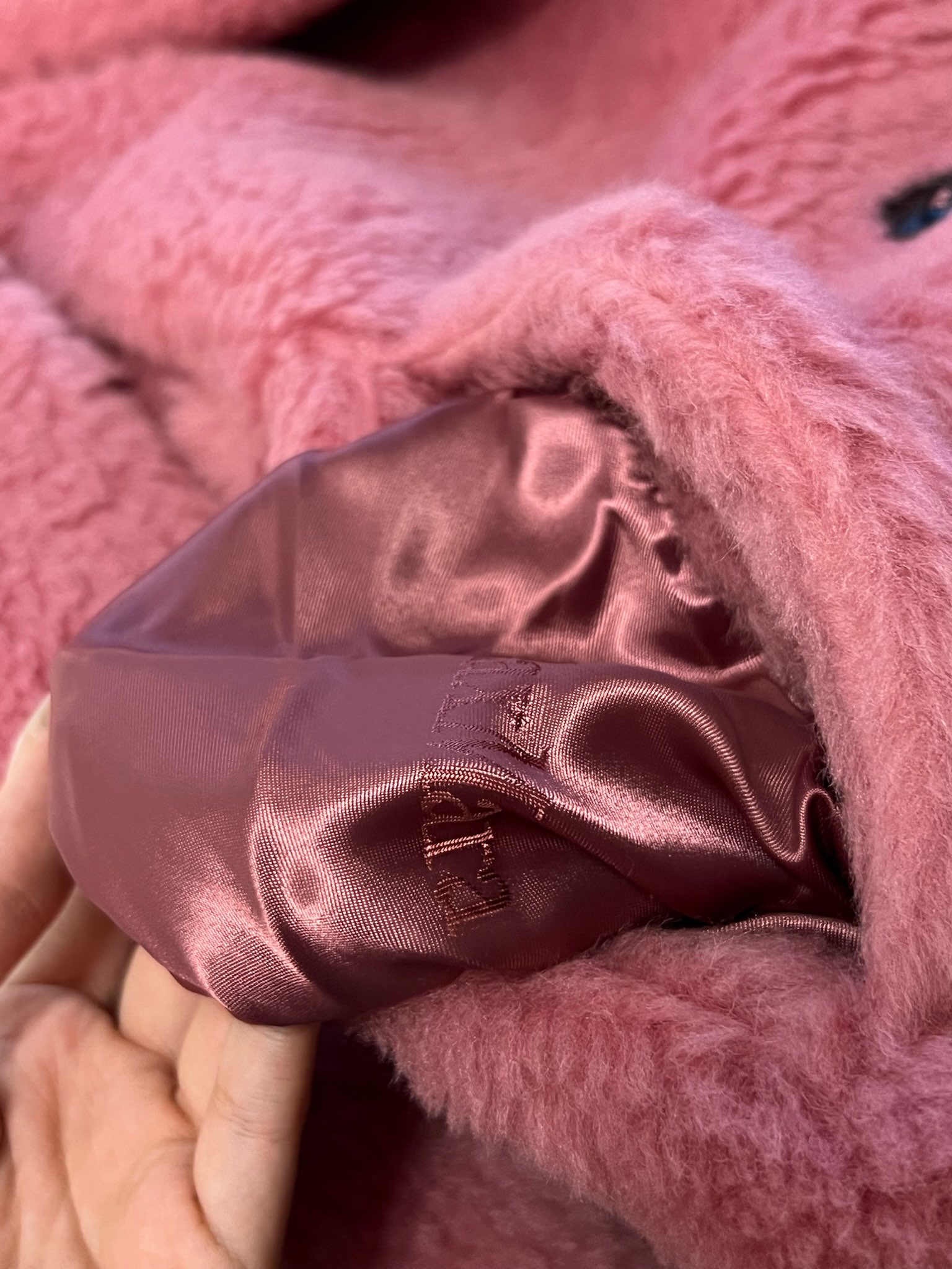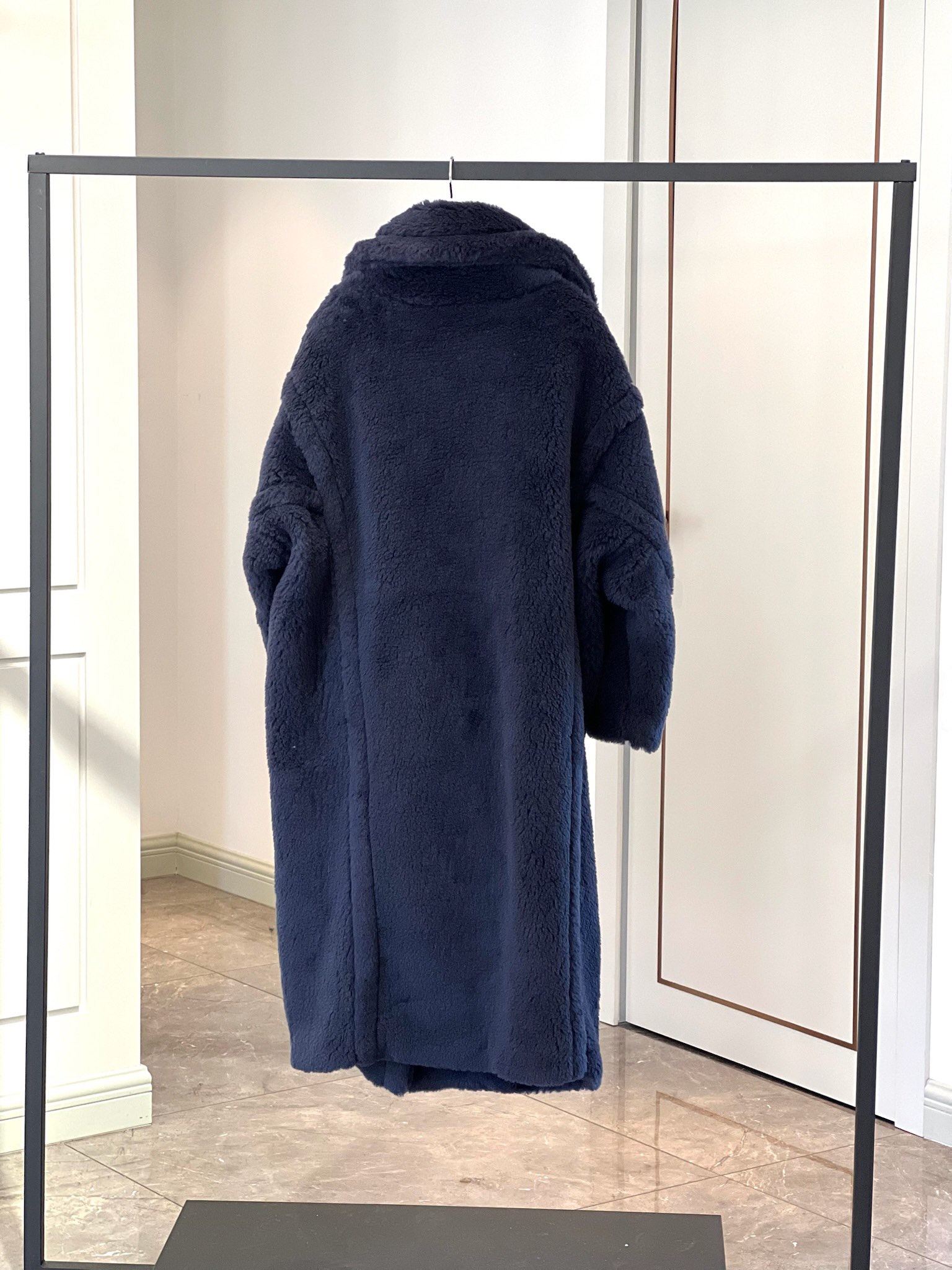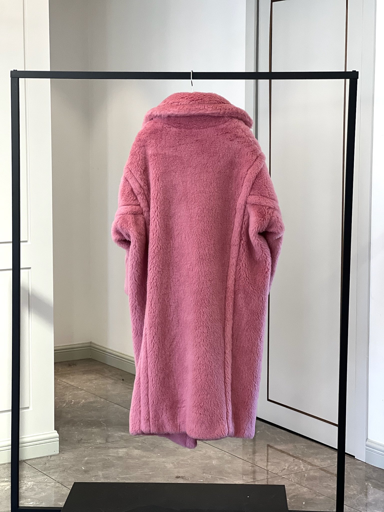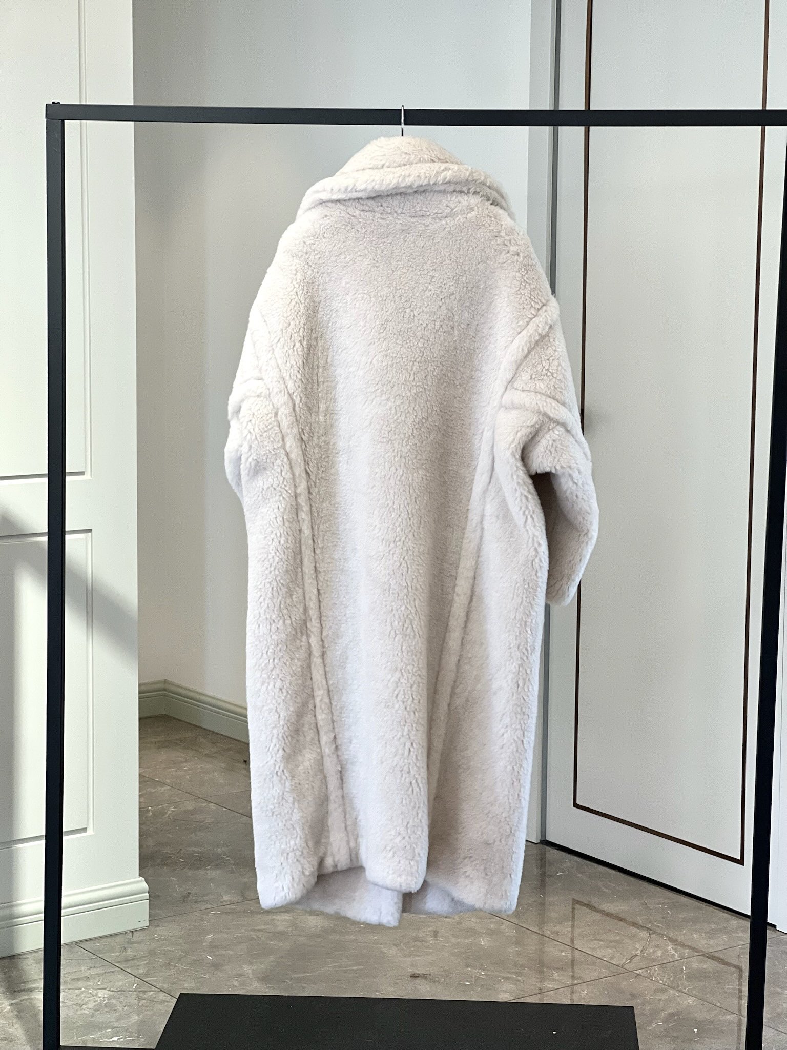 Designed in 2013, the Teddy Bear Coat was inspired by an archival garment from the '80s and immediately became an it-coat. Stars and influencers loved its perfect alchemic blend of glamour and playfulness. Its special alpaca wool texture on a silk base is created using sophisticated technology developed by the creative team with an Italian supplier, capable of producing a unique faux fur. The coat's abundant volume is a celebration of the opulent extravagance of this fabric. Made of alpaca and wool on a silk base. Oversized fit Lapel collar Dropped set-in sleeves Horizontal welt pockets Double-breasted closure Branded lining Horn buttons Length: 110 cm / 43 inches