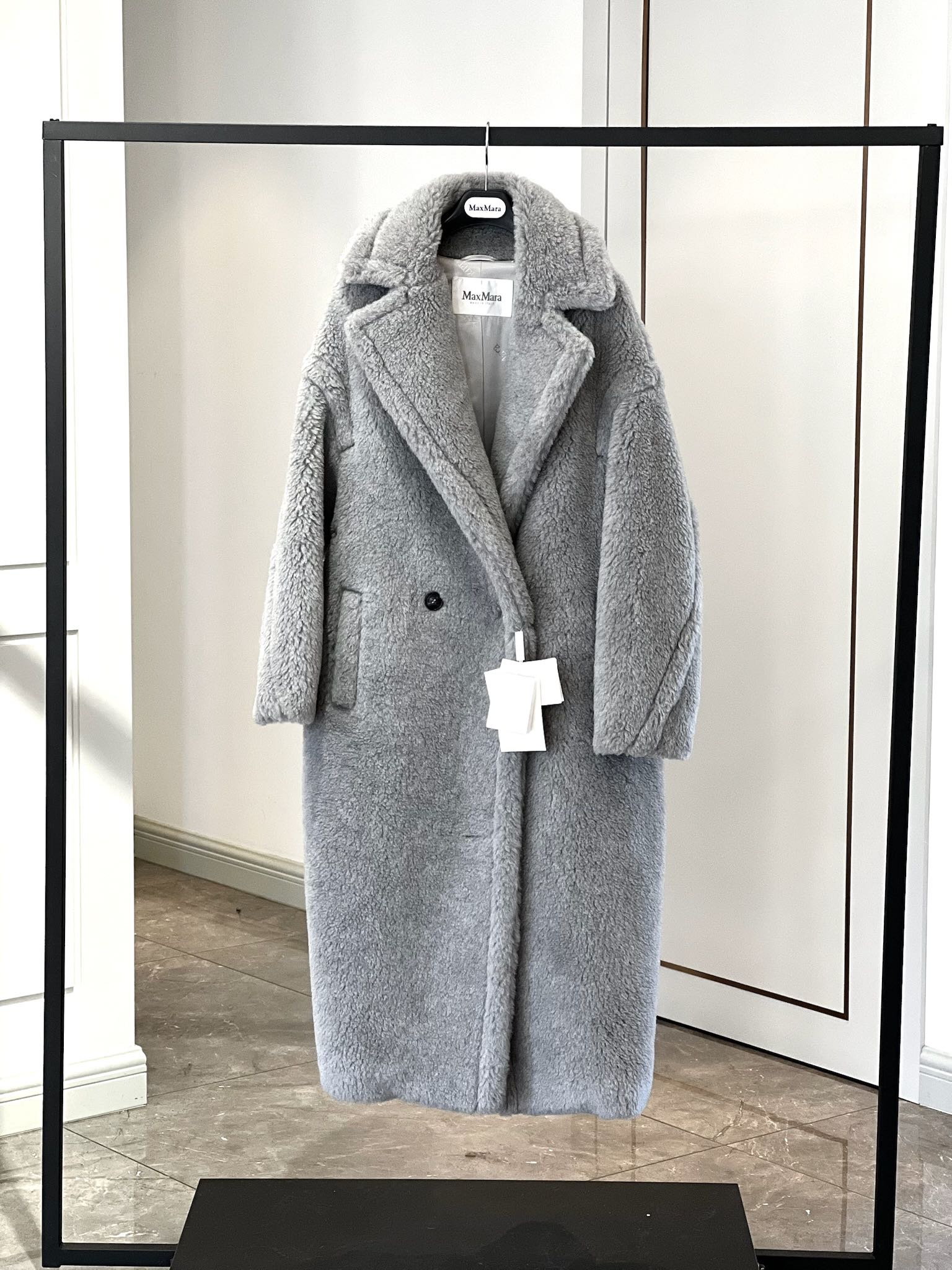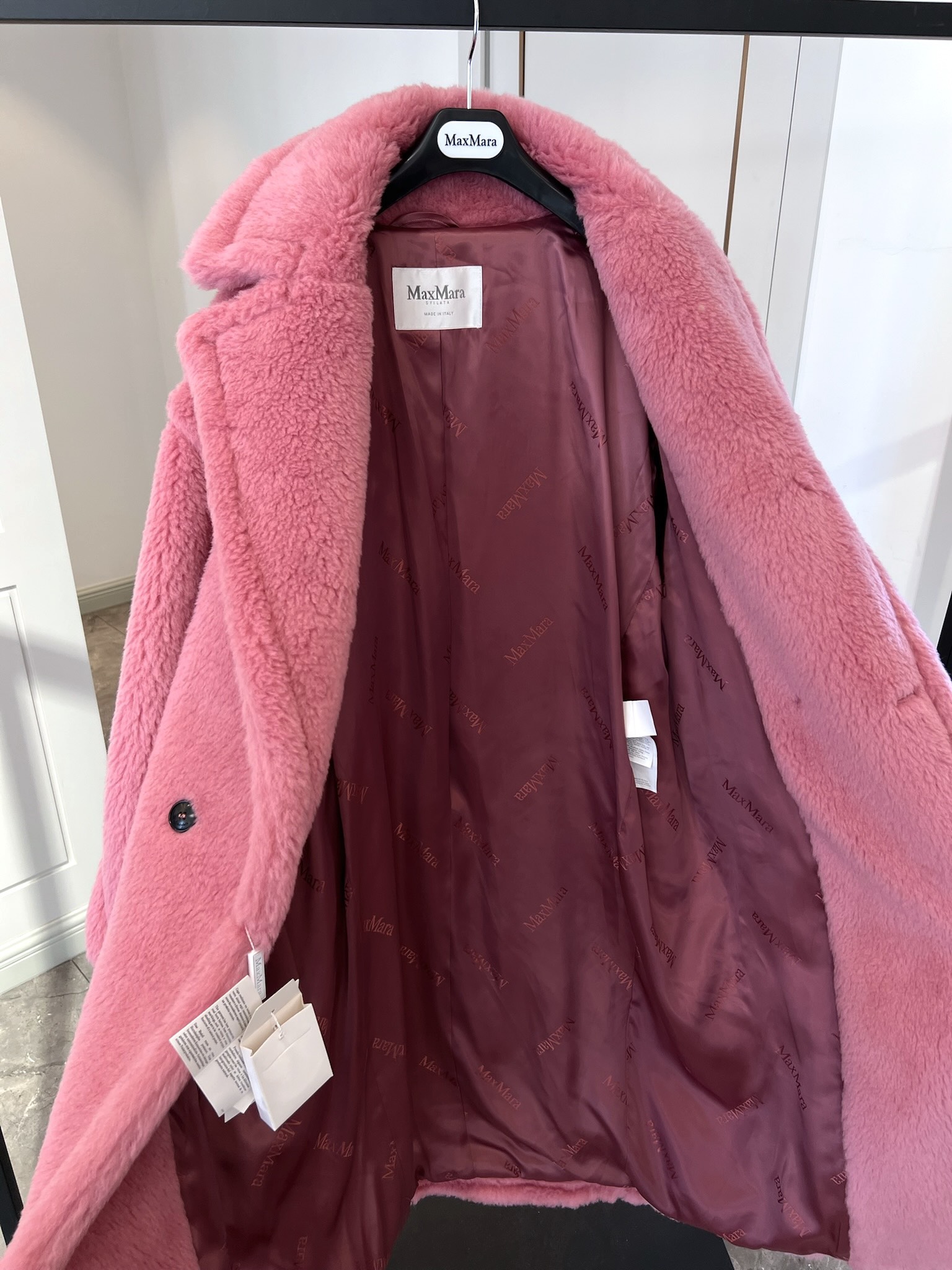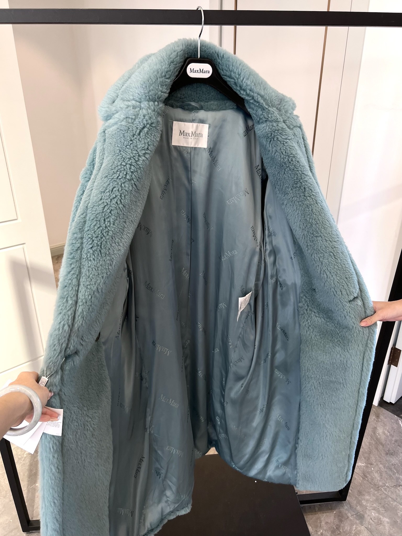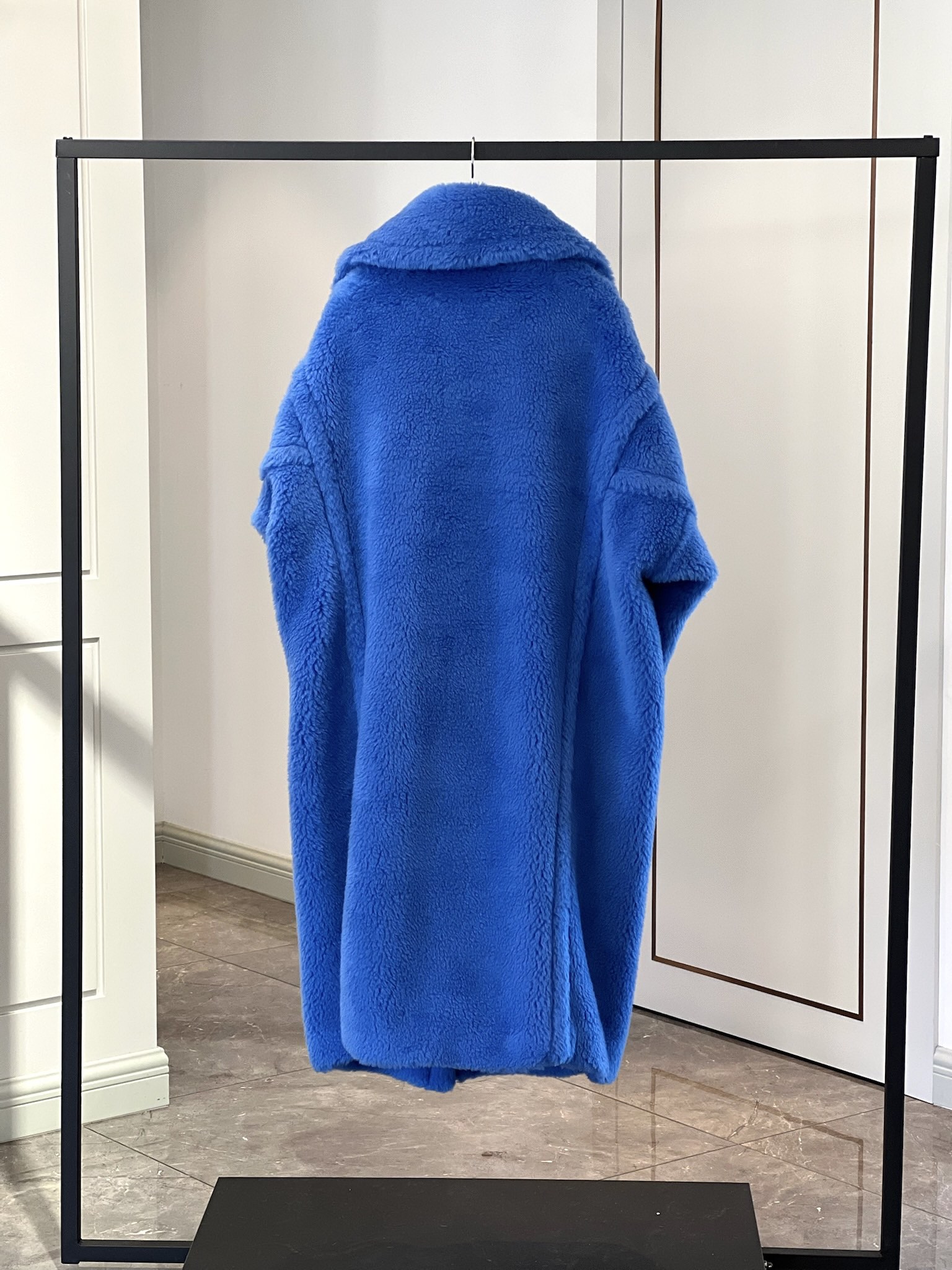 Designed in 2013, the Teddy Bear Coat was inspired by an archival garment from the '80s and immediately became an it-coat. Stars and influencers loved its perfect alchemic blend of glamour and playfulness. Its special alpaca wool texture on a silk base is created using sophisticated technology developed by the creative team with an Italian supplier, capable of producing a unique faux fur. The coat's abundant volume is a celebration of the opulent extravagance of this fabric. Made of alpaca and wool on a silk base. Oversized fit Lapel collar Dropped set-in sleeves Horizontal welt pockets Double-breasted closure Branded lining Horn buttons Length: 110 cm / 43 inches