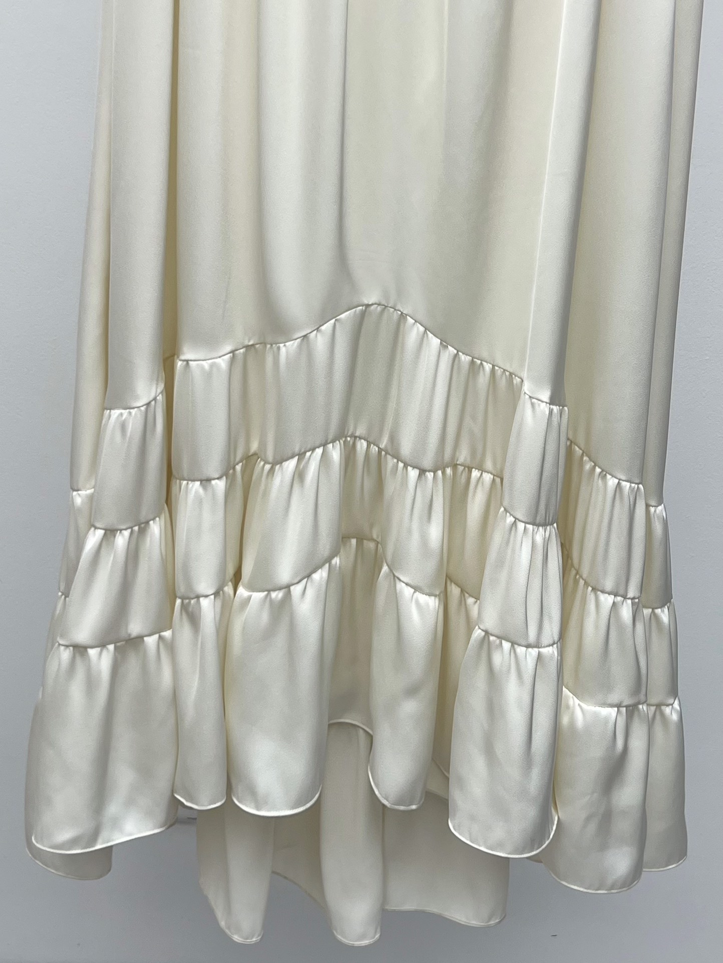 The asymmetrical ruffled hem flows gracefully with every step, creating a fluid, goddess-like silhouette.