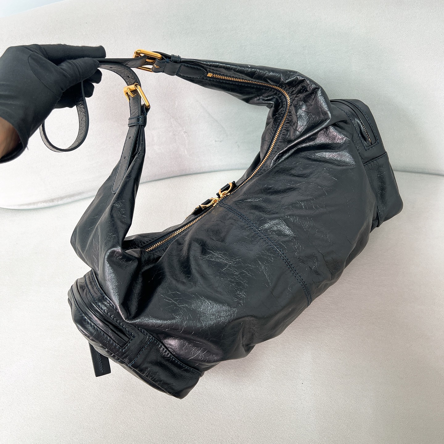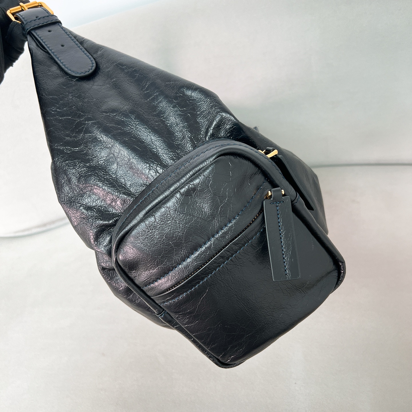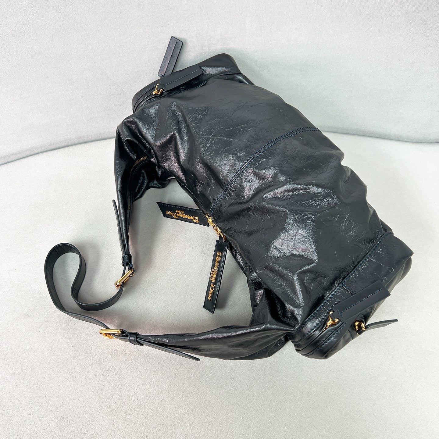 New for Fall 2025, the Grand Tour Multipocket bag is an ultra-practical creation combining modernity with refined detailing. Crafted in black crinkled calfskin, the supple design features a spacious main compartment with two large leather zipper pulls with gold-finish metal Christian Dior Paris signatures. Two zipped double pockets on the sides provide access to small essentials. Equipped with an adjustable leather strap, the large versatile bag can be worn over the shoulder or crossbody with any of the season's looks.