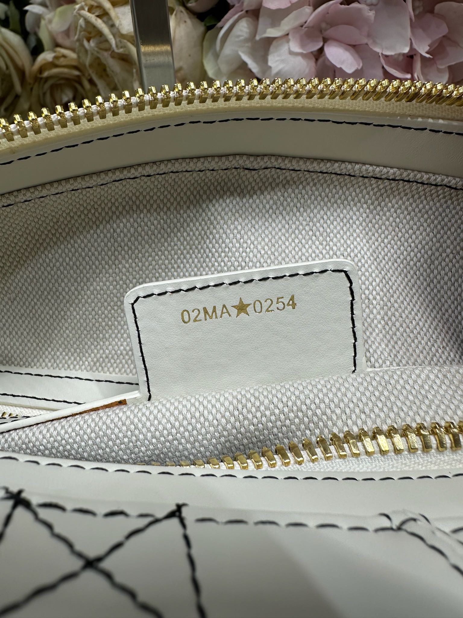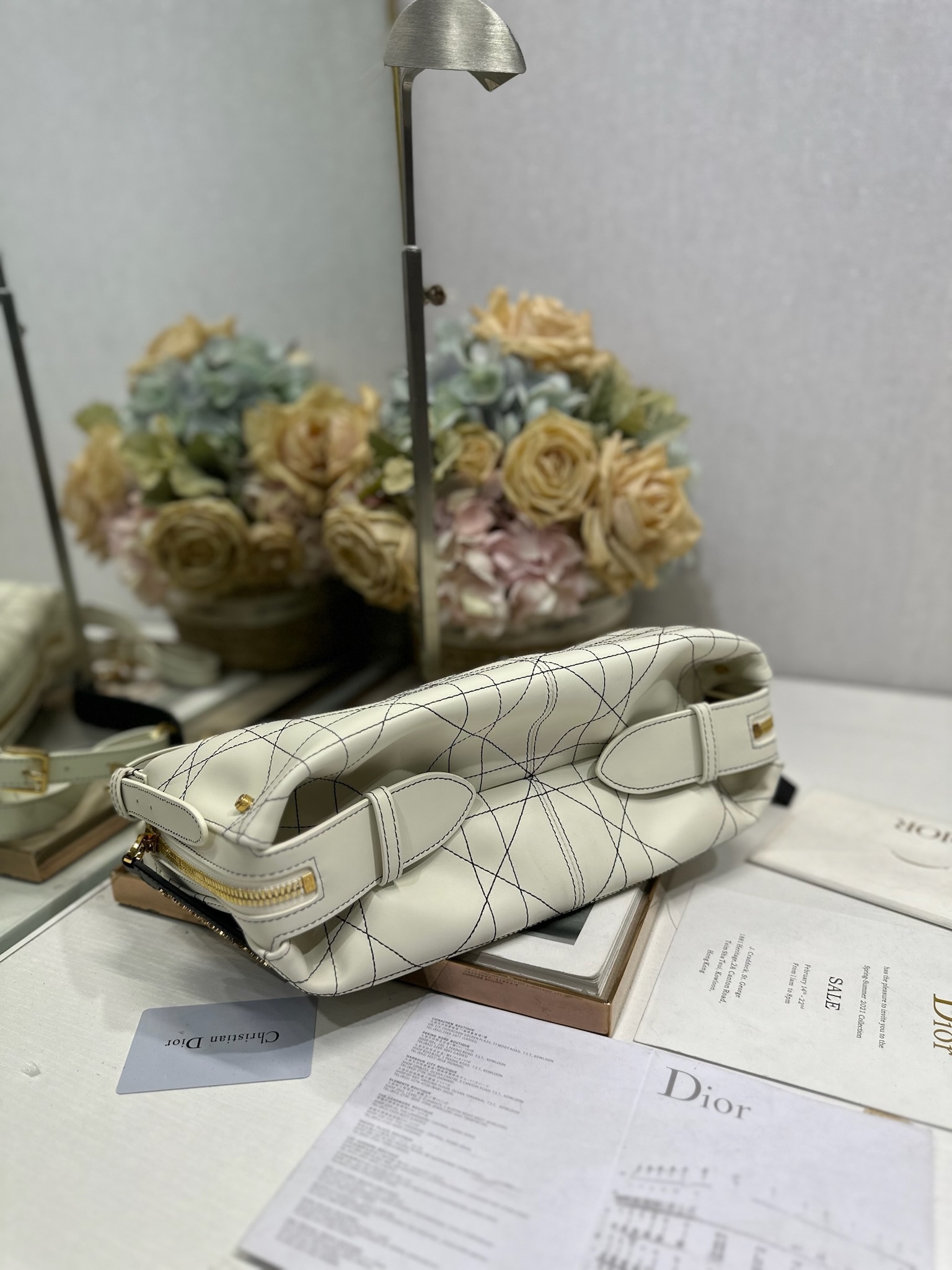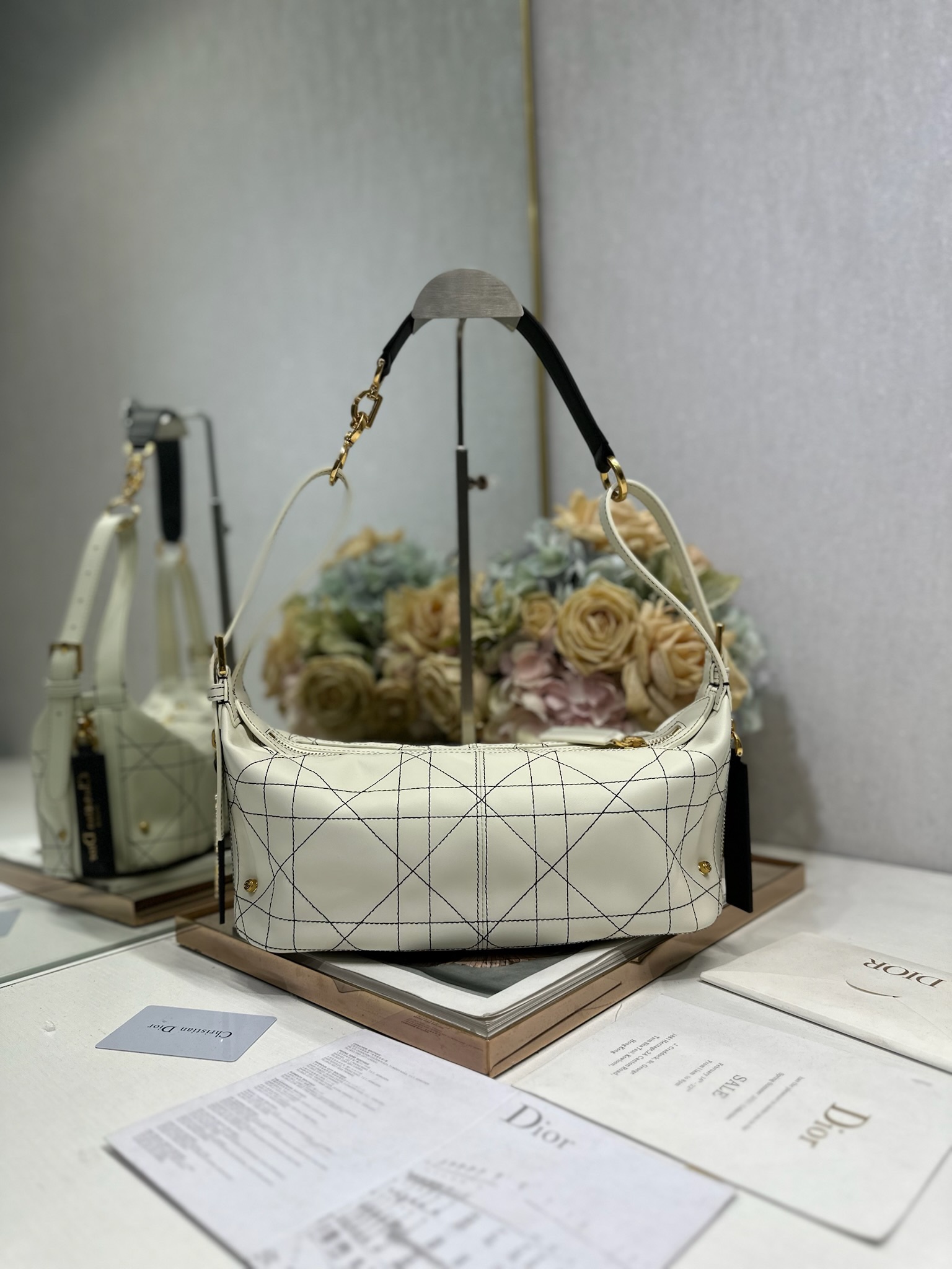 The D-Journey Handbag features a soft texture and a modern take on the classic dumpling bag silhouette. It is meticulously crafted from white calfskin leather, adorned with an oversized flat wicker pattern, and reinterprets Dior’s iconic motif with contrasting black stitching. The main compartment is equipped with a zip pocket for added refinement, while two side decorative pockets with large leather zipper pulls are embellished with the Christian Dior Paris logo.