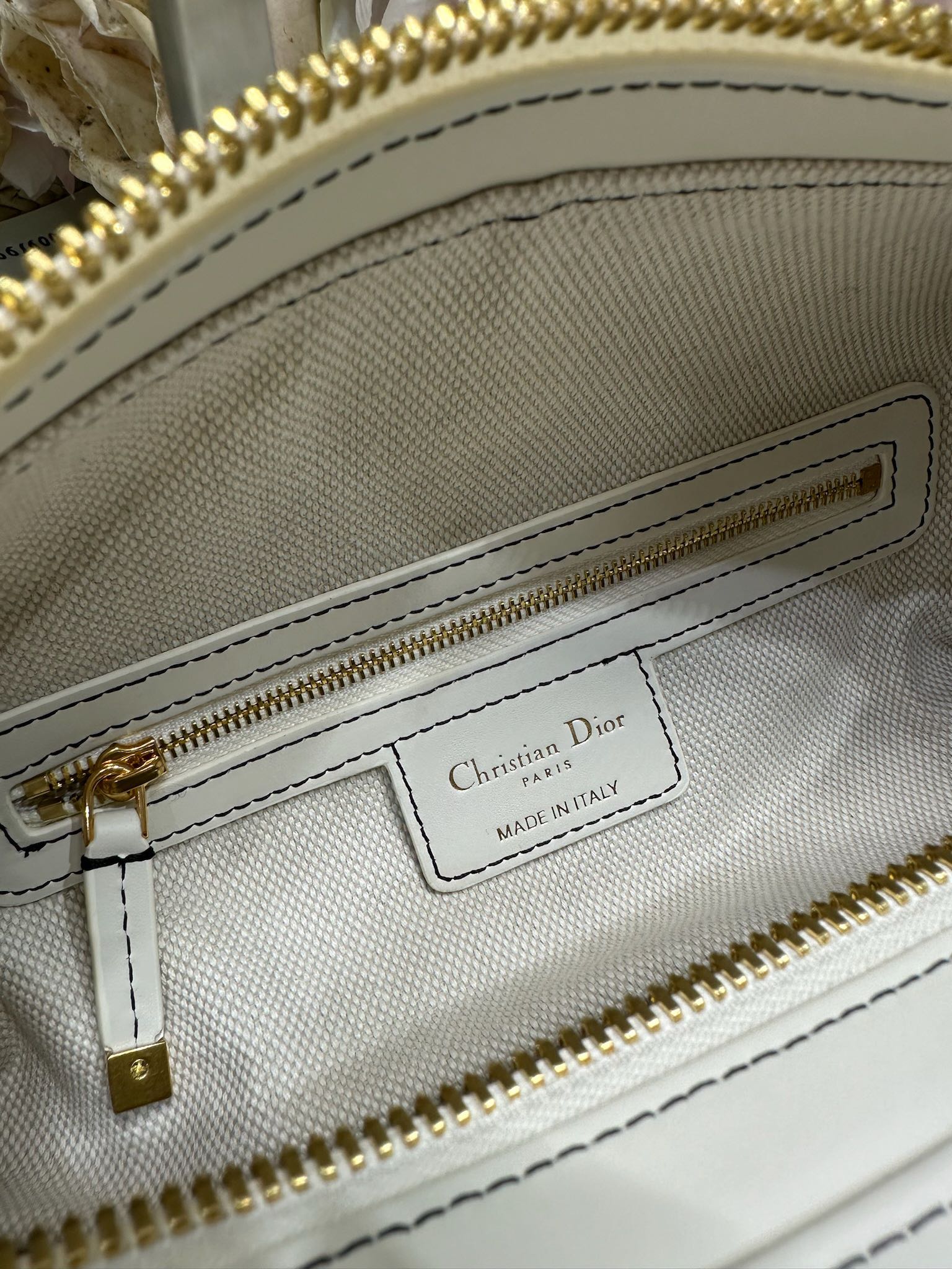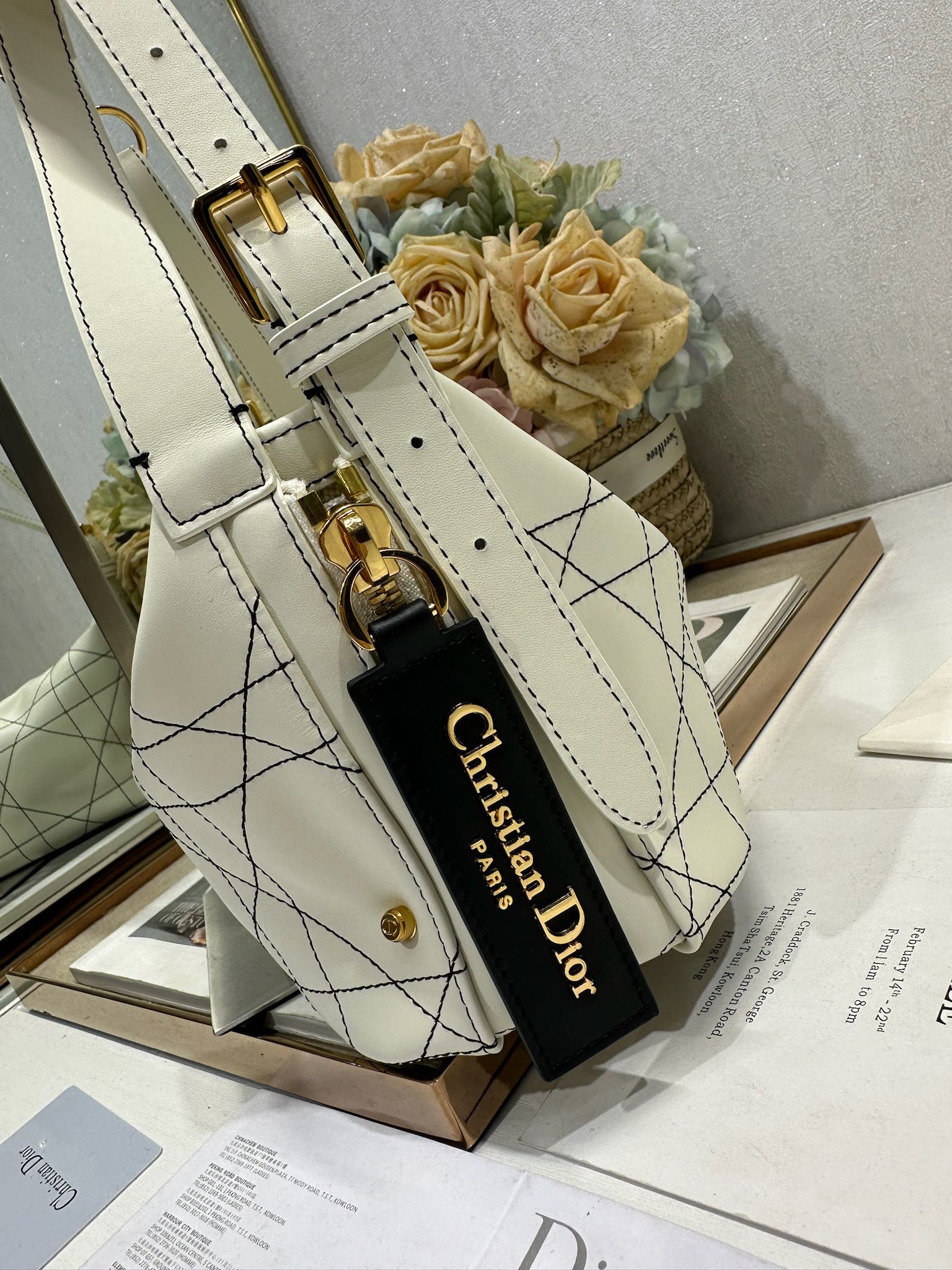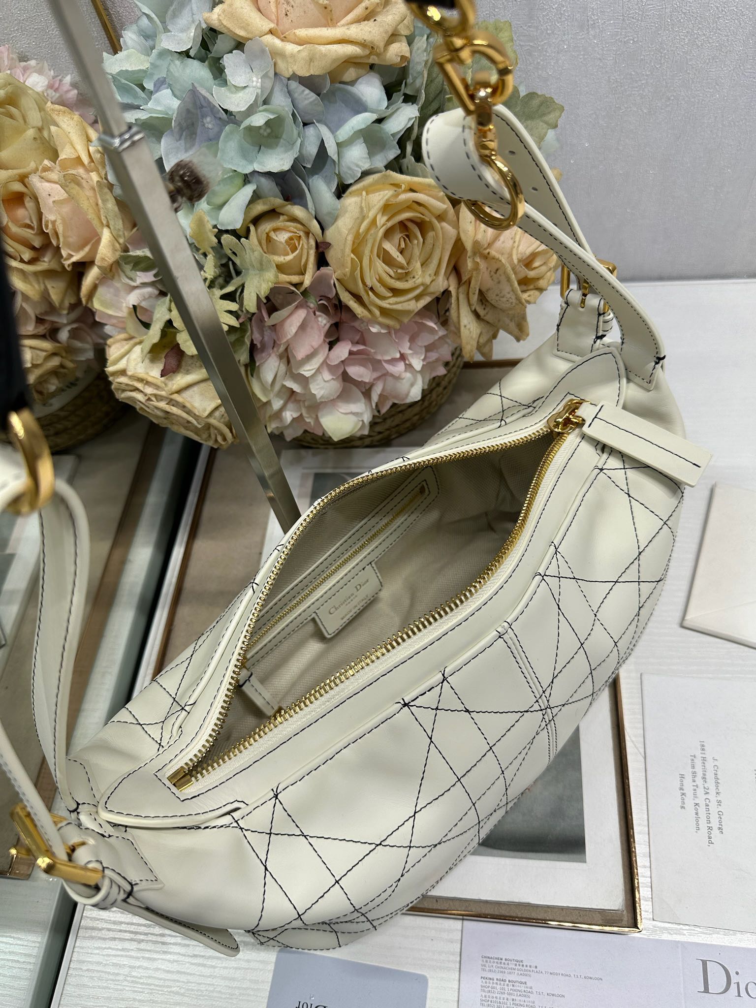 The D-Journey Handbag features a soft texture and a modern take on the classic dumpling bag silhouette. It is meticulously crafted from white calfskin leather, adorned with an oversized flat wicker pattern, and reinterprets Dior’s iconic motif with contrasting black stitching. The main compartment is equipped with a zip pocket for added refinement, while two side decorative pockets with large leather zipper pulls are embellished with the Christian Dior Paris logo.
