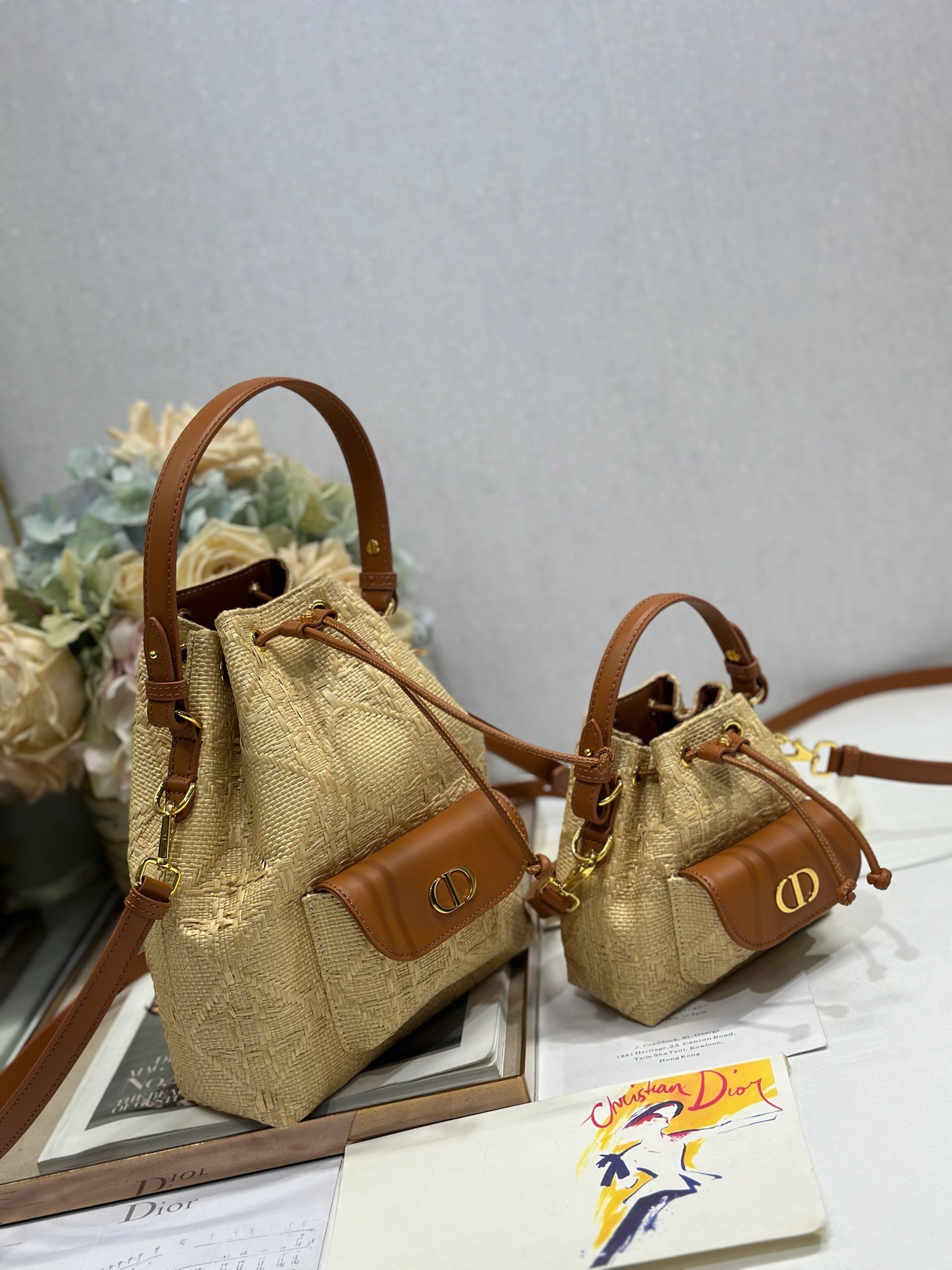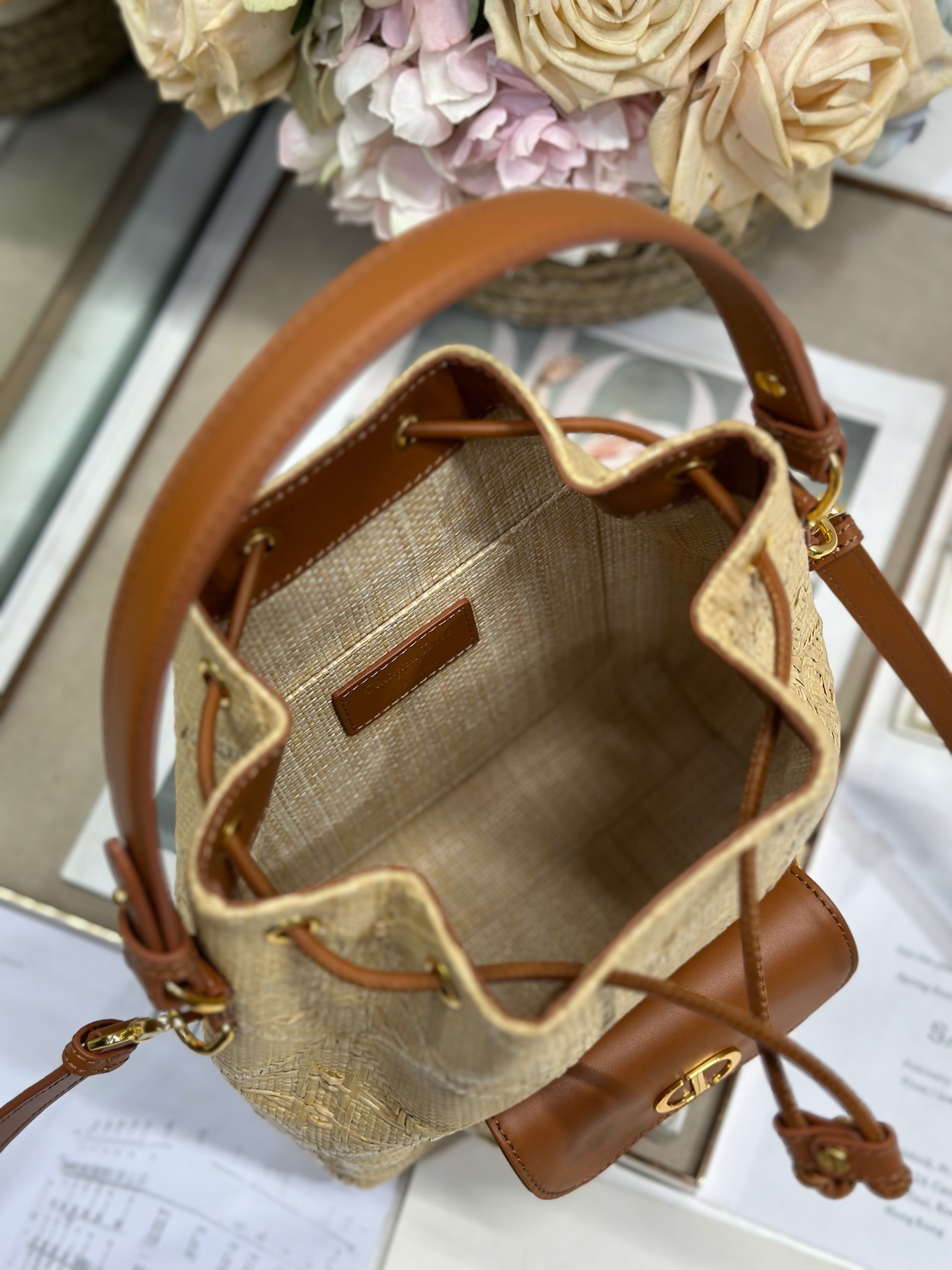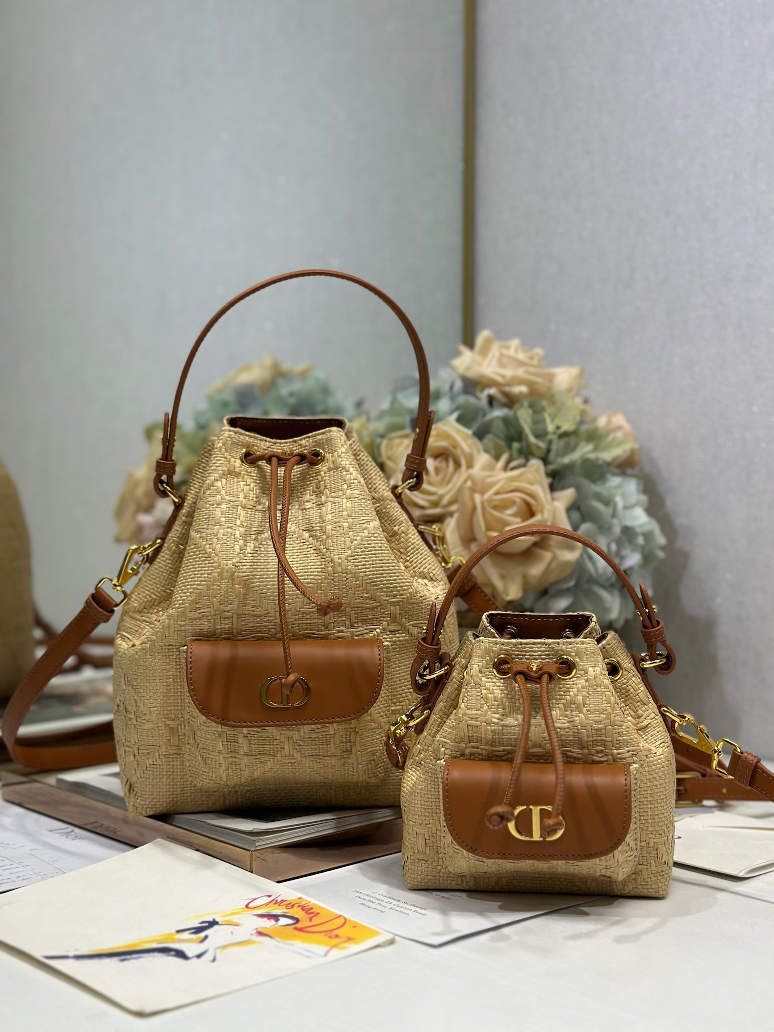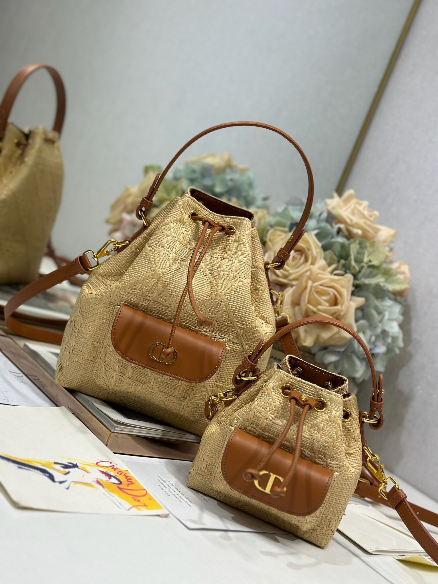 This small Dior Caro bucket bag is a new arrival from the 2025 Fall Ready-to-Wear collection, embodying a refined and elegant style. Carefully crafted from natural raffia and other materials, it features an oversized cannage quilted pattern and a spacious drawstring compartment.