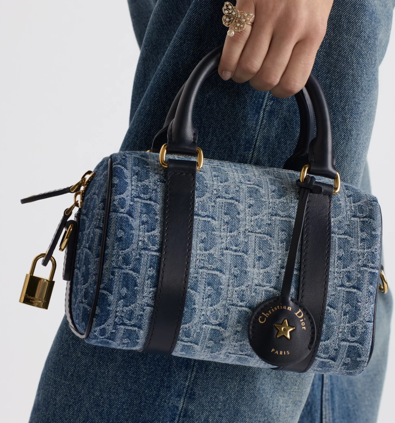 The Dior Groove 20 bag is an elegant and modern style designed by Maria Grazia Chiuri. Constructed in blue Denim Dior Oblique jacquard, offering a new take on the iconic House motif with the modern appeal of an irregular stonewashed effect, it stands out with a leather key holder engraved with the Christian Dior Paris signature and a gold-finish star. The attached key opens the zipper padlock to reveal a spacious compartment that can accommodate all the essentials, completed by a slip pocket and a zip pocket. Featuring leather top handles and an adjustable, removable strap, the bag can be carried by hand, worn over the shoulder or crossbody as an ideal daily companion.
