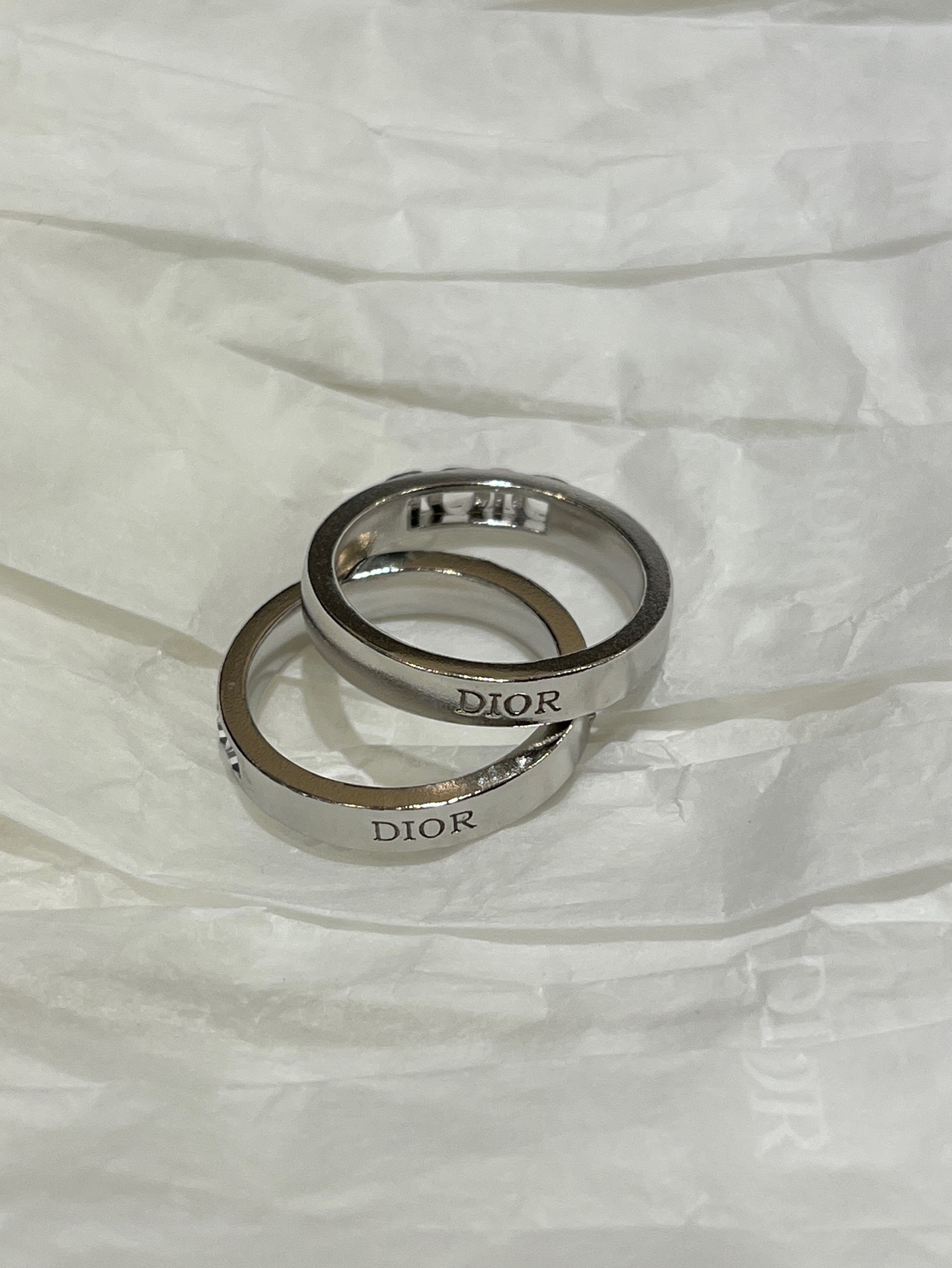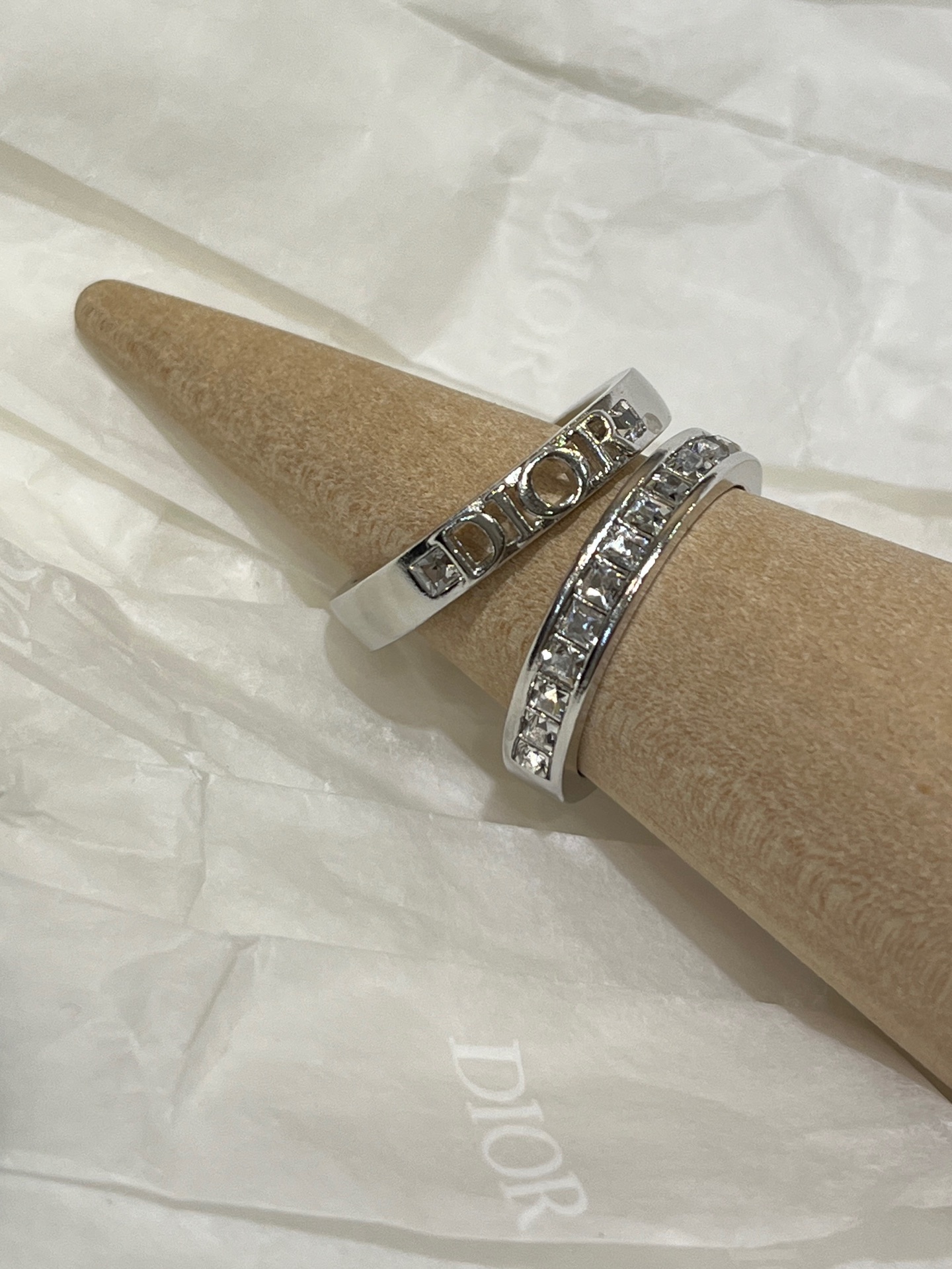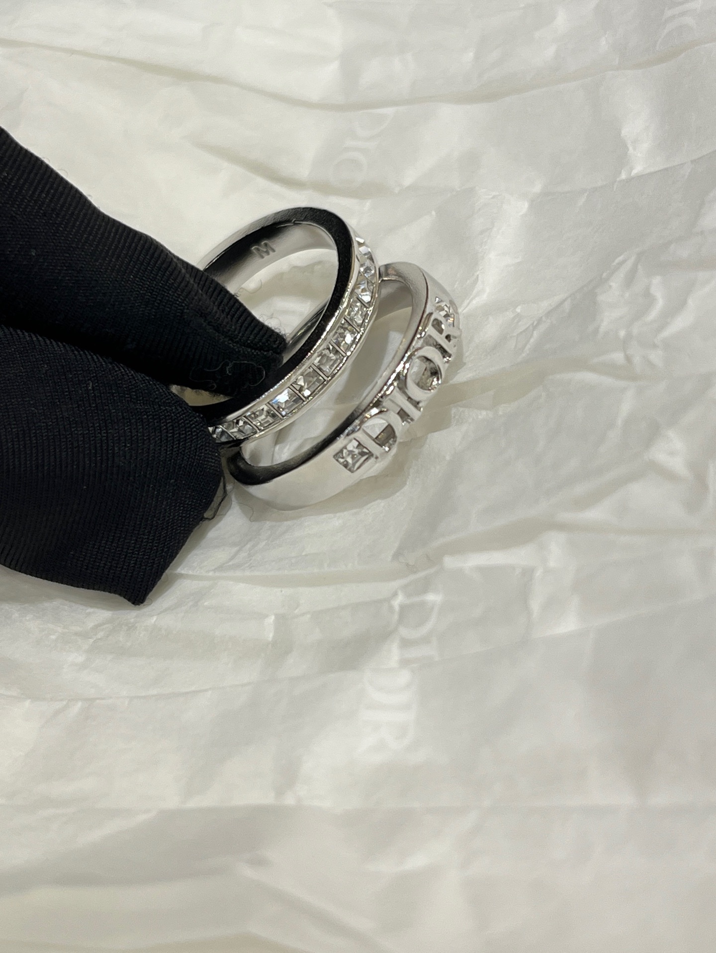 Elegant and minimalist Dior-inspired ring set featuring a silver letter ring paired with a square rhinestone ring. Versatile design, perfect for daily wear. Made with sparkling Swarovski crystals.