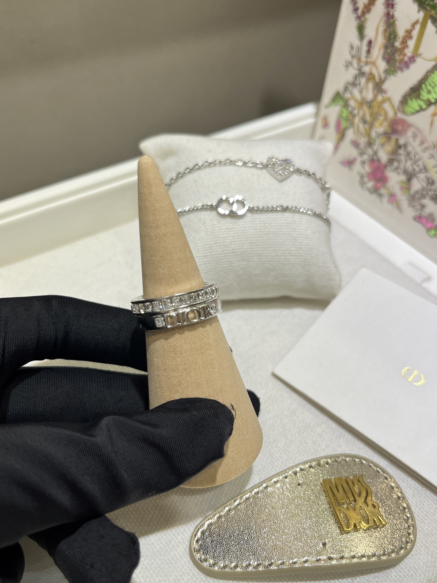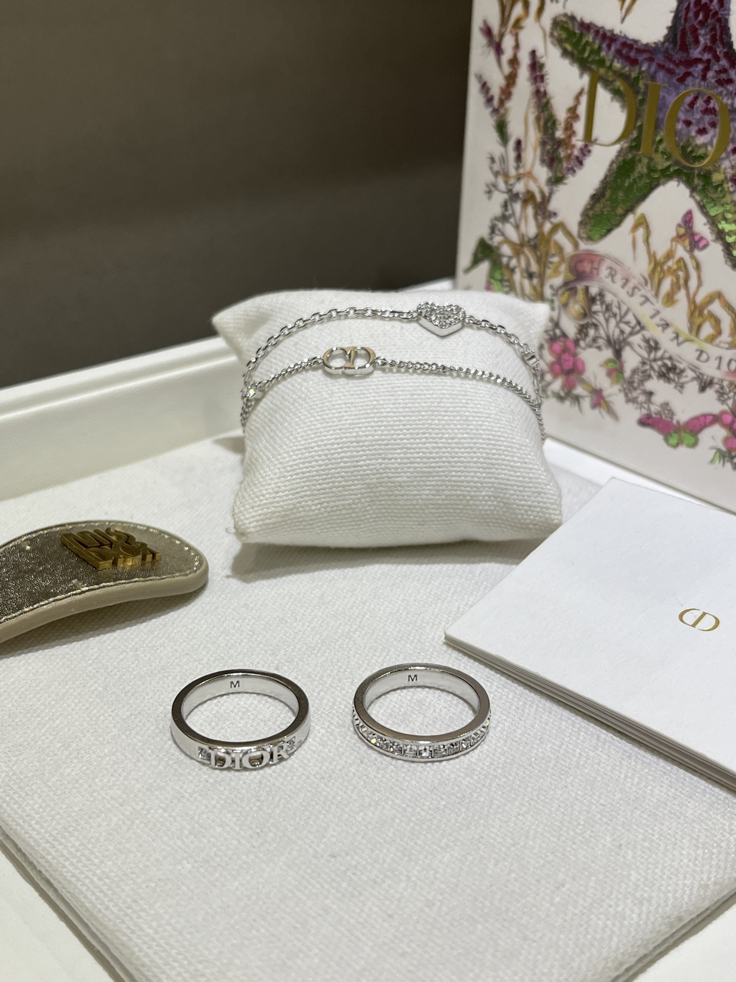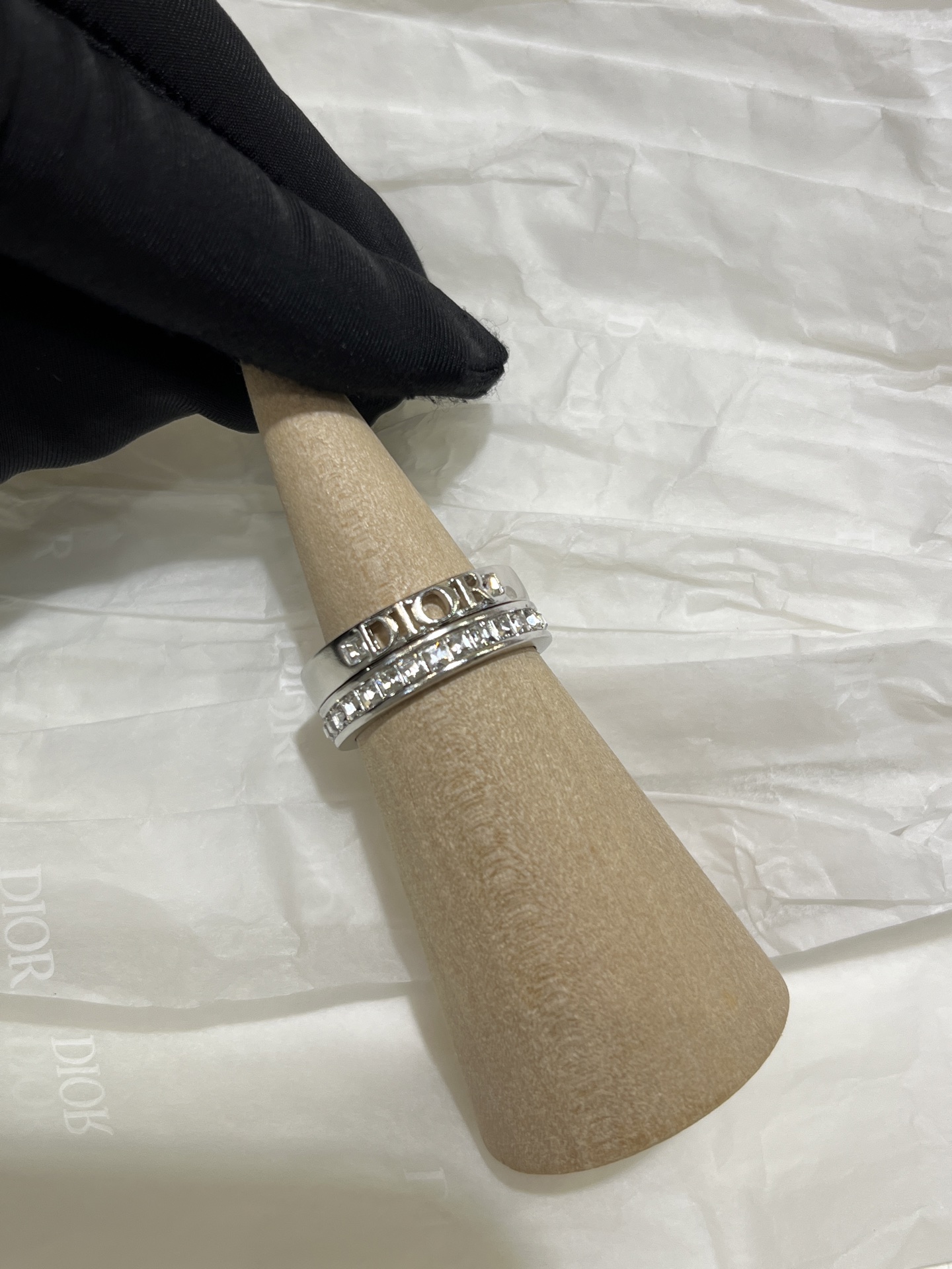 Elegant and minimalist Dior-inspired ring set featuring a silver letter ring paired with a square rhinestone ring. Versatile design, perfect for daily wear. Made with sparkling Swarovski crystals.