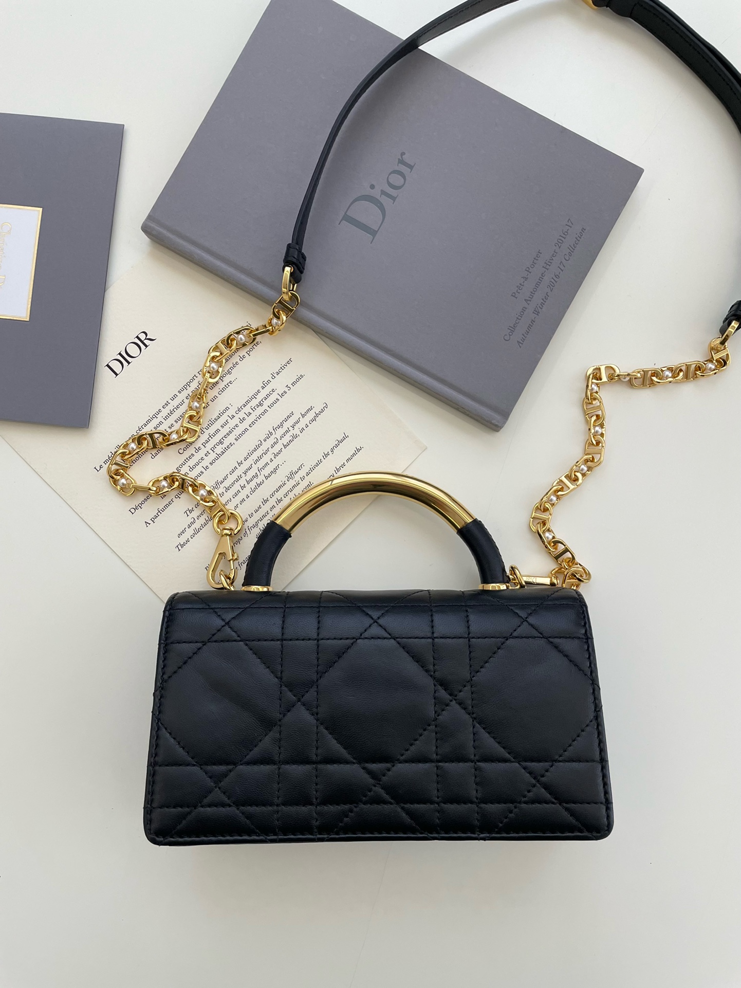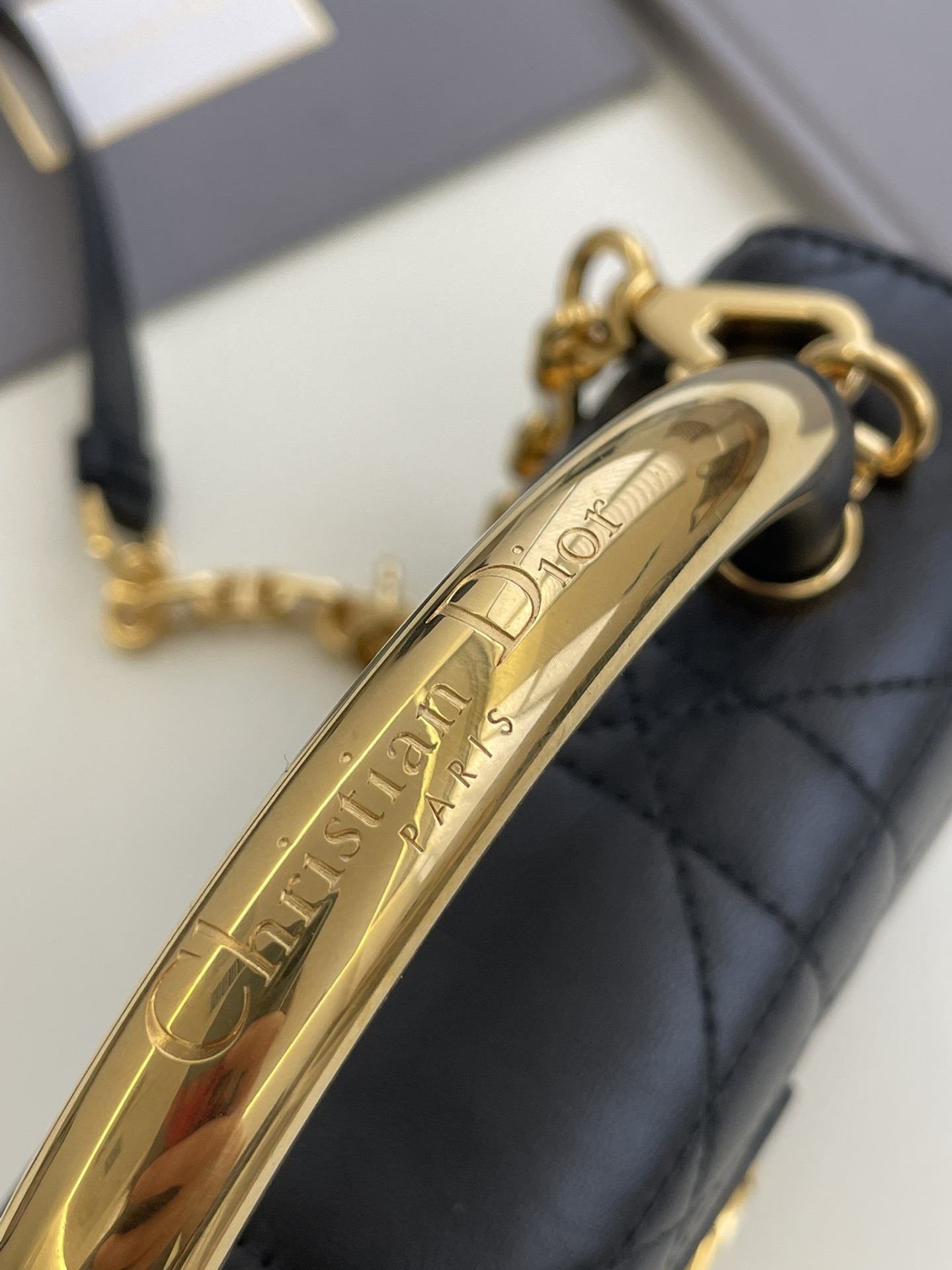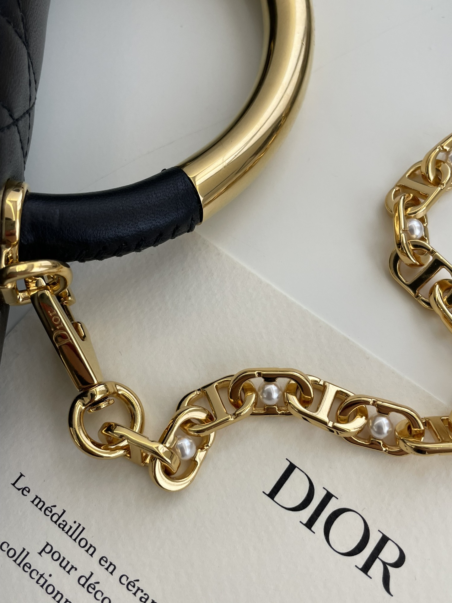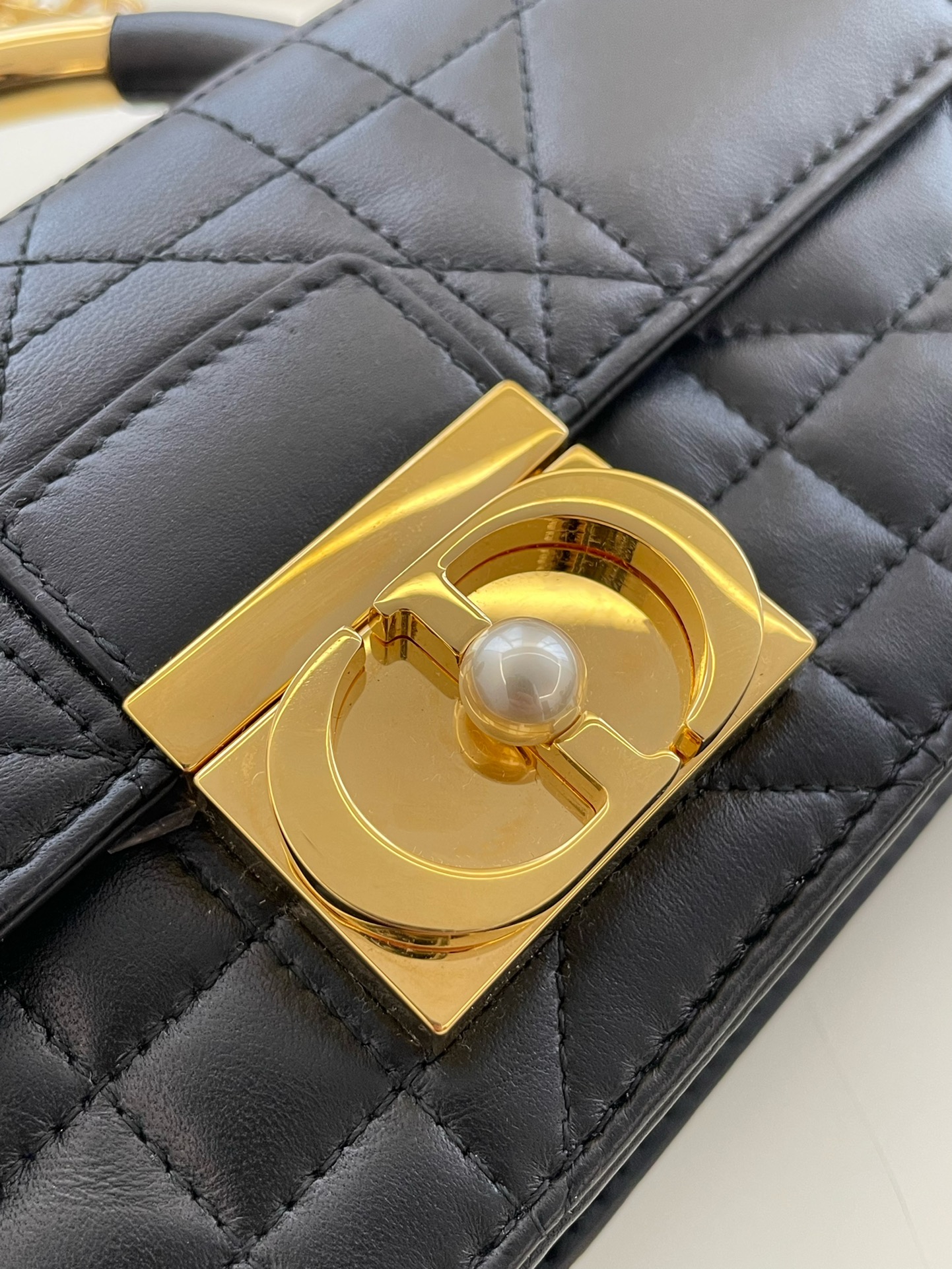 Crafted from imported calfskin, this bag exudes timeless sophistication. Featuring an oversized quilted pattern that is both vintage and chic, it is accented with a gold-tone metal handle engraved with the iconic logo and a delicate pearl clasp for a luxurious touch. The chain shoulder strap is adorned with small pearls, adding subtle elegance. With multiple compartments, this bag is as practical as it is exquisite.