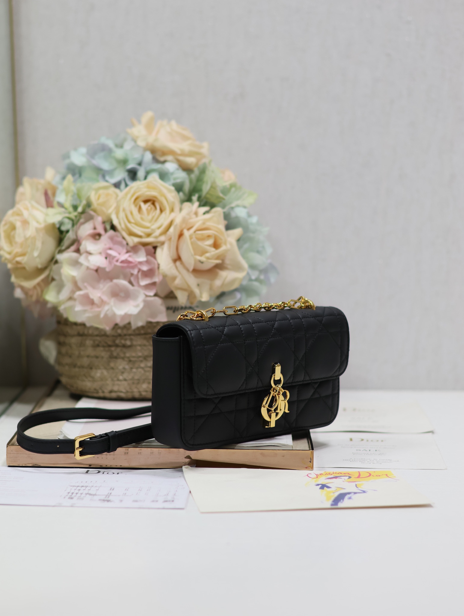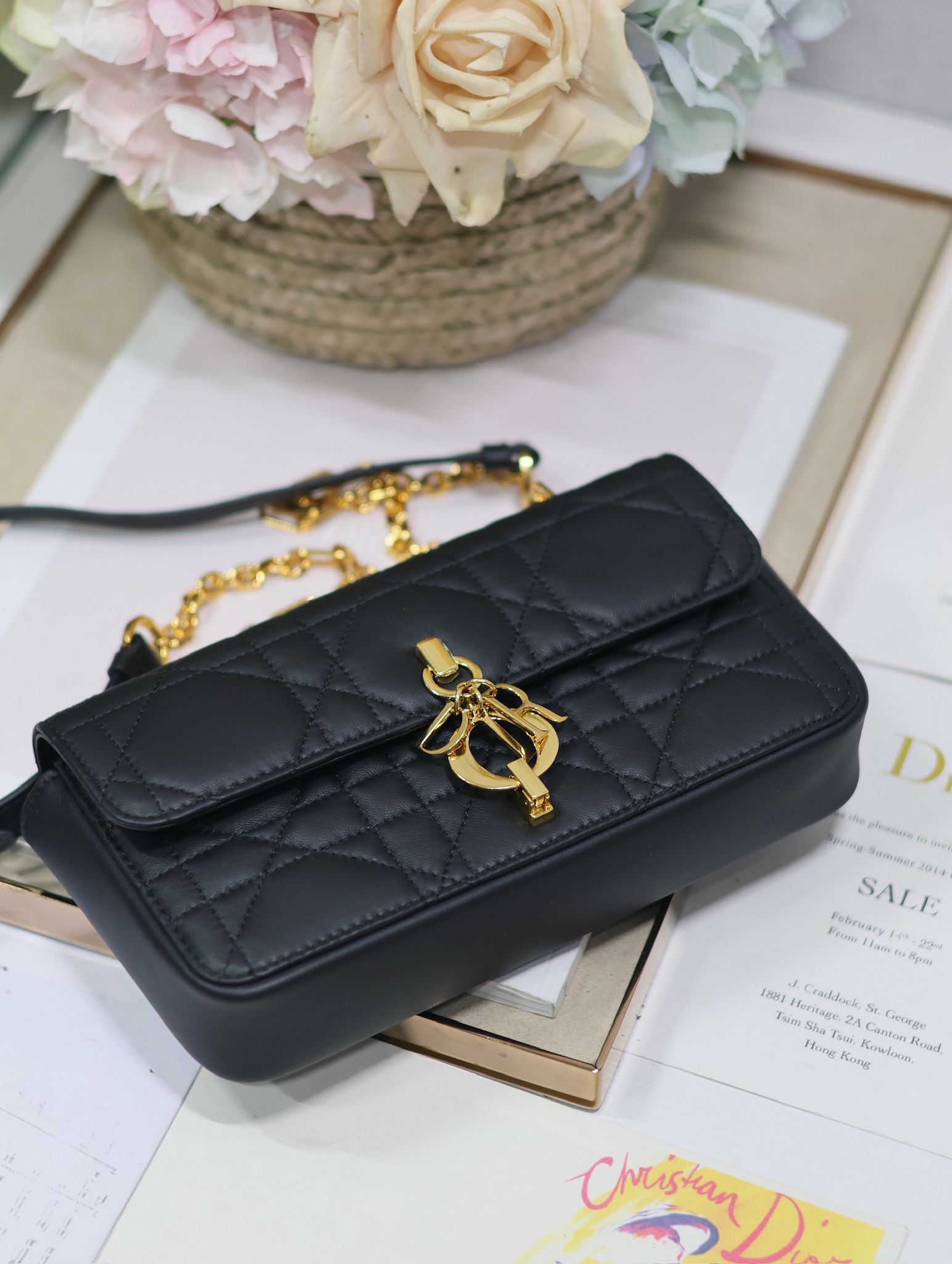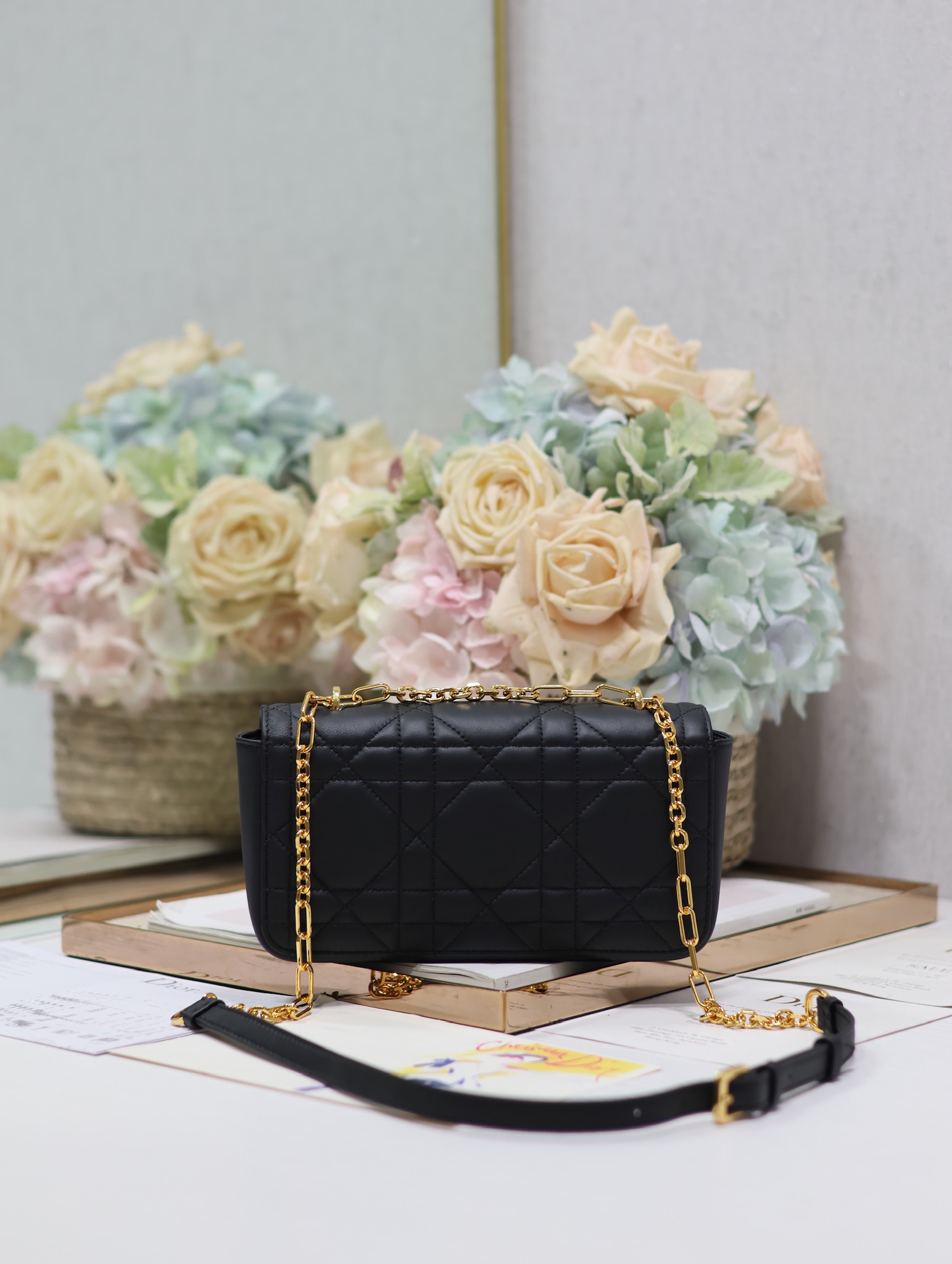 This Miss Daisy mini bag combines elegance with functionality. Carefully crafted from black sheepskin, it is decorated with classic oversized cannage pattern and topstitching to enhance the style. The front flap features a practical D.I.O.R. charm closure. The practical style has a compartment with built-in zip pocket and card slots to store all your daily essentials, making it the ideal companion for day and evening wear. Paired with a chain embellished with leather strap, it can be carried by hand, over the shoulder or cross-body.
