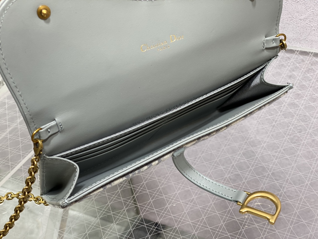The Saddle pouch with chain, crafted in gray Dior Oblique jacquard, is a hybrid creation with a both modern and streamlined design. The accessory has an asymmetrical flap featuring an antique gold-finish metal D stirrup. Thanks to its detachable chain strap, the small pouch may be worn over the shoulder, crossbody or carried by hand.