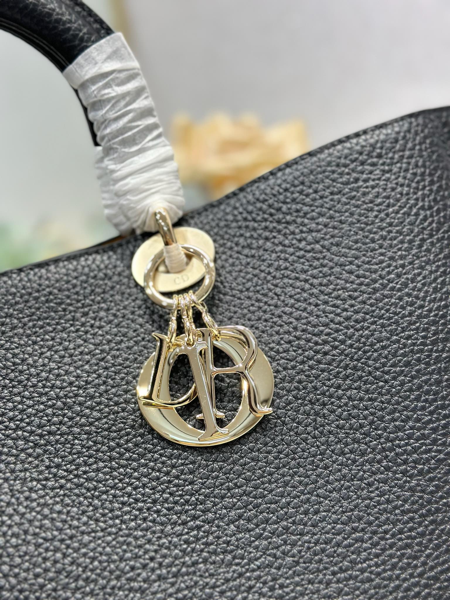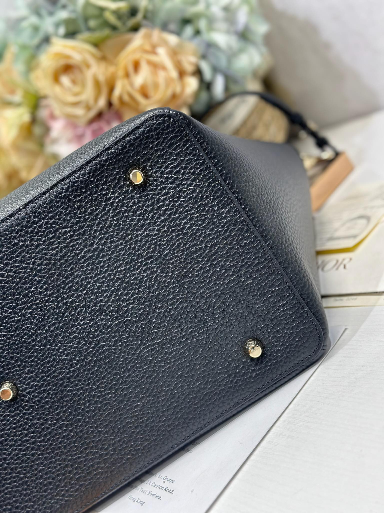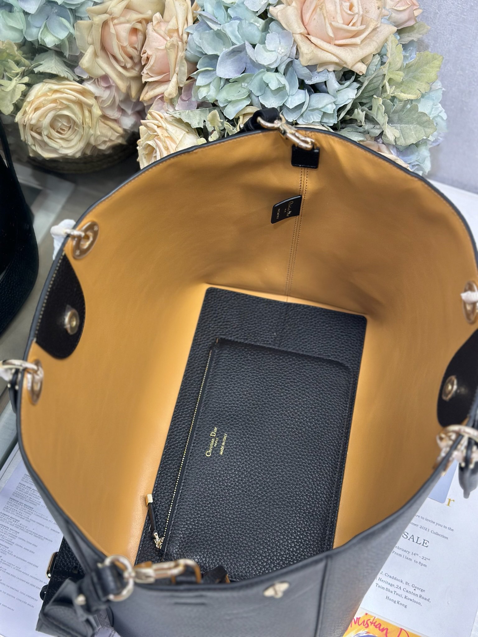 Its spacious interior features a removable pouch for organized storage of daily essentials. The design is completed with a CD Lock twist clasp and side tie closure for a touch of sophistication. The adjustable leather handles allow for easy hand carry, while the DIOR charm adds a signature accent. The bag also comes with a protective dust bag.