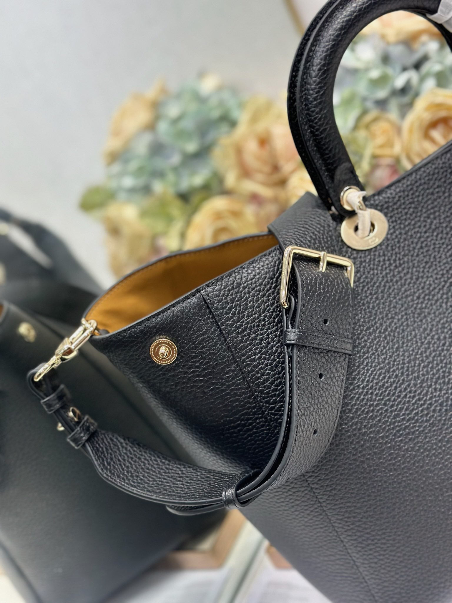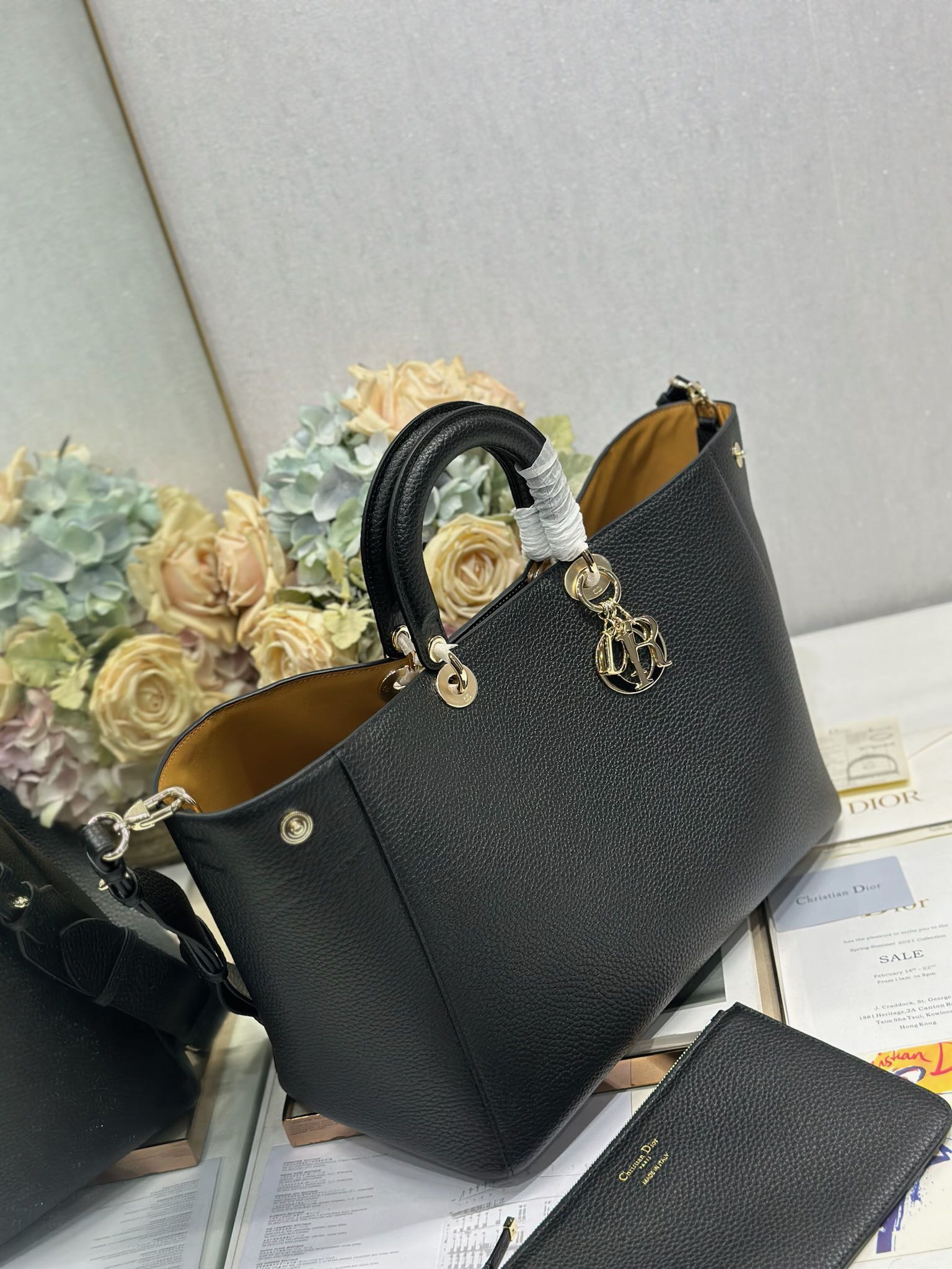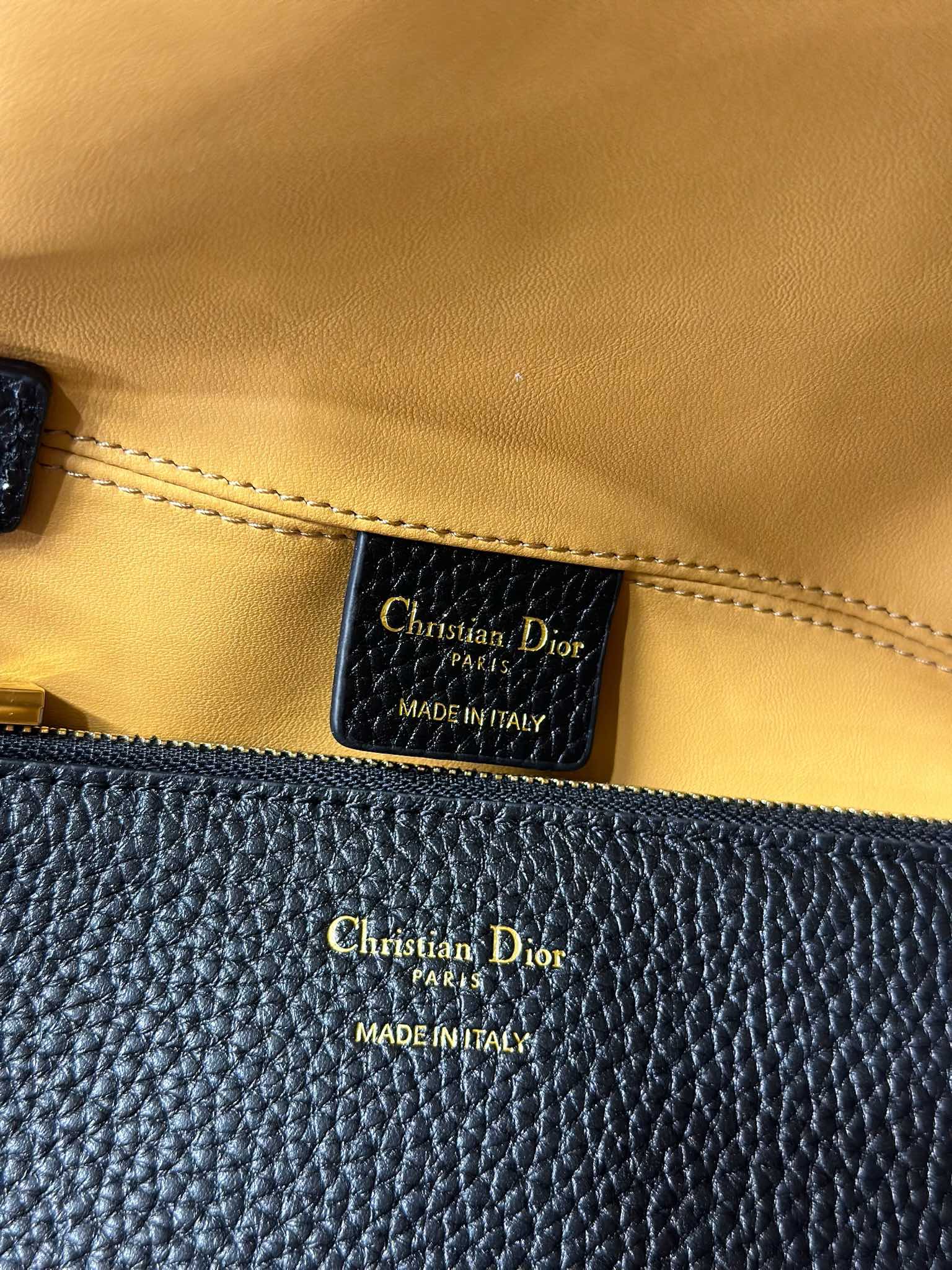 Its spacious interior features a removable pouch for organized storage of daily essentials. The design is completed with a CD Lock twist clasp and side tie closure for a touch of sophistication. The adjustable leather handles allow for easy hand carry, while the DIOR charm adds a signature accent. The bag also comes with a protective dust bag.