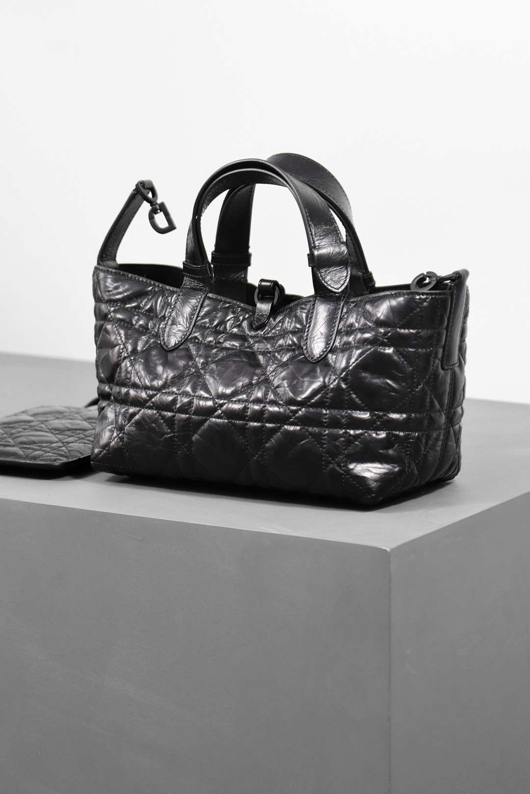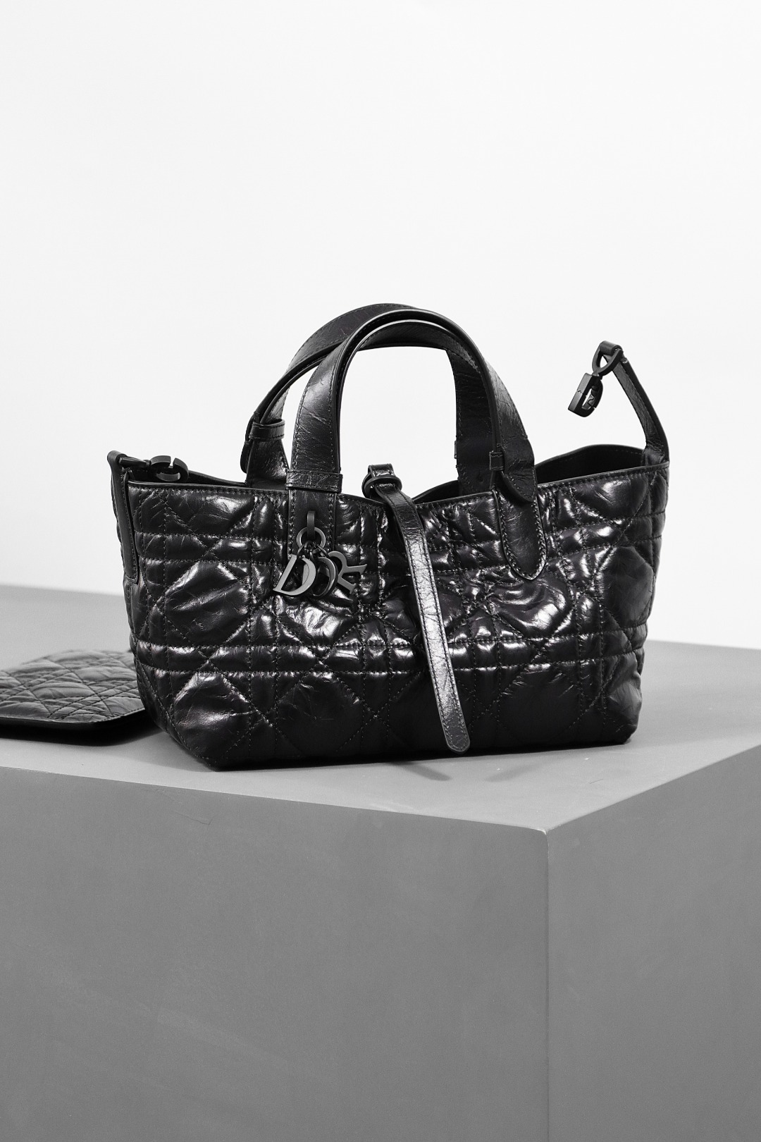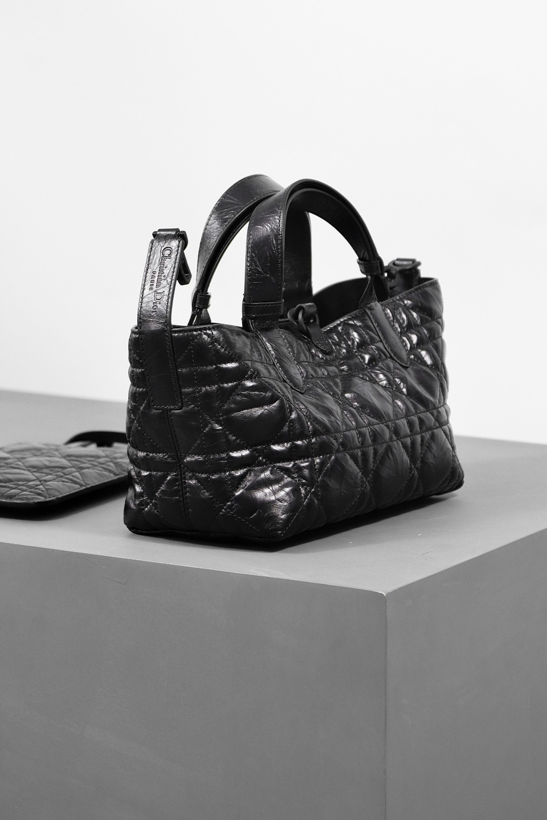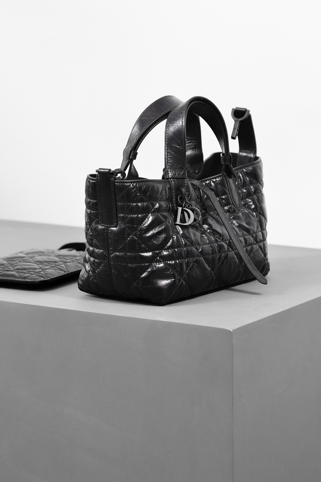 This Dior Toujours bag is both casual and practical with a distinctive design. Crafted from black calfskin leather, it features oversized Cannage topstitching for a bold yet elegant look. The spacious interior includes a small pouch to neatly organize daily essentials. A slim leather tie closure keeps belongings secure, while the CD Lock with a "D" twist clasp allows for adjustable sides, adding a refined touch. This small model is designed with leather top handles featuring adjustable details for easy hand carry.