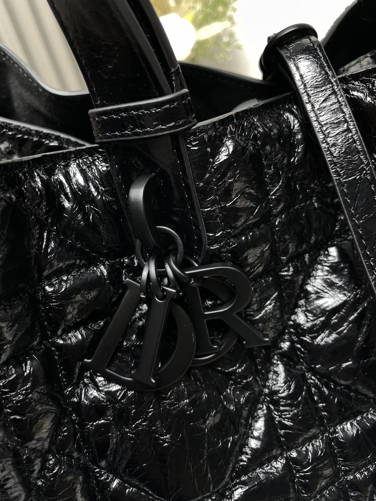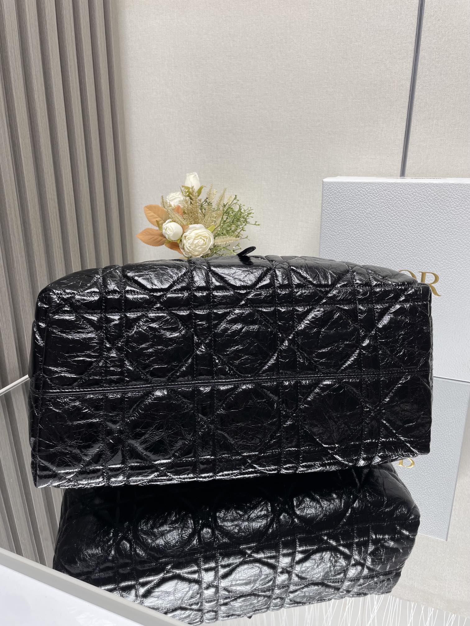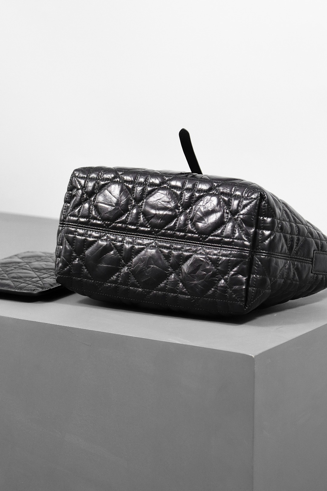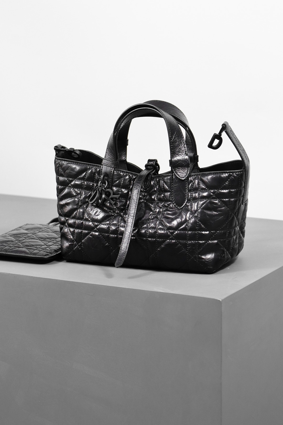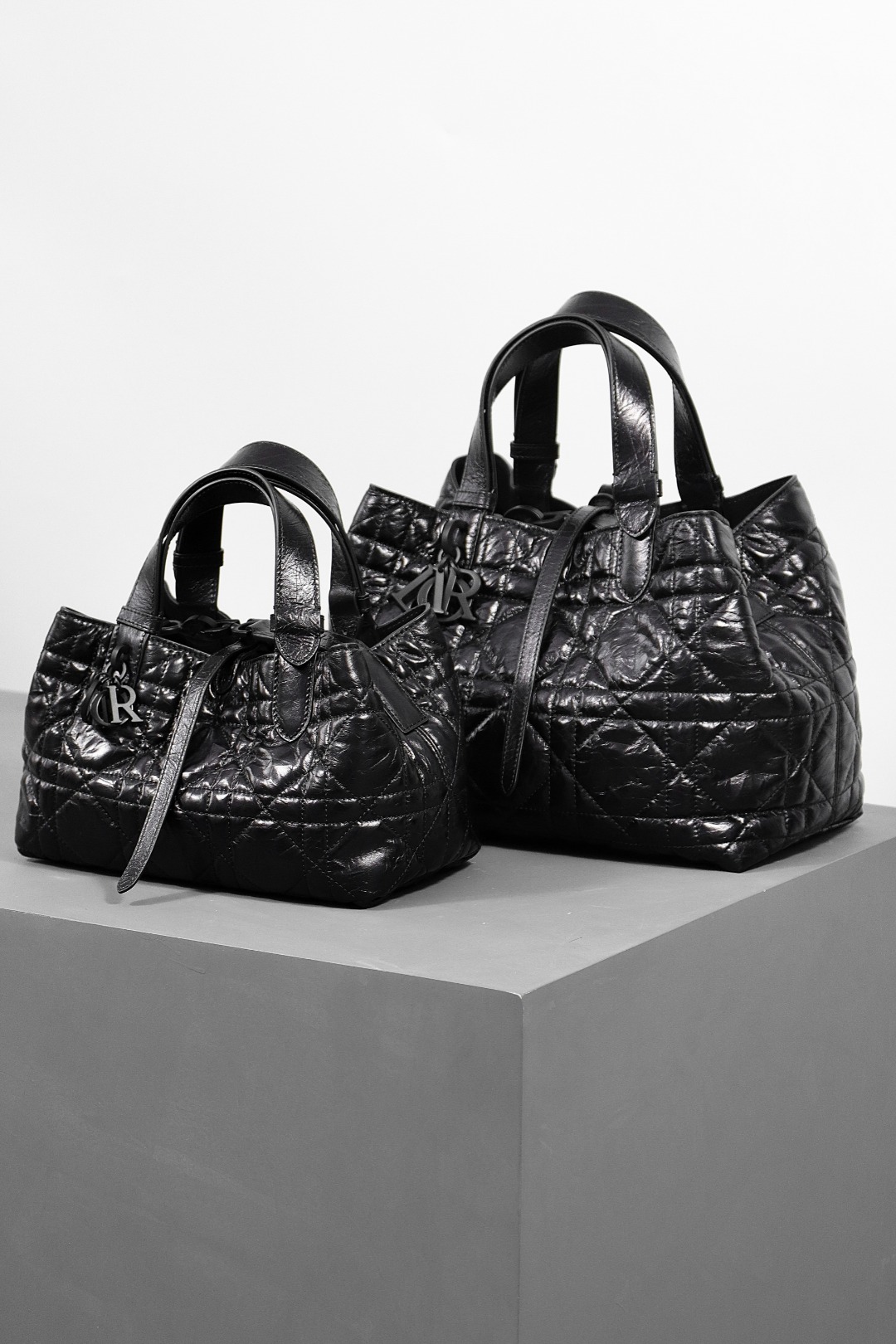 This Dior Toujours bag is both casual and practical with a distinctive design. Crafted from black calfskin leather, it features oversized Cannage topstitching for a bold yet elegant look. The spacious interior includes a small pouch to neatly organize daily essentials. A slim leather tie closure keeps belongings secure, while the CD Lock with a "D" twist clasp allows for adjustable sides, adding a refined touch. This small model is designed with leather top handles featuring adjustable details for easy hand carry.