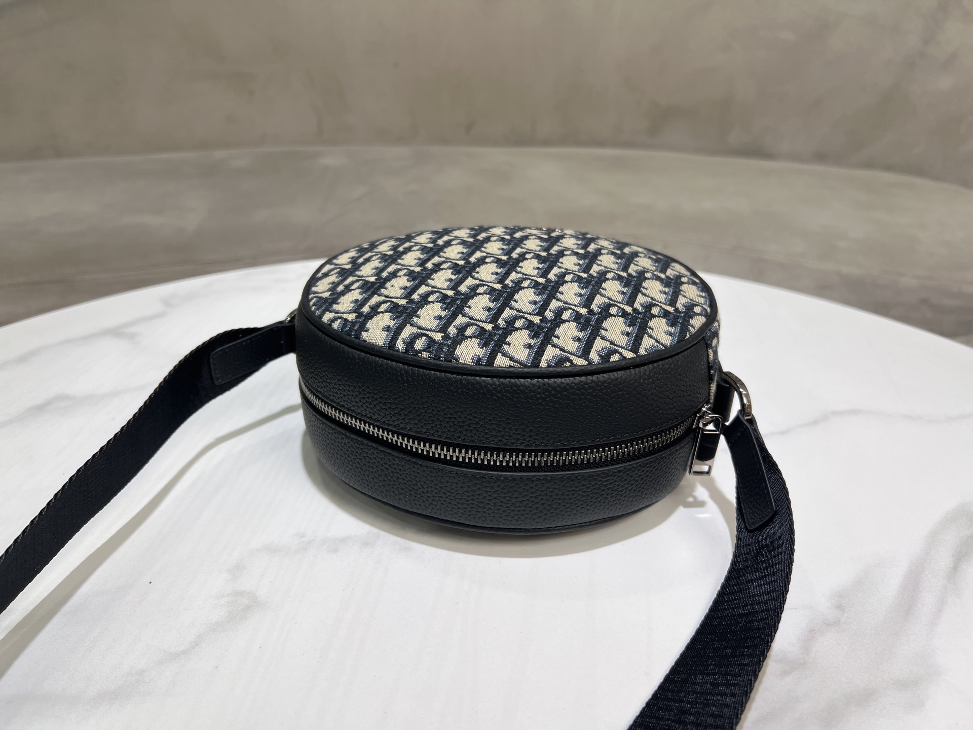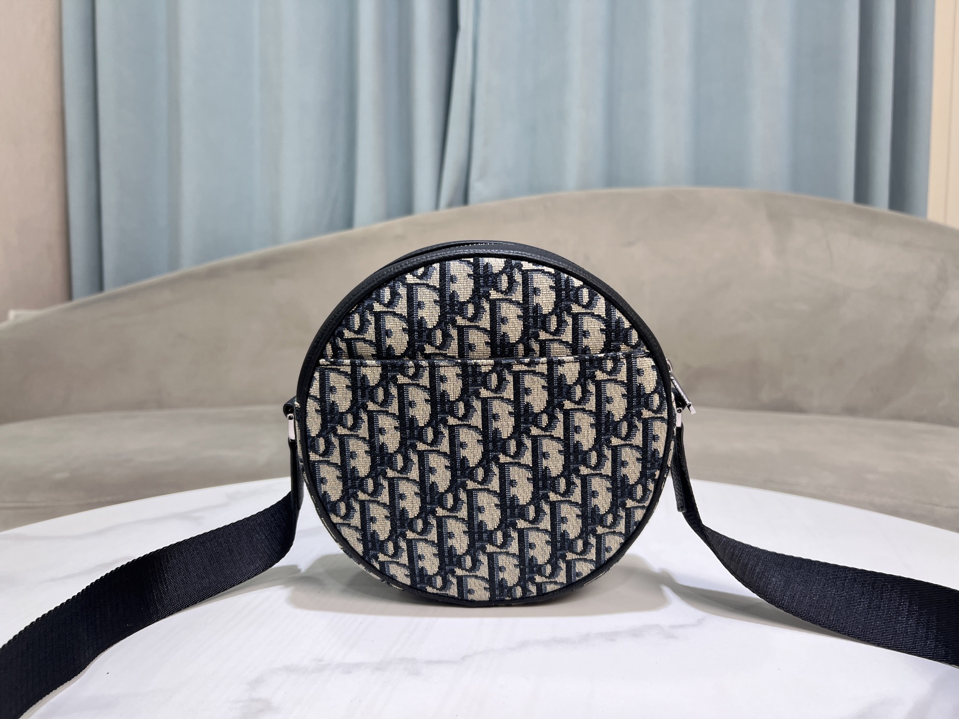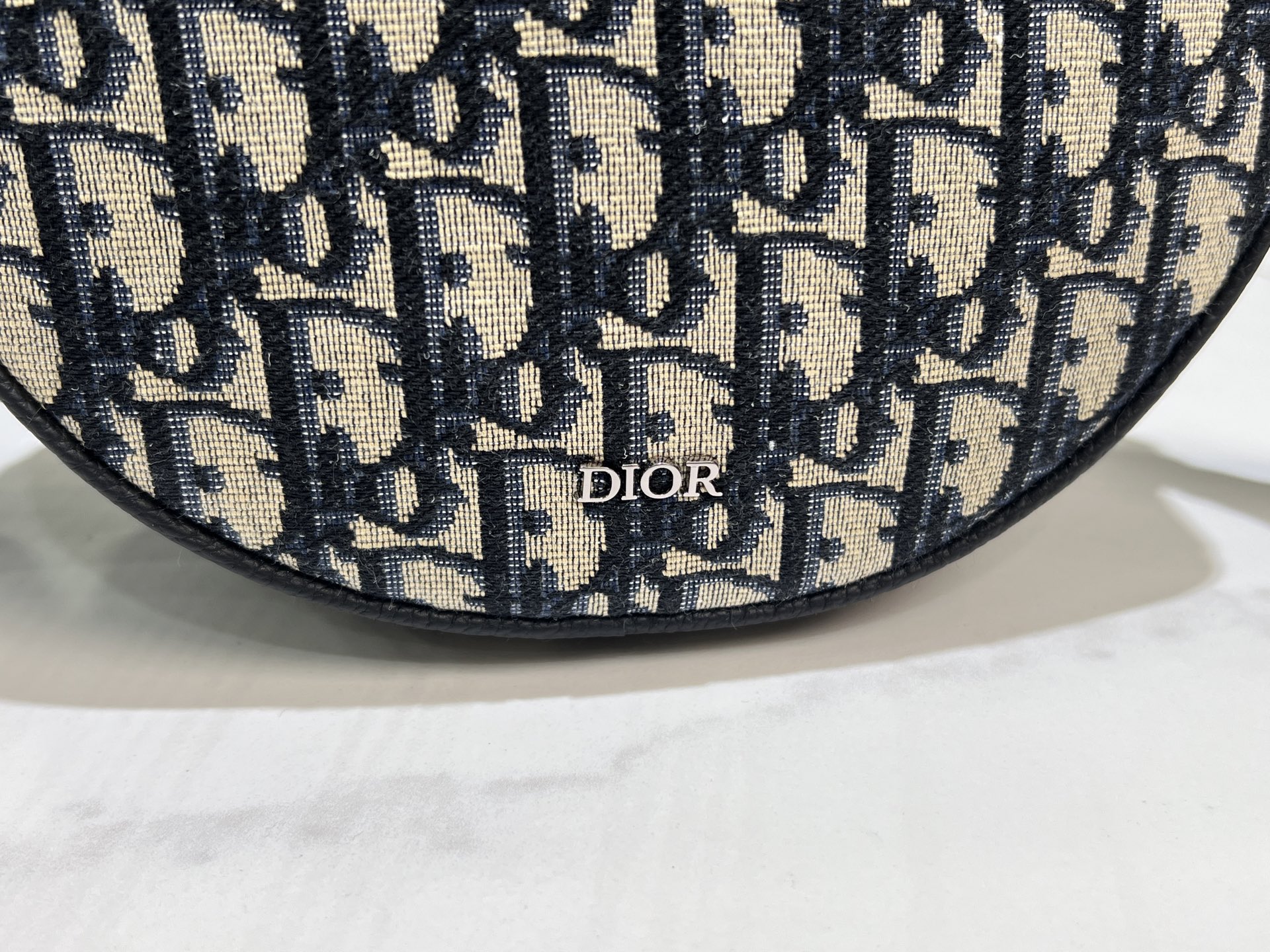Design: Circular silhouette, vintage silver-tone "Dior" plaque, dual exterior pockets (zip + slip)