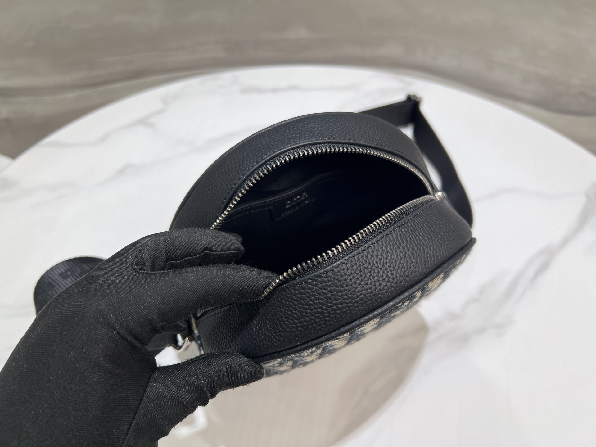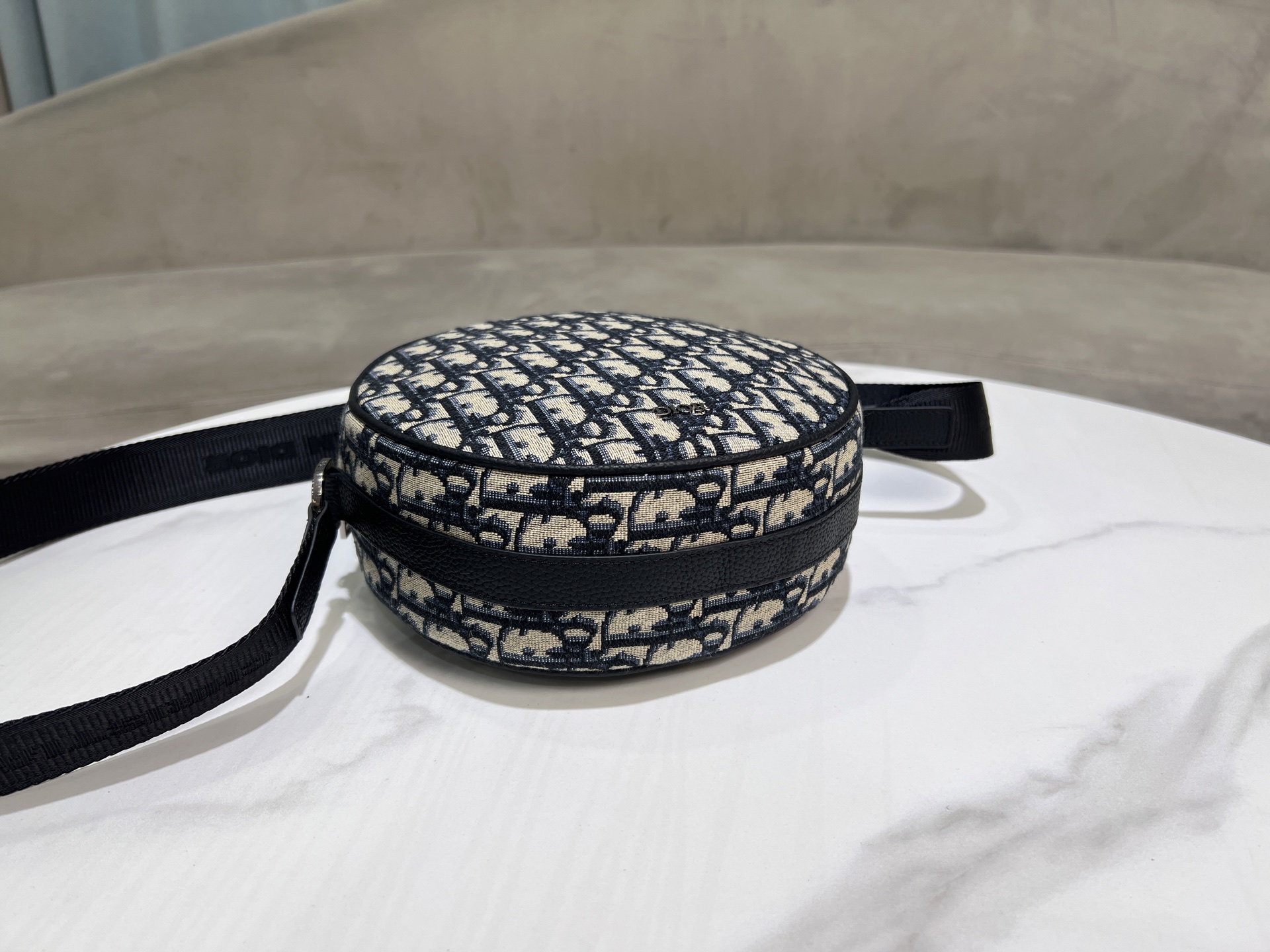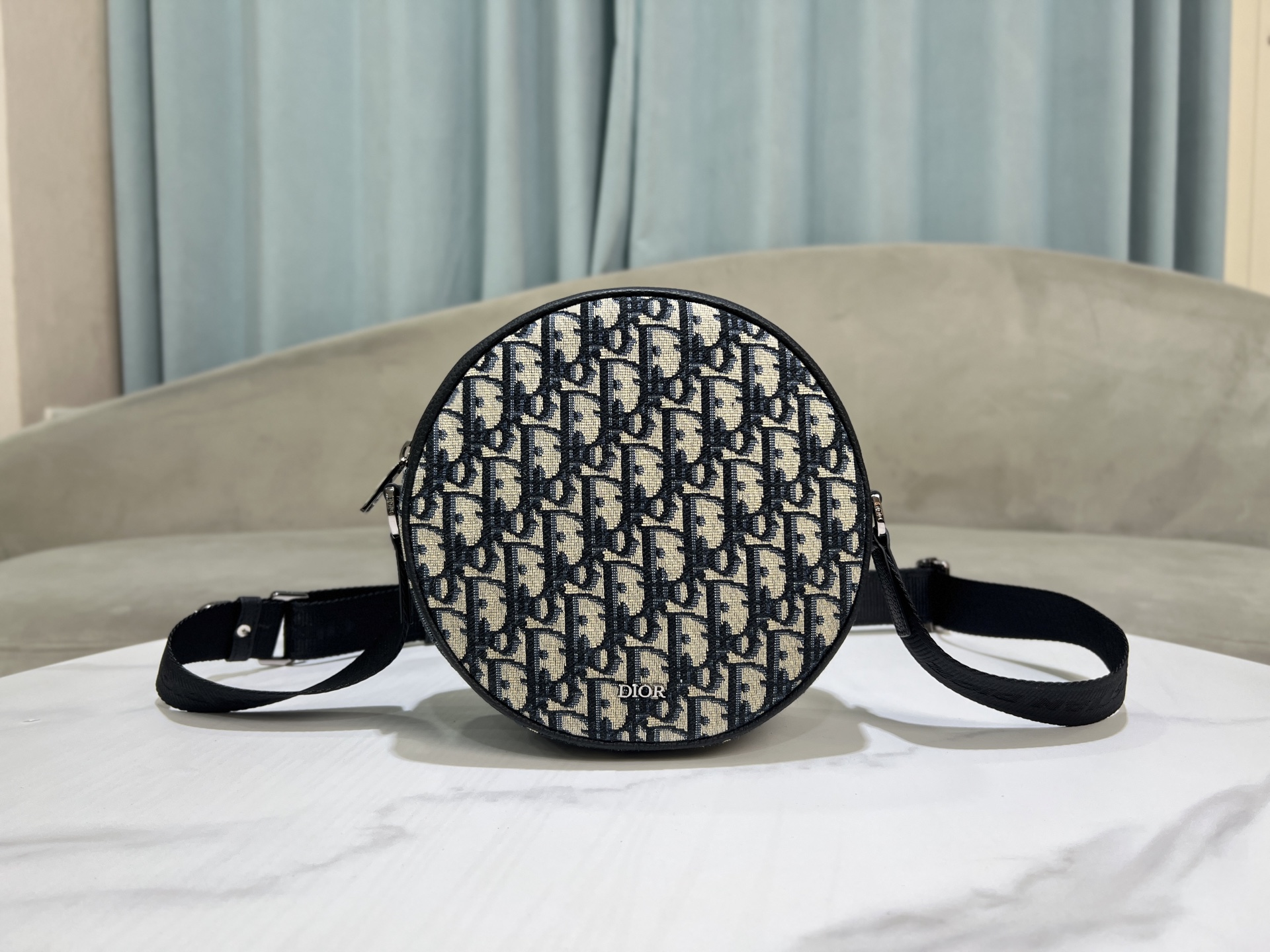 Design: Circular silhouette, vintage silver-tone "Dior" plaque, dual exterior pockets (zip + slip)