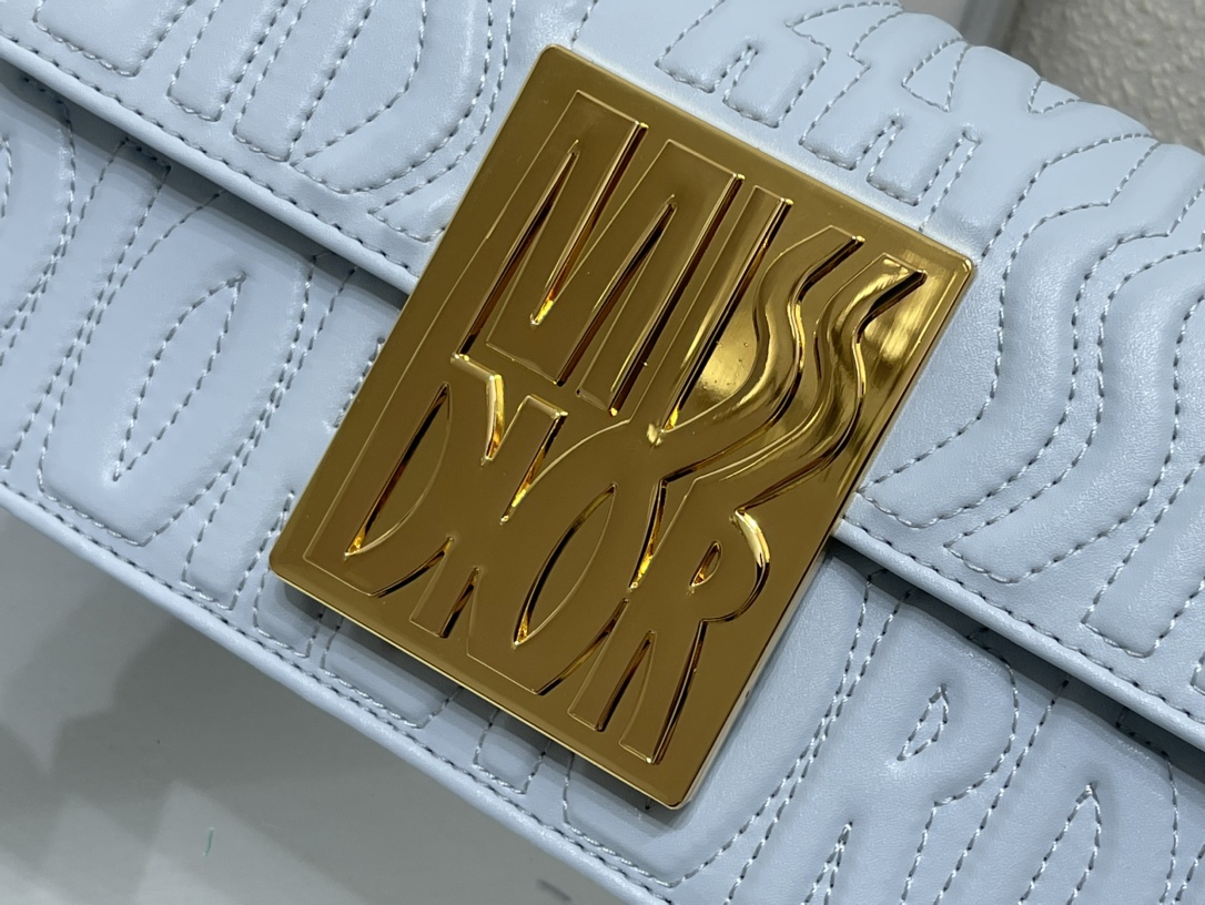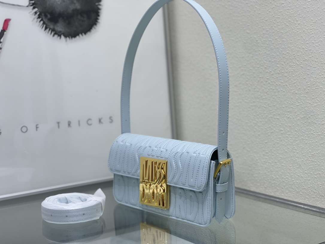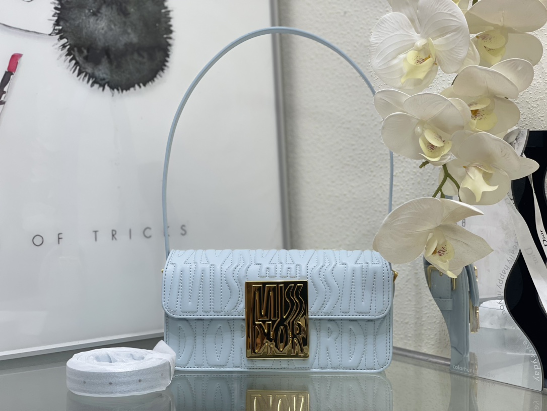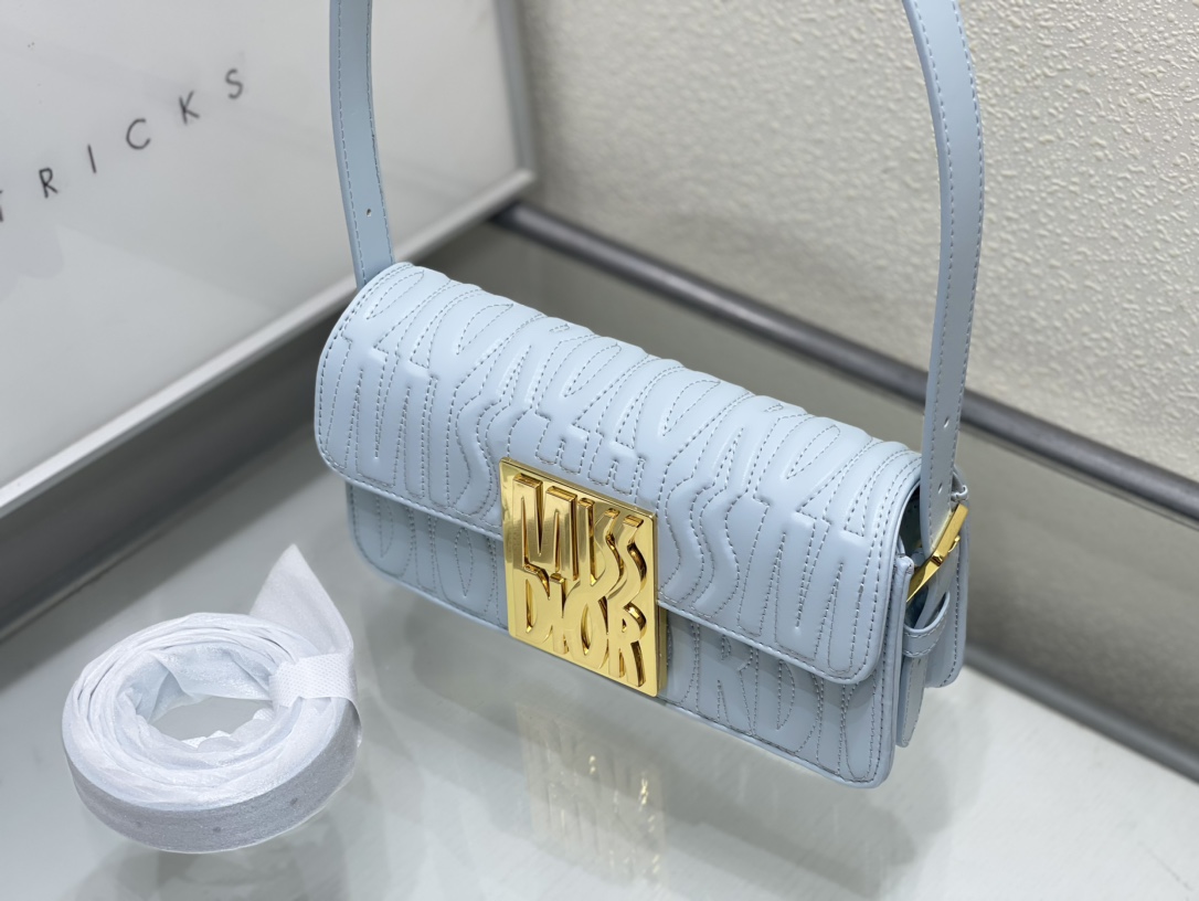 New for Winter 2024, the Miss Dior flap bag redefines House staples of modern elegance. The pale blue quilted calfskin style showcases the collection's hallmark Miss Dior Allover motif, inspired by the Marc Bohan for Dior archives in a modern take on the 1960s. The timeless design is contrasted by a modern plate in antique gold-finish metal with the Miss Dior signature, while the flap reveals a main compartment completed by a zip pocket to accommodate all the essentials. Thanks to the adjustable strap, the bag can be worn over the shoulder for a contemporary and couture look.