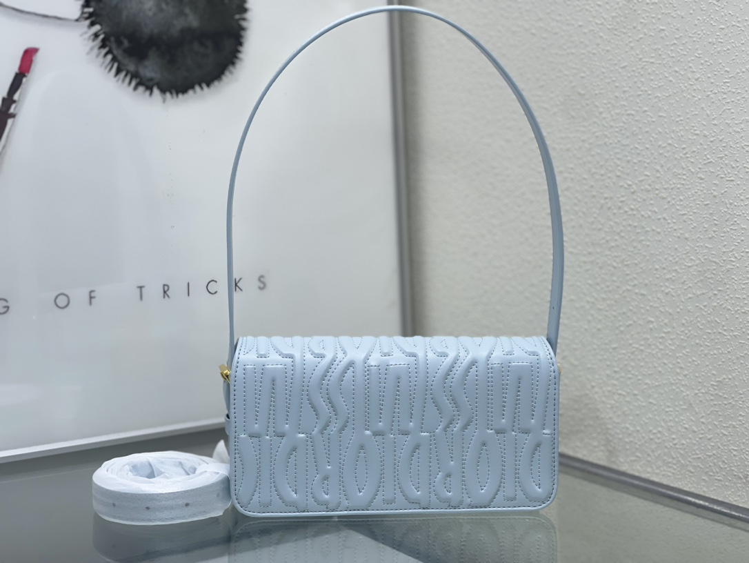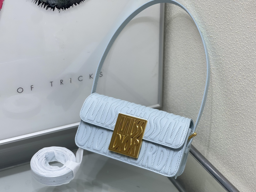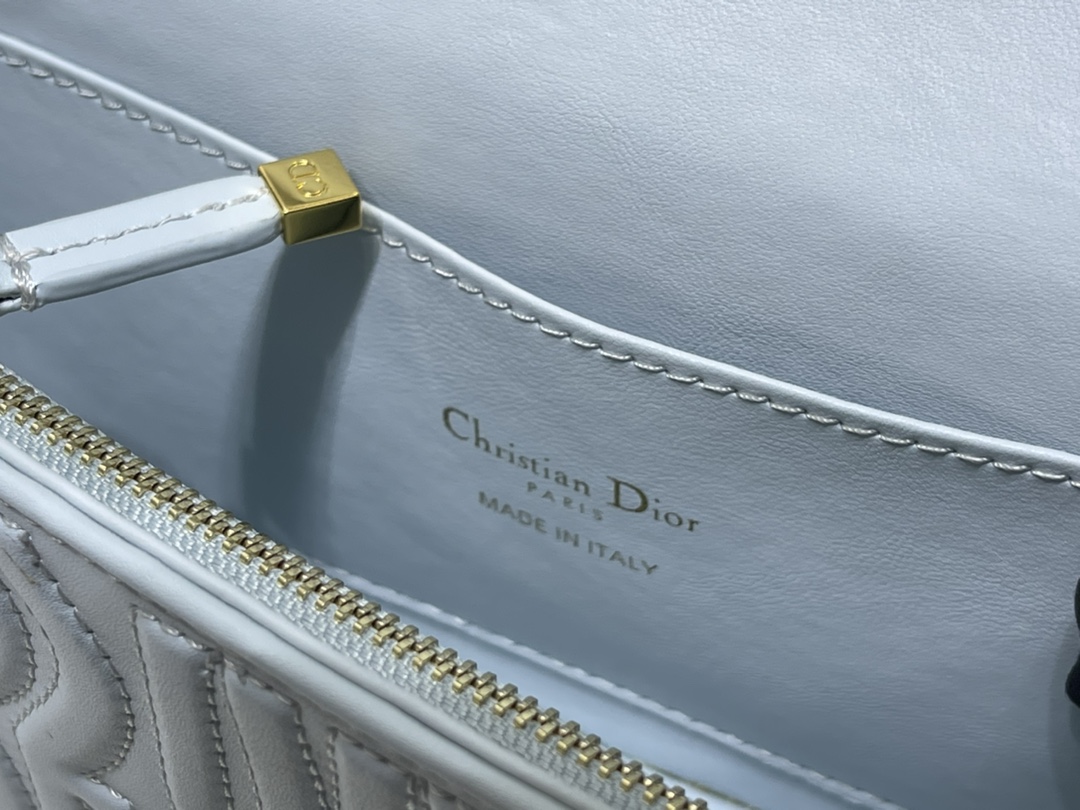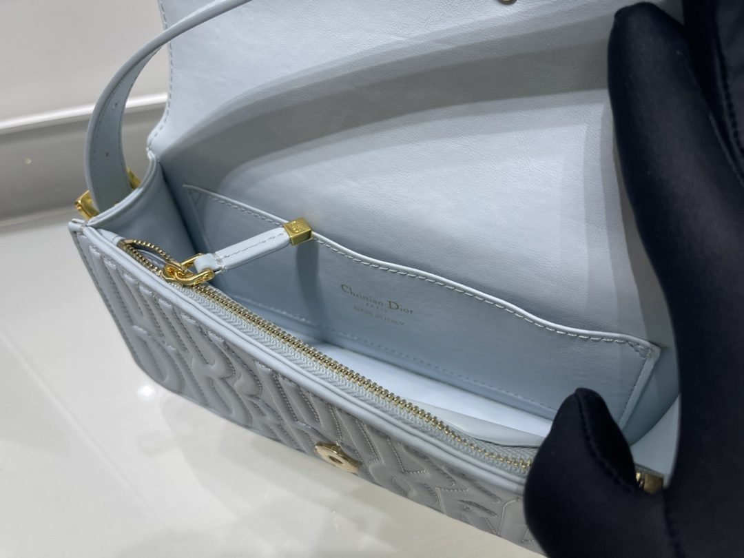 New for Winter 2024, the Miss Dior flap bag redefines House staples of modern elegance. The pale blue quilted calfskin style showcases the collection's hallmark Miss Dior Allover motif, inspired by the Marc Bohan for Dior archives in a modern take on the 1960s. The timeless design is contrasted by a modern plate in antique gold-finish metal with the Miss Dior signature, while the flap reveals a main compartment completed by a zip pocket to accommodate all the essentials. Thanks to the adjustable strap, the bag can be worn over the shoulder for a contemporary and couture look.