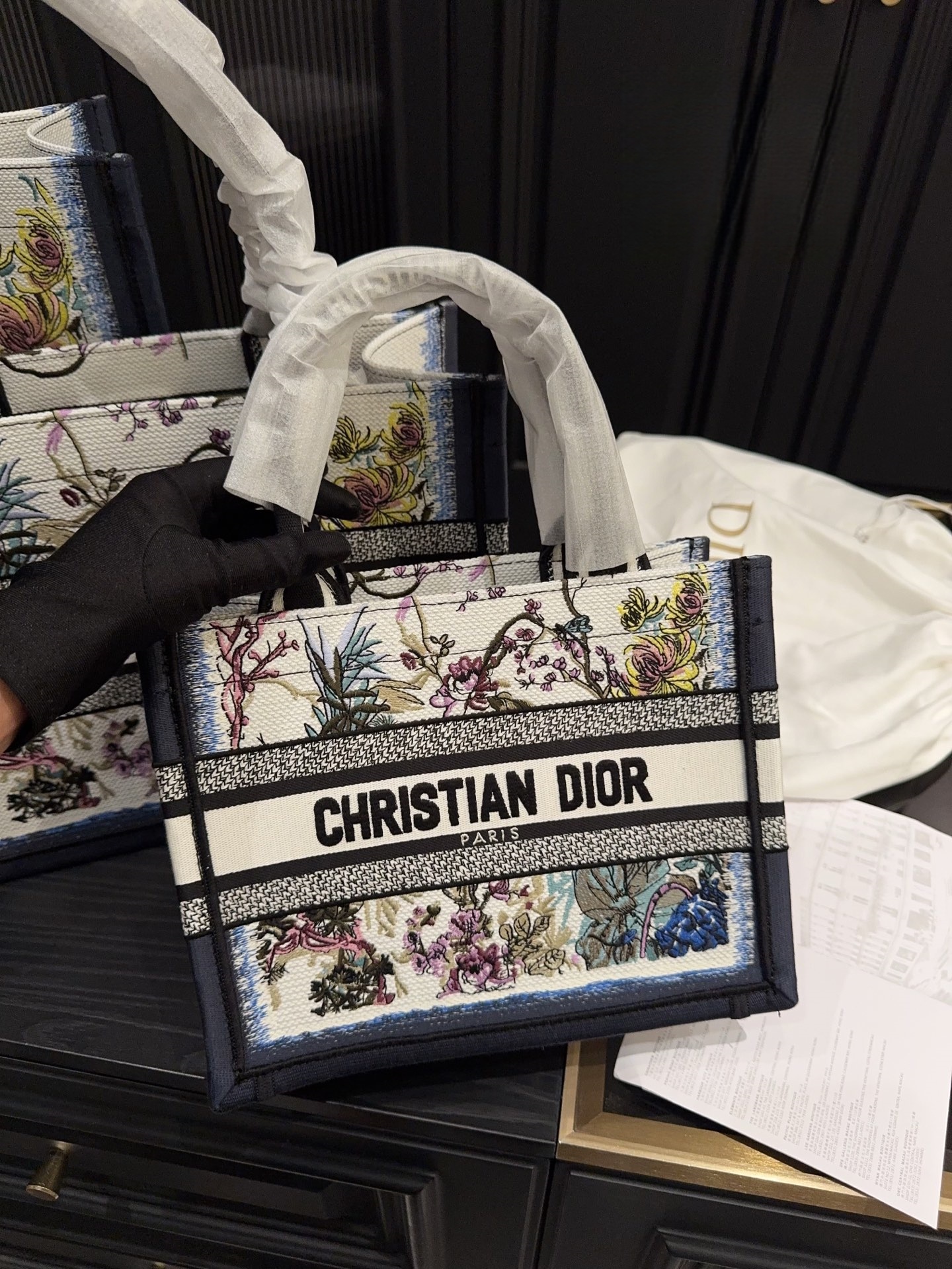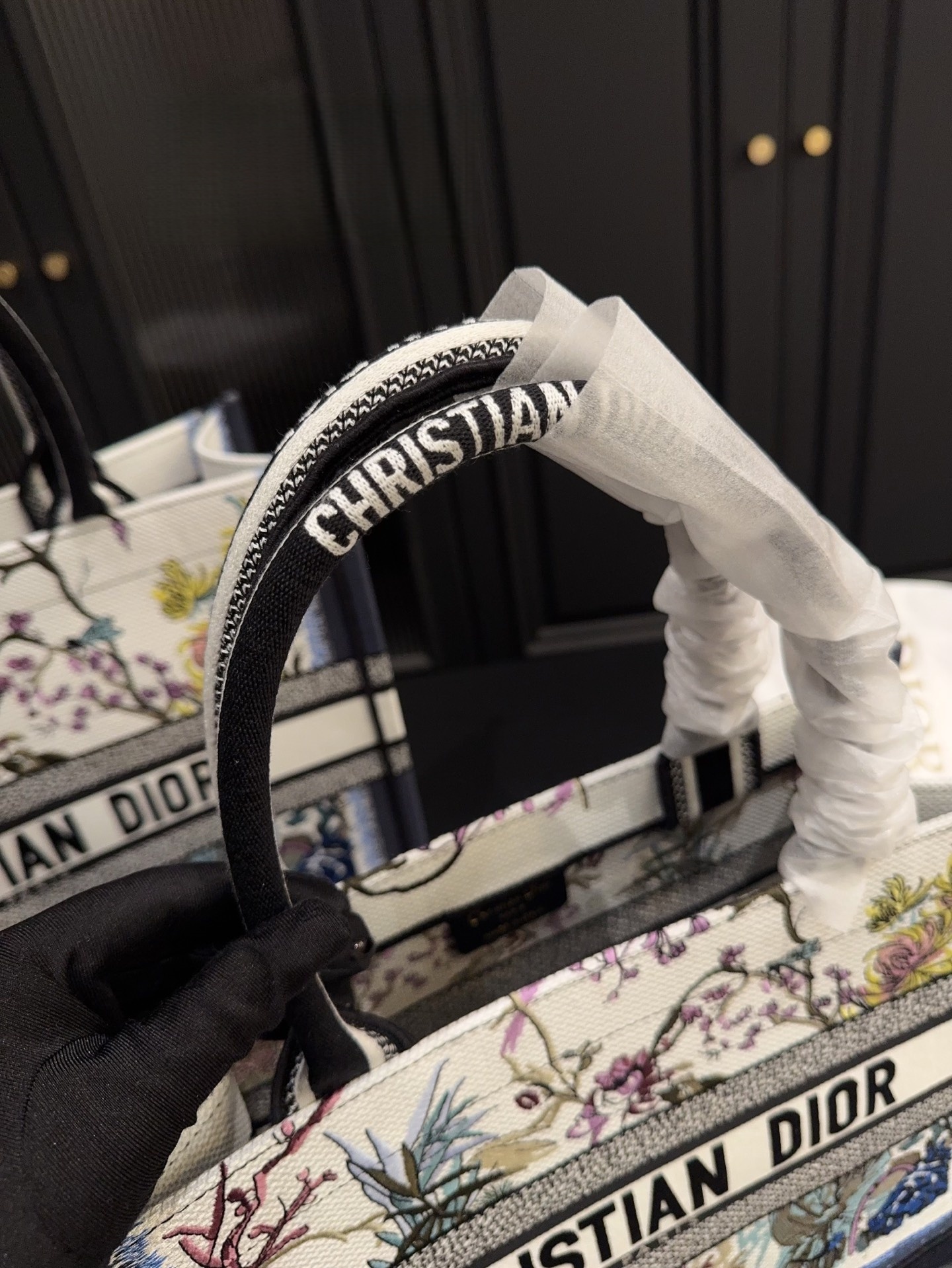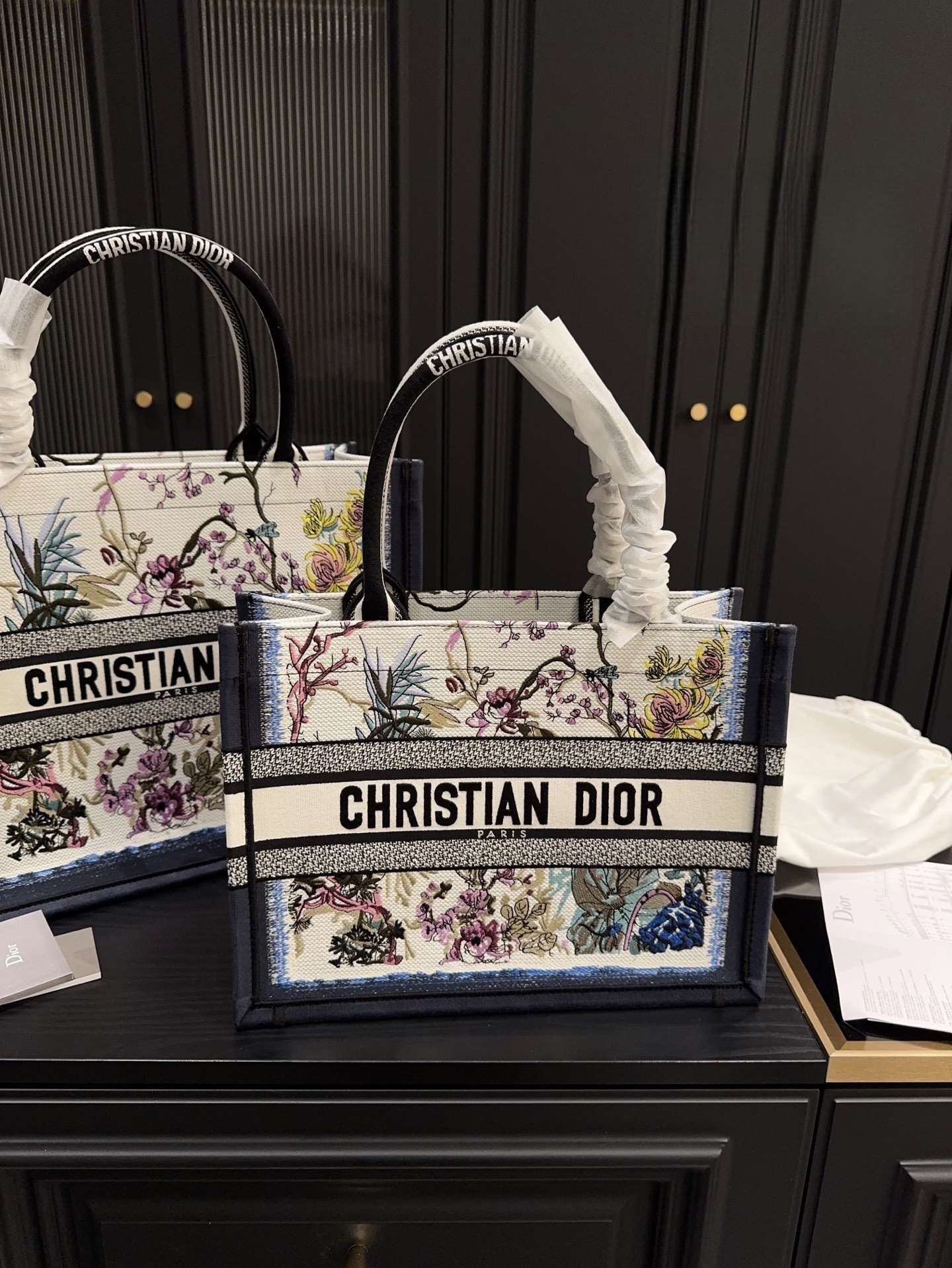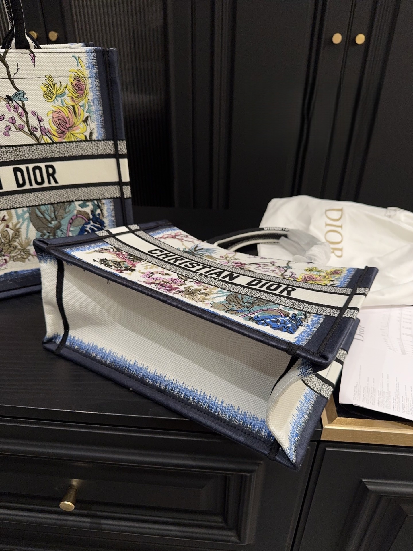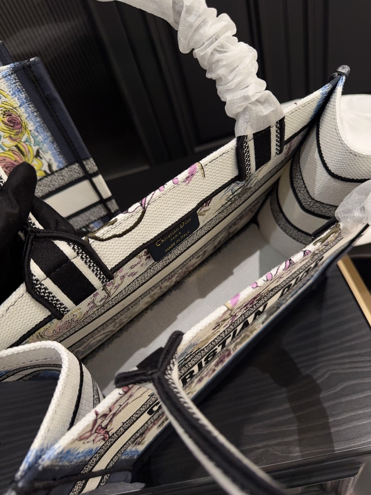 This Dior tote is impressively spacious. Featuring printed floral patterns with a refined embossed three-dimensional design, the exquisite embroidery exudes elegance and sophistication. Its stunning appearance makes it truly unforgettable at first glance—easily one of the most beautiful totes out there!